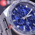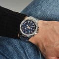 Синий циферблат с миниатюрными счётчиками хронографаХронографФункция позволяет измерять отрезки времени с особой точностью: часы, минуты, секунды. Верным признаком хронографа является наличие на циферблате 3 дополнительных окошек-счётчиков., напоминающий рулевой механизм, дополнен золотистыми цветовыми акцентами, массивный корпус из нержавеющей стали 316L стильно смотрится на мужском запястье. Часы оснащены высокоточным кварцевым механизмом, батарейка рассчитана на 3 года эксплуатации. Люминесцентная подсветкаЛюминесцентное покрытиеПозволяет считывать показания времени в темноте. Производители наносят на стрелки, часовые индексы, безель или поверхность циферблата светонакопительный состав, дающий холодное свечение. стрелок. Водостойкость до 100 метров. Надёжное минеральное стекло. Завинчивающаяся задняя крышка. Стальной браслет с безопасной предохранительной застёжкой. Секундомер, отображение даты. Габариты: 52 x 48,9 x 12,4 мм.