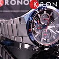 Кварцевый хронограф. Солнечная батарея. Индикатор заряда батареи. Стрелки и метки с люминесцентным покрытием. Водостойкость WR 100. Часы, минуты, секунды, дата, хронограф, 12/24х часовой формат времени. Корпус выполнен из нержавеющей стали с частичным IP покрытием. Размеры корпуса 50 мм х 47.5 мм, толщина 12.7 мм. Сапфировое стекло. Браслет выполнен из нержавеющей стали.