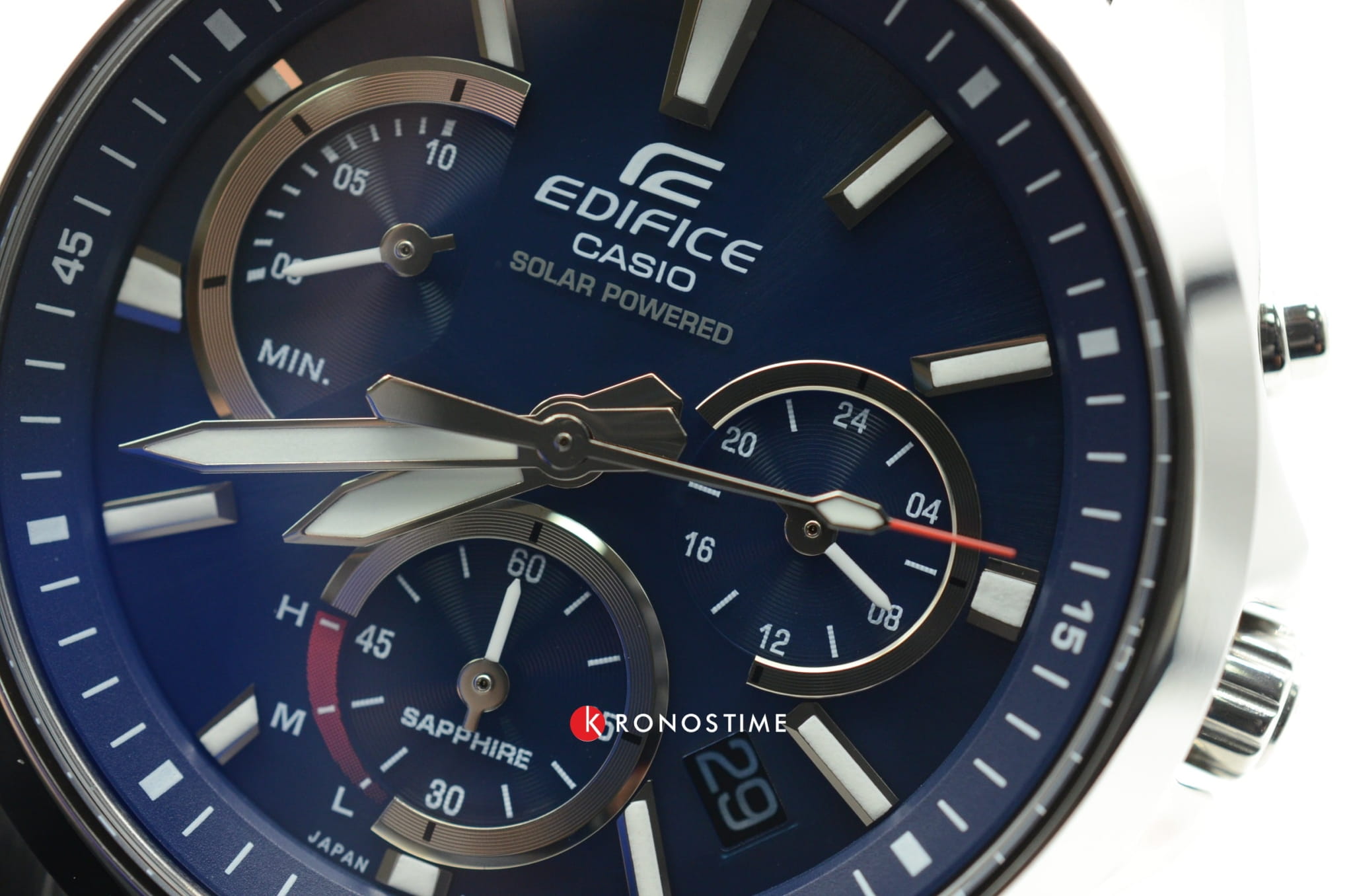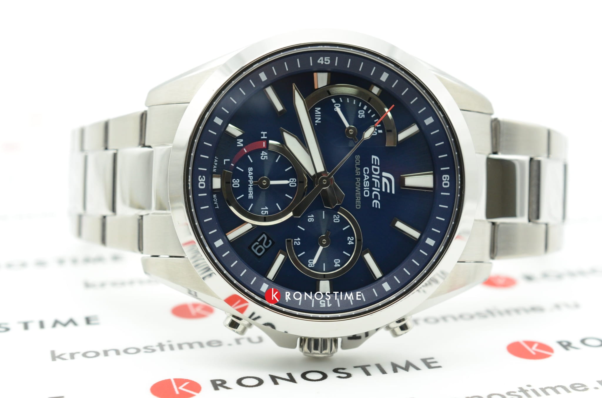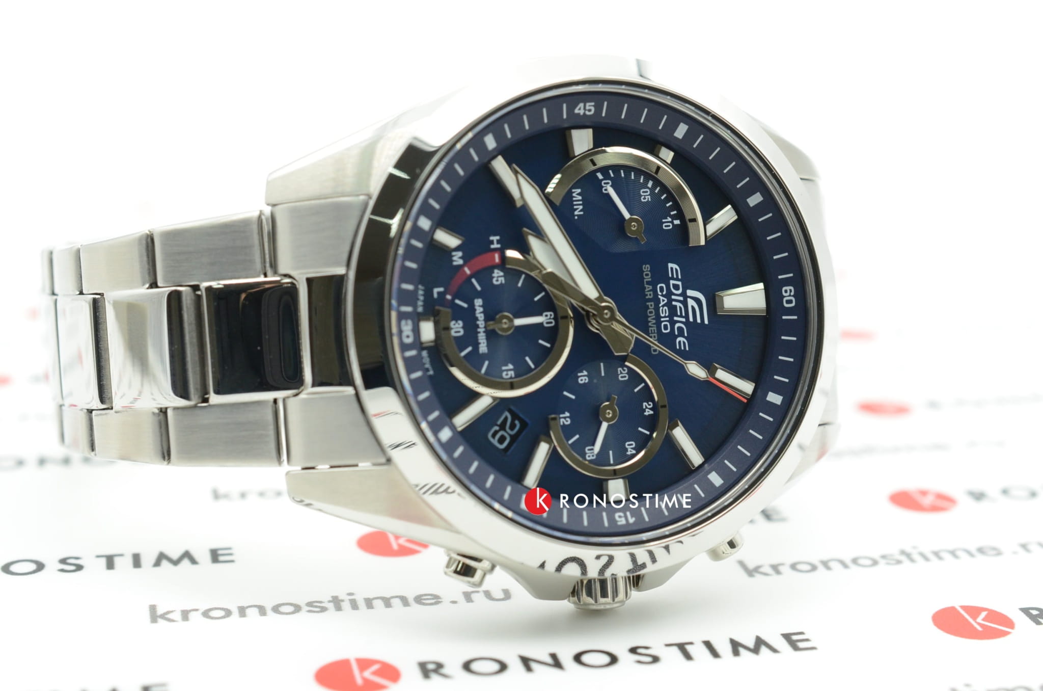 Синий циферблат с оригинальным размещением счётчиков имеет красные акценты, такой спортивный дизайн будет актуален в любой ситуации. Это наручные часы на солнечной батарее, основанные на технологии . Они дополнены браслетом из нержавеющей стали 316L с предохранительной застёжкой, обеспечивающей надёжную фиксацию на запястье. Кварцевый механизм с точностью хода -/+15 секунд в месяц. Сапфировое стекло. Люминесцентная подсветкаЛюминесцентное покрытиеПозволяет считывать показания времени в темноте. Производители наносят на стрелки, часовые индексы, безель или поверхность циферблата светонакопительный состав, дающий холодное свечение. стрелок. Апертура даты, функция хронографаХронографФункция позволяет измерять отрезки времени с особой точностью: часы, минуты, секунды. Верным признаком хронографа является наличие на циферблате 3 дополнительных окошек-счётчиков.. Габариты: 49,5 x 44,2 x 11,6 мм.