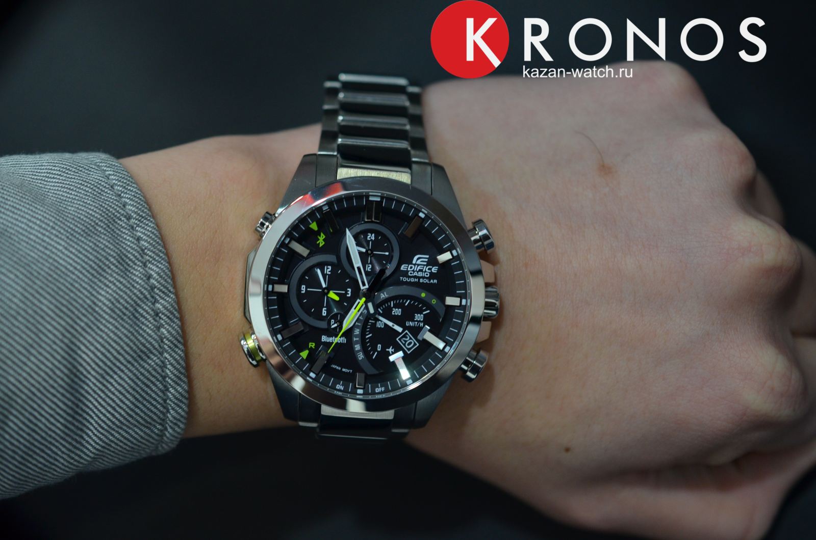 Общее исполнение аксессуара выдержано в автомобильной стилистике, тёмный циферблат отличается оригинальным расположением счётчиков. Наручные часы оснащены технологией BluetoothBluetoothСовременная технология, позволяющая синхронизировать часы с телефоном и переносить данные. Часы с Bluetooth расширяют возможности вашего смартфона и делают его использование ещё более удобным. с низким потреблением энергии, позволяющей часам считывать информацию с интернет-сервера точного времени и обеспечивать абсолютную точность времени. Питание происходит за счёт солнечной батареи - . Водонепроницаемость 100 метров. Минеральное стекло. Люминесцентная подсветкаЛюминесцентное покрытиеПозволяет считывать показания времени в темноте. Производители наносят на стрелки, часовые индексы, безель или поверхность циферблата светонакопительный состав, дающий холодное свечение.. Надёжный стальной браслет. Наличие авиарежима. Функции: уведомление о полученных сообщениях по электронной почте, поиск телефона, отображение числа и дня недели, секундомер, будильник, расчёт средней скорости пройденного маршрута. Габариты: 52 x 48,1 x 14,2 мм.