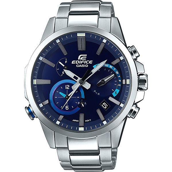 Современные, функциональные наручные кварцевые мужские часы. Круглый корпус выполнены из высокопрочной стали. Синий фон циферблата и стальные элементы дизайна. Водонепроницаемость часов составляет 10 ATM. Сферическое минеральное стекло, устойчивое к появлению царапин. Браслет из прочной нержавеющей стали надежный, прочный и элегантный. Bluetooth, солнечная батарейка, неоновый дисплей, функция мирового времени,  функция секундомера, автоматический календарь.