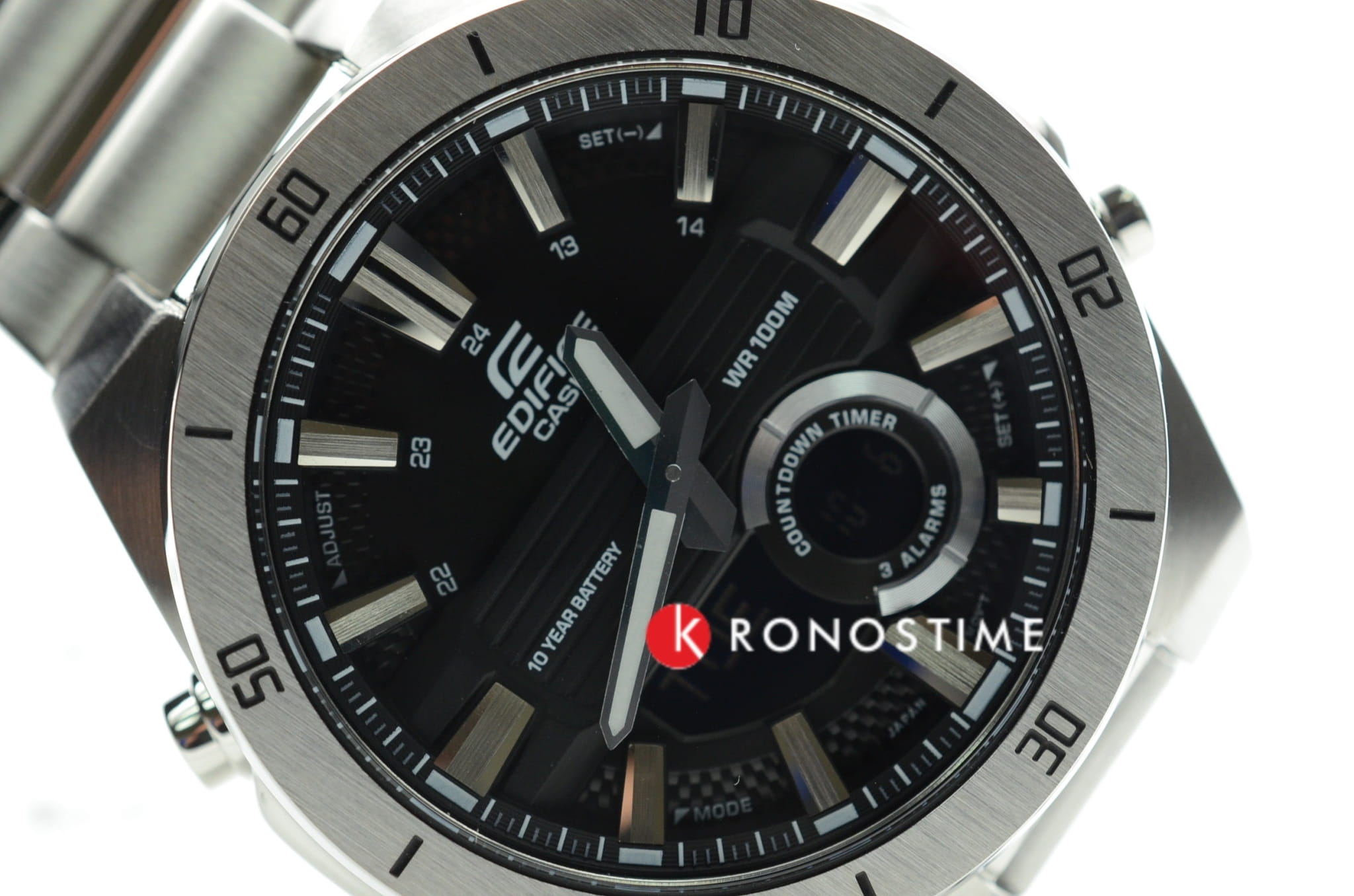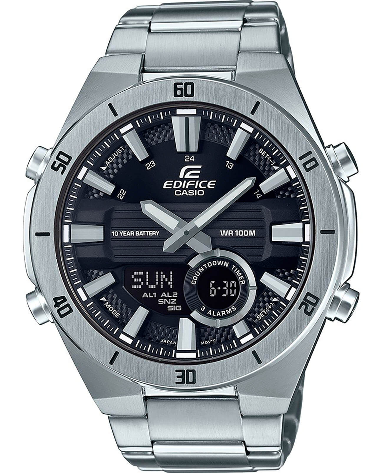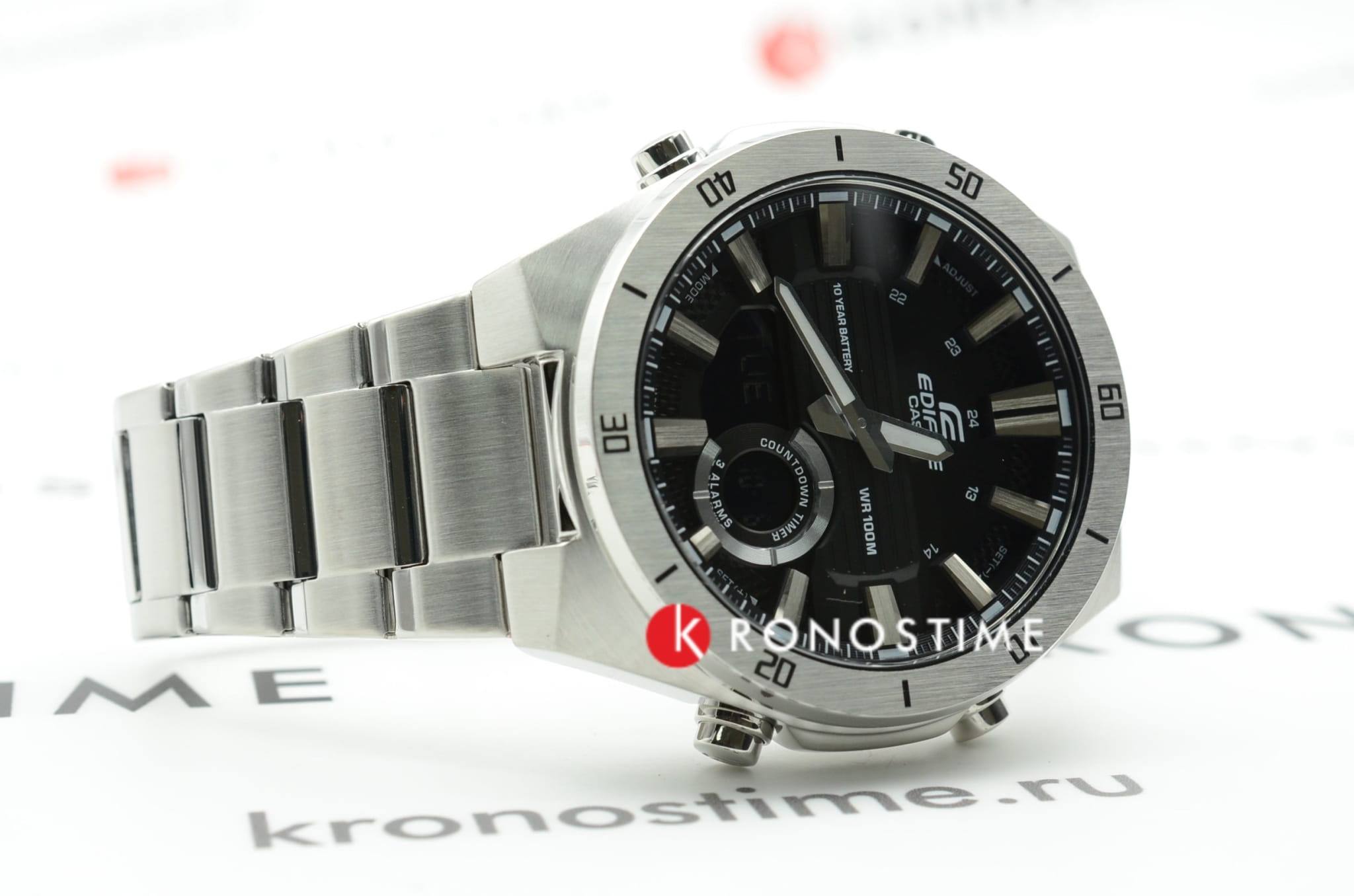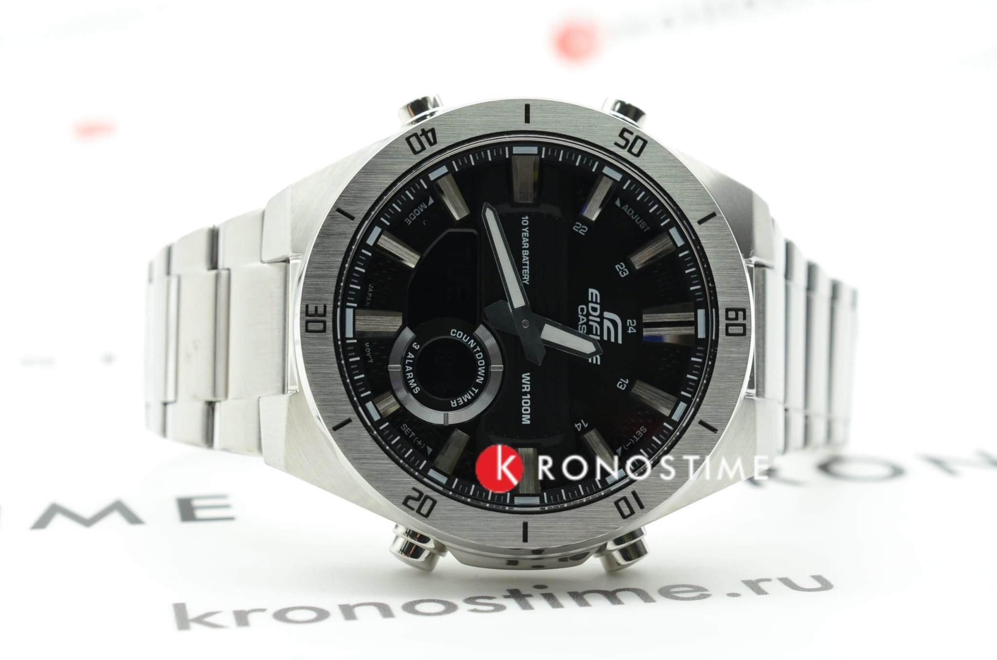 Аналого-цифровая модель привлекает внимание необычным дизайном тёмного циферблата крупной индикацией времени, общий стиль выражен в автомобильной тематике. Аксессуар станет прекрасным вариантом для спортивного стиля в одежде. Точность хода японского кварцевого механизма составляет +/- 30 сек/мес. Срок службы батарейки рассчитан на 10 лет. Минеральное стеклоМинеральное стеклоМинеральное стекло представляет собой искусственно выращенный минерал кварца. Такое стекло отличается особой устойчивостью к повреждениям и царапинам. Уступает по некоторым качествам сапфировому стеклу.. Габариты: 52 x 47,6 x 14,2 мм. Подсветка NeobriteПодсветка NeobriteИспользование светонакопительных составов на основе сульфида цинка или алюмината стронция, яркий свет можно наблюдать на протяжении 6-10 часов после «зарядки» часов около источника света. продолжает светиться в темноте даже после непродолжительного пребывания на свету. Записная книжка на 30 ячеек памяти для записи имен и телефонных номеров, каждая запись может включать в себя текст из 8 букв и 12 цифр. Мировое времяМировое время Полезное часовое усложнение, отображающее время в основных городах и известных областях по всему миру, оно связано с часовыми поясами, удобно для путешественников и бизнесменов. – 30 городов (29 часовых поясов), возможность включения/отключения летнего времени. 12-ти и 24-х часовой формат времени. СекундомерСекундомерСекундоме́р — прибор, способный измерять интервалы времени с точностью до долей секунды. с точностью показаний 1/100с и временем измерения 24ч. Сплит-хронографСплит-хронографИспользуется для измерения продолжительности нескольких временных отрезков, начинающихся одновременно, а заканчивающихся в разное время.. ТаймерТаймерОтсчитывает секунды в обратном направлении в заданном интервале времени. обратного отсчета от 1мин до 24ч. Батарея рассчитана на 10 лет. Стальной браслет на раскладной застёжкеРаскладная застёжкаТакой тип застёжки используется только на браслетах из металла. Она никогда не раскрывается полностью, происходит разделение на 2 и более частей. Раскладывающая застёжка снизит вероятность потери часов к минимуму..