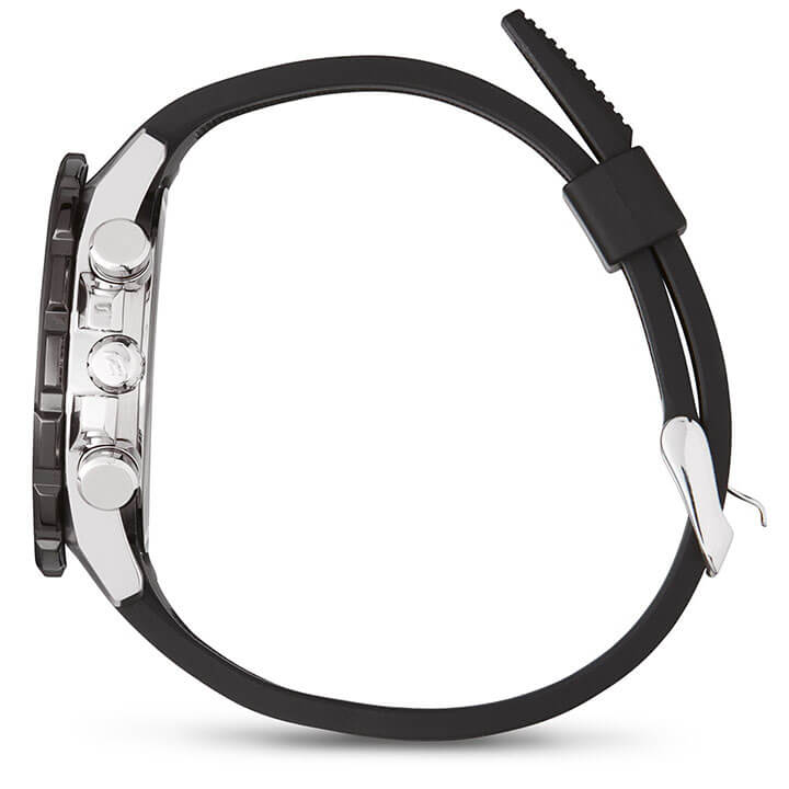 Это брендовый аксессуар для современного мужчины, привыкшего идти в ногу со временем. Сдержанная расцветка разбавлена ярко-голубыми деталями, позволяя акцентировать внимание на продуманном оформлении в автомобильной тематике. Привлекательно выглядит мягкий ремешок из полимерного материала. Японский кварцевый механизм с точностью хода +/- 20 секунд в месяц. Односторонне вращающийся безельБезельВнешний ободок, закрепляющий стекло. В спортивных часах так называется поворотное кольцо с делениями на циферблате, выполняет роль таймера – замеряет отрезки времени на шкале. Неподвижный безель – элемент декора. Однонаправленно вращающийся безель на дайверских часах позволяет фиксировать моменты погружения и выныривания на поверхность.. Противоударный корпусУдаропрочный корпусМеханизм заключён в корпус, выполненный из современных материалов, устойчивых к ударам, механическим повреждениям и падению с высоты: инновационный пластик, карбон, нержавеющая сталь, титан. из нержавеющей стали 316L с IP-покрытиемIP-покрытиеМетод ионного напыления. Демонстрирует повышенную устойчивость к истиранию, окислению и химическим веществам. Под воздействием высокого давления и температуры около 1500°C молекулы металла надёжно соединяются с частицами корпуса часов.. Сапфировое стекло с антибликовой поверхностью. Завинчивающаяся задняя крышка. Водонепроницаемость 100 метров. Люминесцентная подсветкаЛюминесцентное покрытиеПозволяет считывать показания времени в темноте. Производители наносят на стрелки, часовые индексы, безель или поверхность циферблата светонакопительный состав, дающий холодное свечение.. Секундомер, хронографХронографФункция позволяет измерять отрезки времени с особой точностью: часы, минуты, секунды. Верным признаком хронографа является наличие на циферблате 3 дополнительных окошек-счётчиков., окошко даты. Габариты: 50 x 47 x 12 мм.