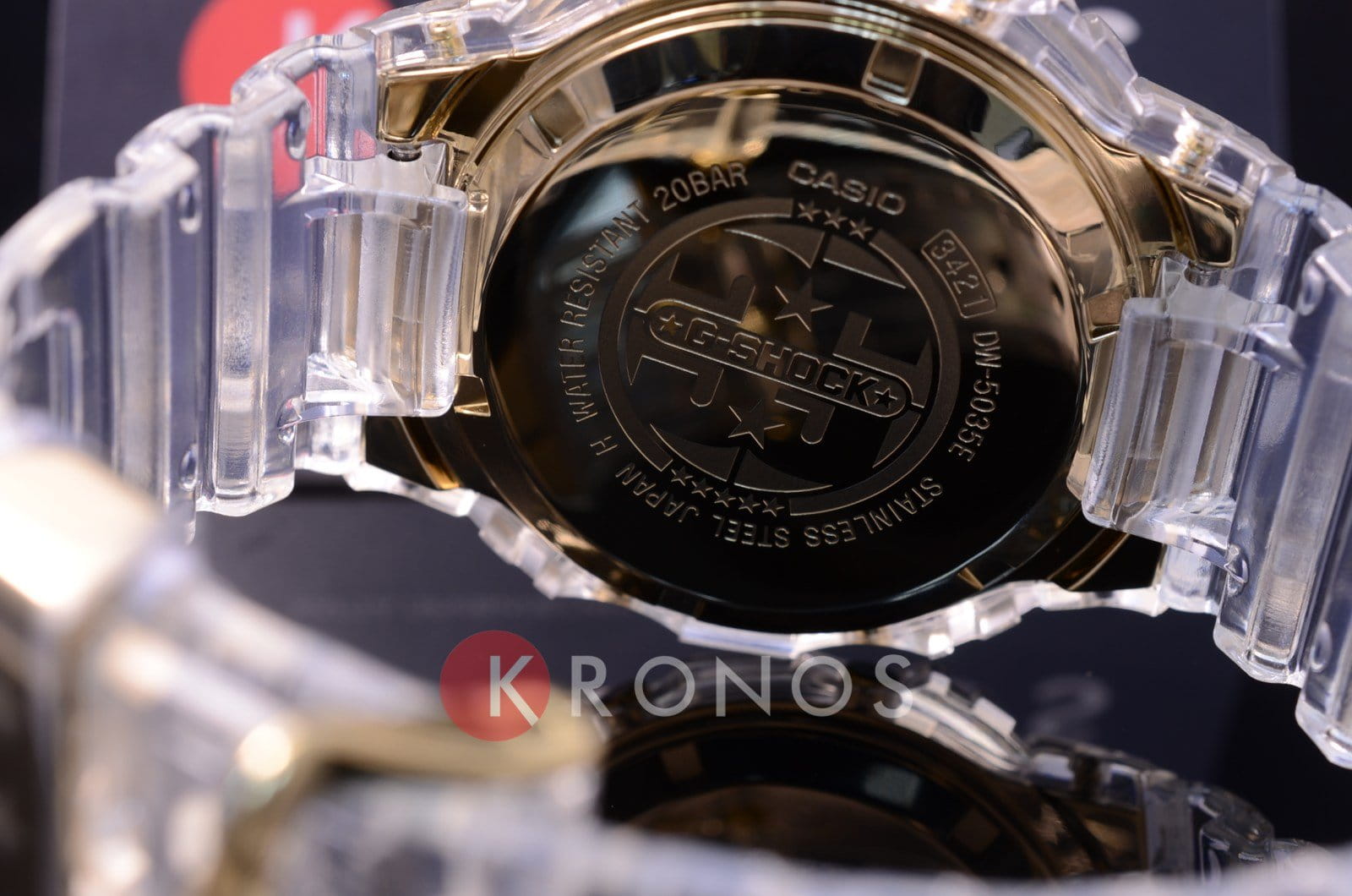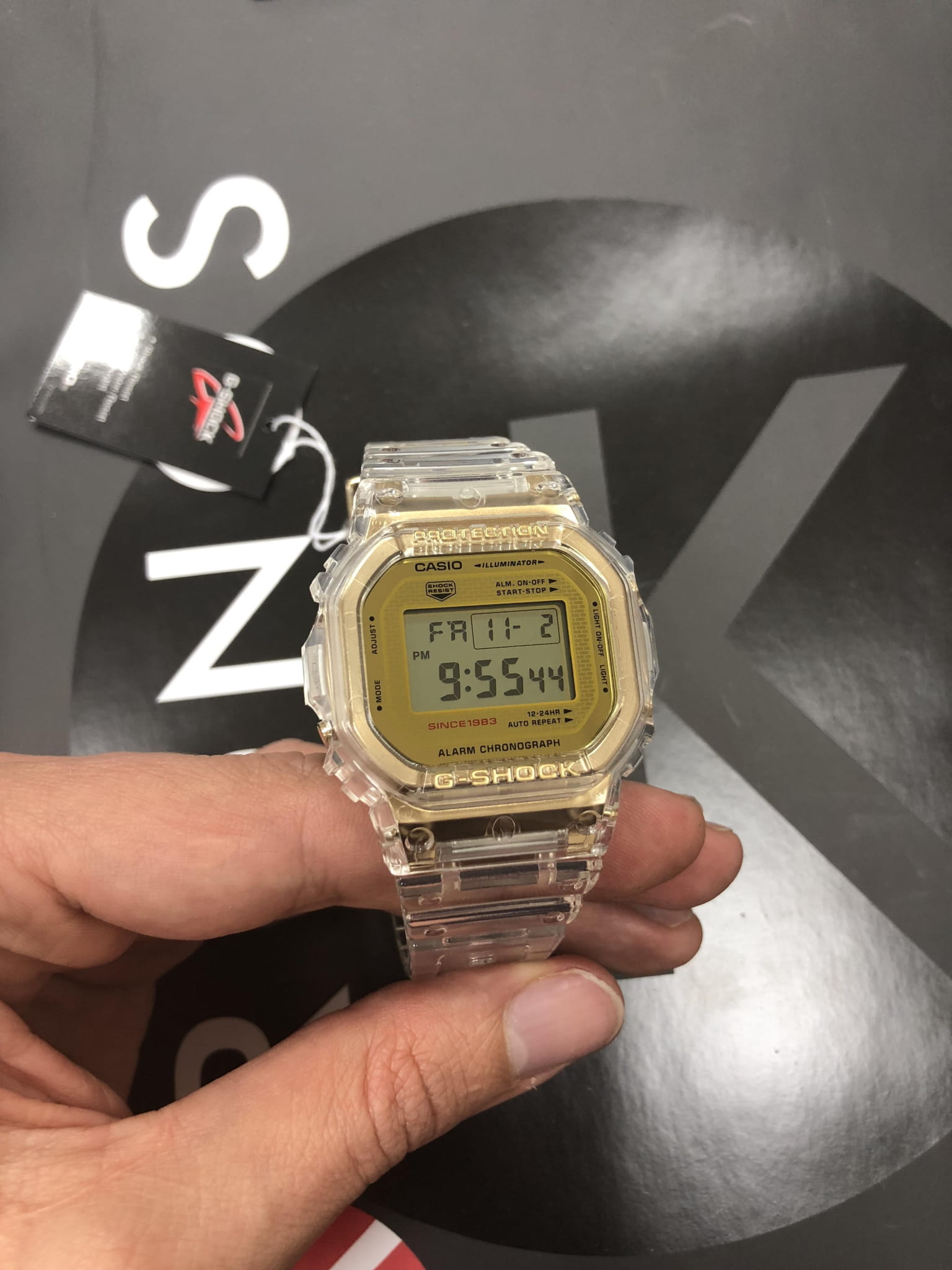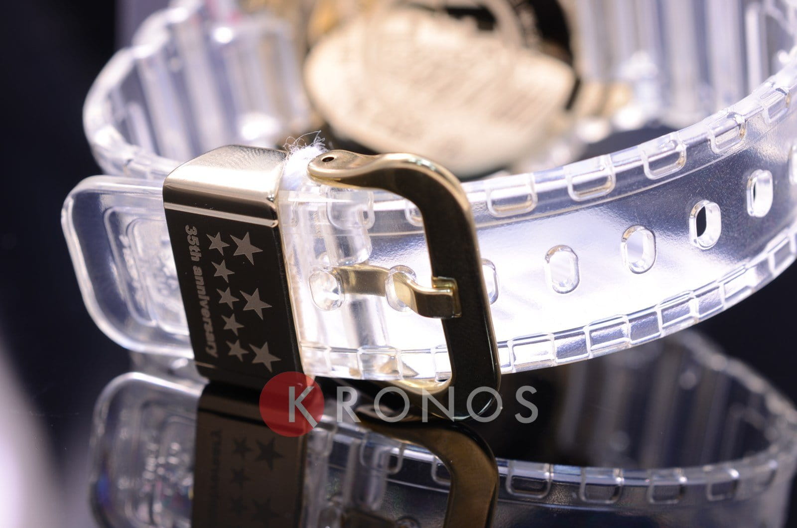 Лимитированная коллекция, под названием "Glacier Gold" - это настоящий подарок всем поклонникам G-Shock Модельный ряд был выпущен в честь 35-летия бренда G-Shock "Ледяное золото" - такое название получила коллекция благодаря изначальному ее концепту Во время работы дизайнеры опирались на образ ледяной глыбы, огромного куска льда, который выглядит мощно, красиво и завораживающе Таким образом подчеркивается невероятная надежность и "живучесть" часов даже в самых неблагоприятных и экстремальных условиях Корпус и циферблат изделия имеют золотистый цвет Часы покрыты особым полиуретаном (прозрачным)