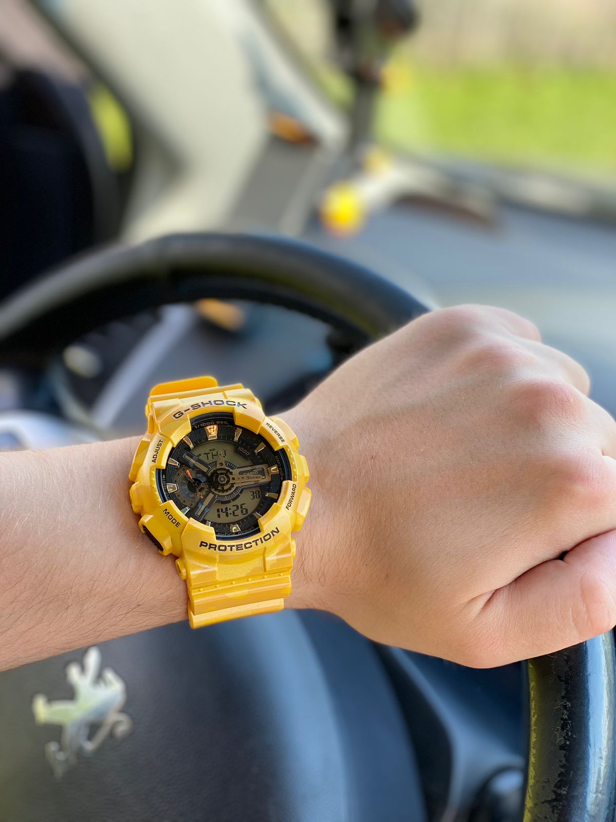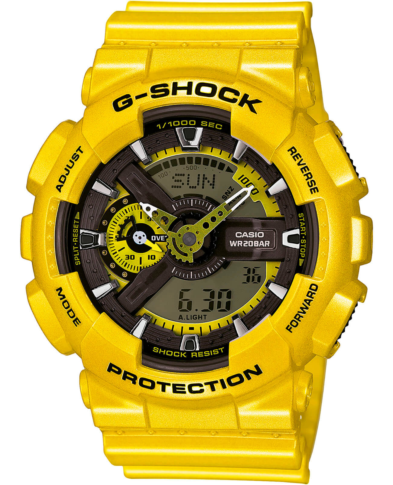 Модель особенно подойдет тем, кто любит постоянно находиться в центре внимания. Наручные часы в жёлтой камуфляжной расцветке точно станут ключевой деталью, брутальности добавляют крупные элементы, многоуровневый циферблат и общая внушительная конструкция. Стильно смотрится малый счётчик с металлическим блеском. Японский кварцевый механизм «упакован» в противоударный корпусУдаропрочный корпусМеханизм заключён в корпус, выполненный из современных материалов, устойчивых к ударам, механическим повреждениям и падению с высоты: инновационный пластик, карбон, нержавеющая сталь, титан. из полимерного пластика, такой материал обладает повышенными удароустойчивыми свойствами. К тому же, часы защищены от воздействия магнитных полей. Батарейка рассчитана на 2 года службы. Светодиодная подсветкаСветодиодная подсветкаСветодиодная или LED-подсветка обеспечивает появление яркого холодного свечения за счёт LED-элементов - маленьких лампочек. Они потребляют минимальное количество энергии, чаще всего можно встретить 1 светодиод, в нижней части циферблата.. Водонепроницаемость 20 бар. Закаленное минеральное стекло. ХронографХронографФункция позволяет измерять отрезки времени с особой точностью: часы, минуты, секунды. Верным признаком хронографа является наличие на циферблате 3 дополнительных окошек-счётчиков., секундомер, возможность установить среднее значение скорости пройденного маршрута, календарь до 2099 года, мировое времяМировое время Полезное часовое усложнение, отображающее время в основных городах и известных областях по всему миру, оно связано с часовыми поясами, удобно для путешественников и бизнесменов. , таймер, будильник. Габариты: 55 x 51,2 x 16,9 мм.