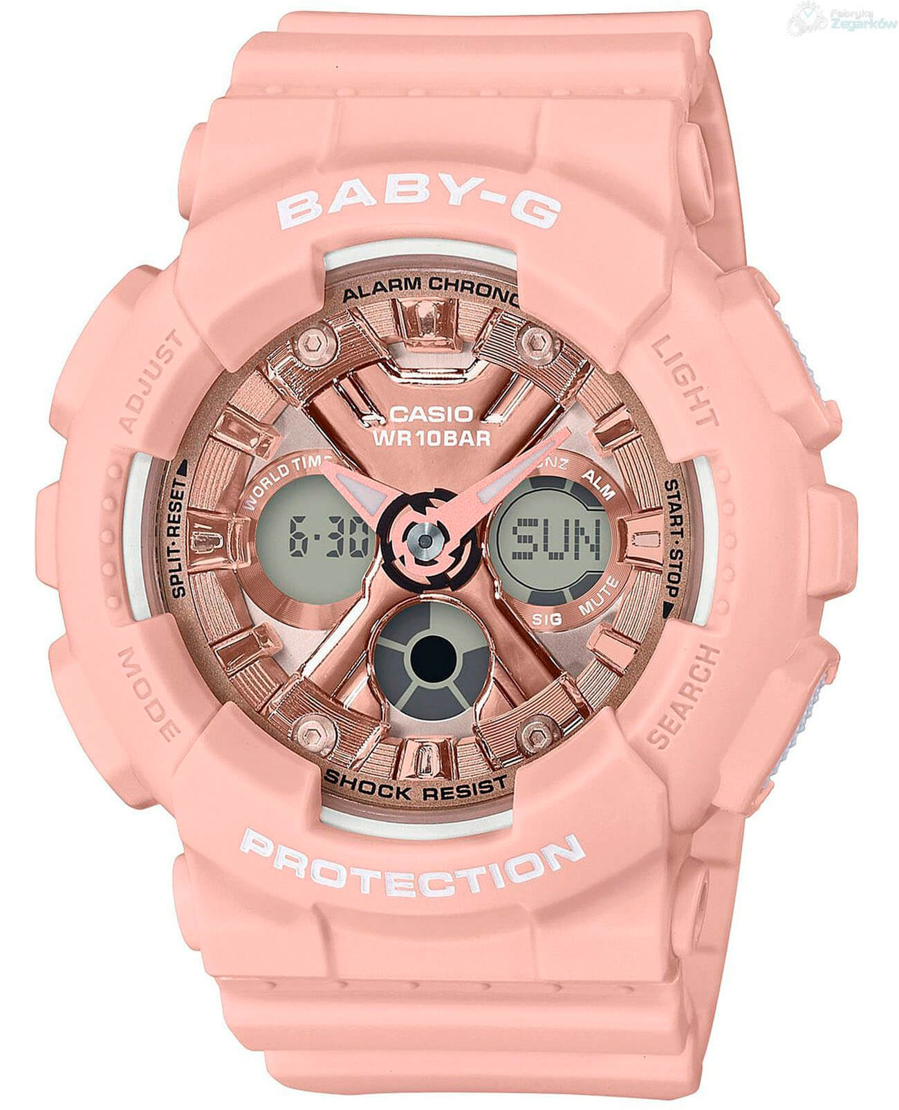 Модель идеально сочетается с повседневной одеждой или нарядами в стиле casual. Привлекательно выглядят элементы циферблата с металлическим отливом. Наручные часы с противоударным корпусомУдаропрочный корпусМеханизм заключён в корпус, выполненный из современных материалов, устойчивых к ударам, механическим повреждениям и падению с высоты: инновационный пластик, карбон, нержавеющая сталь, титан. выполнены из полимерного материала, легко поглощающего силу удара и вибрации, что делает их надёжным и долговечным аксессуаром. Кварцевый механизм японского производства. Батарейка рассчитана на 3 года службы. Циферблат со светодиодной подсветкойСветодиодная подсветкаСветодиодная или LED-подсветка обеспечивает появление яркого холодного свечения за счёт LED-элементов - маленьких лампочек. Они потребляют минимальное количество энергии, чаще всего можно встретить 1 светодиод, в нижней части циферблата.. Минеральное стекло. Защита от магнитных полей. Водонепроницаемость 20 бар. Функциональные возможности: мировое времяМировое время Полезное часовое усложнение, отображающее время в основных городах и известных областях по всему миру, оно связано с часовыми поясами, удобно для путешественников и бизнесменов. , таймер обратного отсчёта, будильник, хронографХронографФункция позволяет измерять отрезки времени с особой точностью: часы, минуты, секунды. Верным признаком хронографа является наличие на циферблате 3 дополнительных окошек-счётчиков., автоматический календарь до 2099 года, UTCUTCВсемирное кординационное время, не имеющее привязки к географическому положению Гринвича, основывается на атомном отсчёте времени. Регулировка времени осуществляется более точно, чем устаревшее GMT.