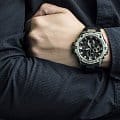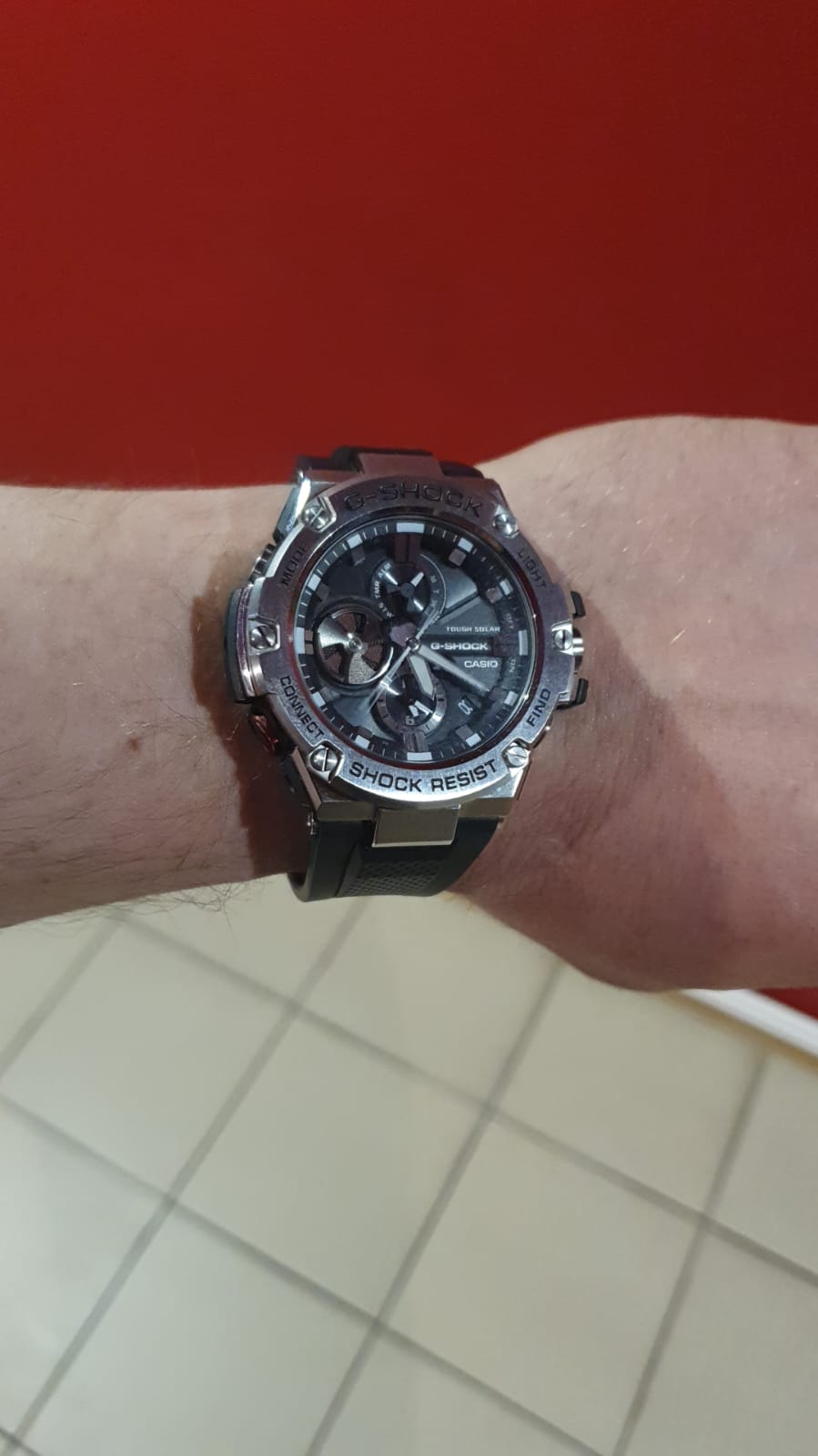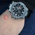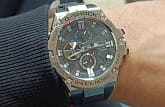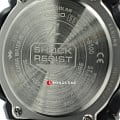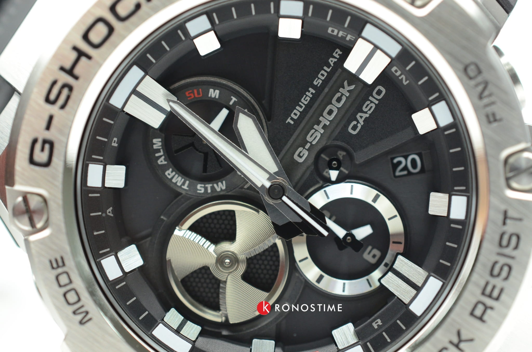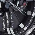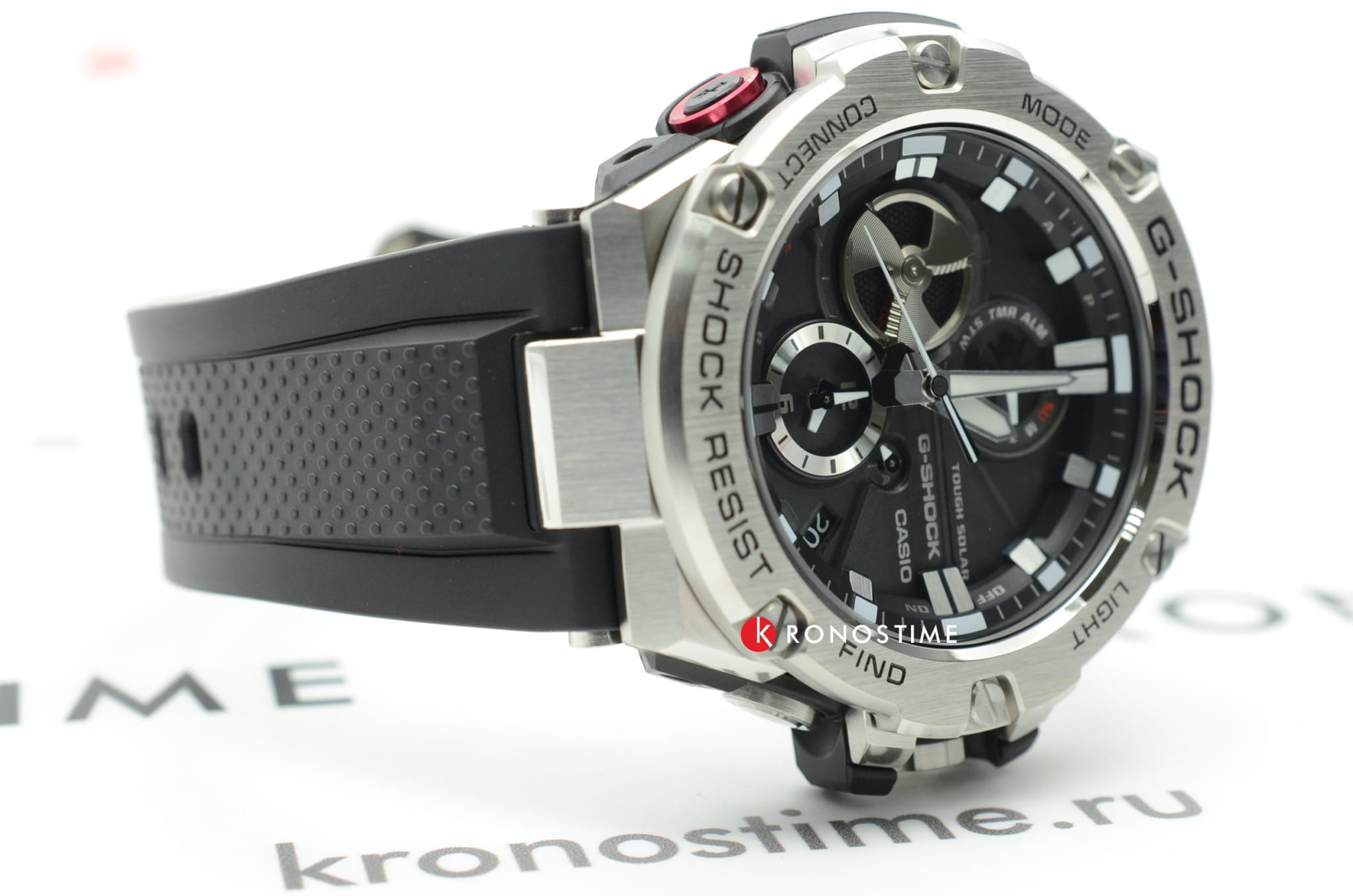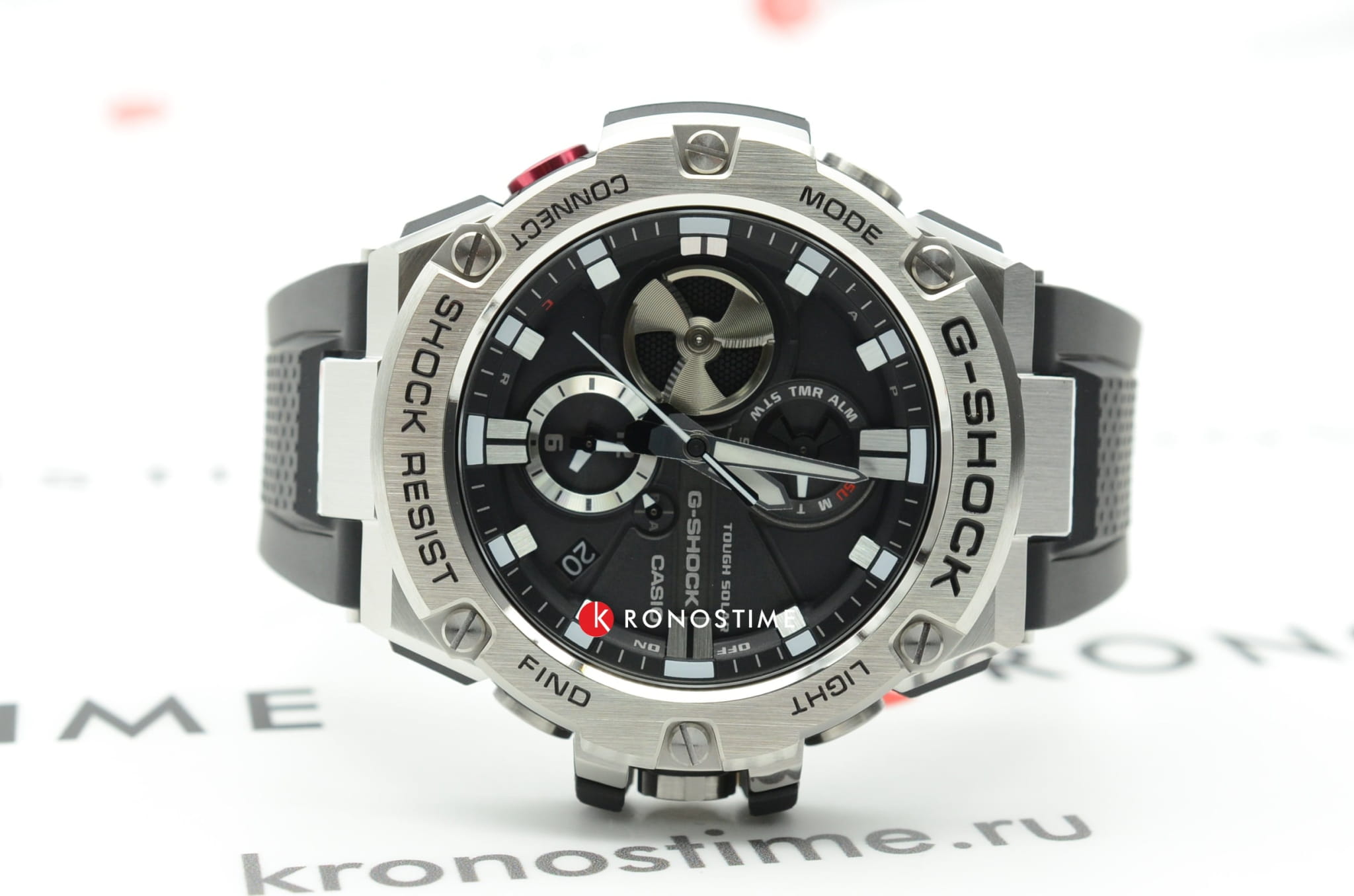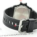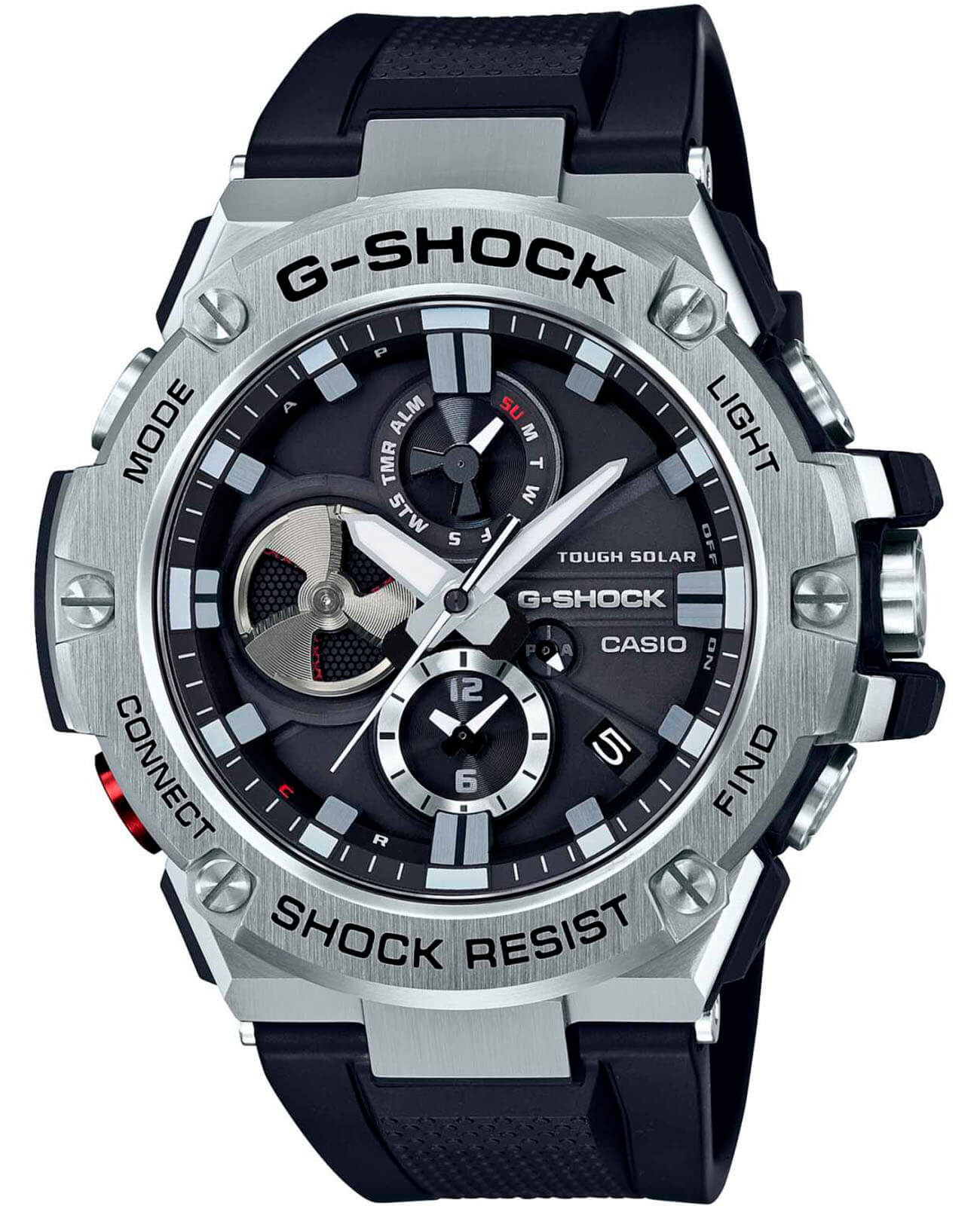 Отличительной особенностью стал противоударный корпусУдаропрочный корпусМеханизм заключён в корпус, выполненный из современных материалов, устойчивых к ударам, механическим повреждениям и падению с высоты: инновационный пластик, карбон, нержавеющая сталь, титан., выполненный из нержавеющей стали 316L и полимерного материала. Такая конструкция увеличивает устойчивость модели к падению и повреждениям. Тёмный циферблат с крупной индикацией времени отлично сочетается с металлическим блеском стали. Высокая точность хода обеспечивается кварцевым японским механизмом. Питание от солнечной батареи . Два вида подсветки - люминесцентнаяЛюминесцентное покрытиеПозволяет считывать показания времени в темноте. Производители наносят на стрелки, часовые индексы, безель или поверхность циферблата светонакопительный состав, дающий холодное свечение. и светодиоднаяСветодиодная подсветкаСветодиодная или LED-подсветка обеспечивает появление яркого холодного свечения за счёт LED-элементов - маленьких лампочек. Они потребляют минимальное количество энергии, чаще всего можно встретить 1 светодиод, в нижней части циферблата.. Надёжное минеральное стекло. Ремешок из полиуретана. Синхронизация со смартфоном BluetoothBluetoothСовременная технология, позволяющая синхронизировать часы с телефоном и переносить данные. Часы с Bluetooth расширяют возможности вашего смартфона и делают его использование ещё более удобным.. Автоматический календарь, хронографХронографФункция позволяет измерять отрезки времени с особой точностью: часы, минуты, секунды. Верным признаком хронографа является наличие на циферблате 3 дополнительных окошек-счётчиков., будильник, таймер, мировое времяМировое время Полезное часовое усложнение, отображающее время в основных городах и известных областях по всему миру, оно связано с часовыми поясами, удобно для путешественников и бизнесменов. . Водостойкость 20 бар. Габариты: 58,1 x 53,8 x 14,1 мм.