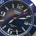 Синий циферблат имеет крупную индикацию времени, что позволяет увидеть показания даже при мимолётном взгляде на циферблат. Оформление выдержано в дайверской тематике, обратите внимание на однонаправленно вращающийся безельБезельВнешний ободок, закрепляющий стекло. В спортивных часах так называется поворотное кольцо с делениями на циферблате, выполняет роль таймера – замеряет отрезки времени на шкале. Неподвижный безель – элемент декора. Однонаправленно вращающийся безель на дайверских часах позволяет фиксировать моменты погружения и выныривания на поверхность. и высокую степень водозащиты WR 200. Кварцевый японский механизм. Срок службы батарейки составляет 10 лет. Надёжное минеральное стекло. Стрелки и метки с люминесцентным покрытиемЛюминесцентное покрытиеПозволяет считывать показания времени в темноте. Производители наносят на стрелки, часовые индексы, безель или поверхность циферблата светонакопительный состав, дающий холодное свечение.. Корпус и браслет из износоустойчивой хирургической стали 316L. Апертура даты. Габариты: 48 x 42,6 x 11,5 мм.