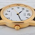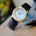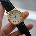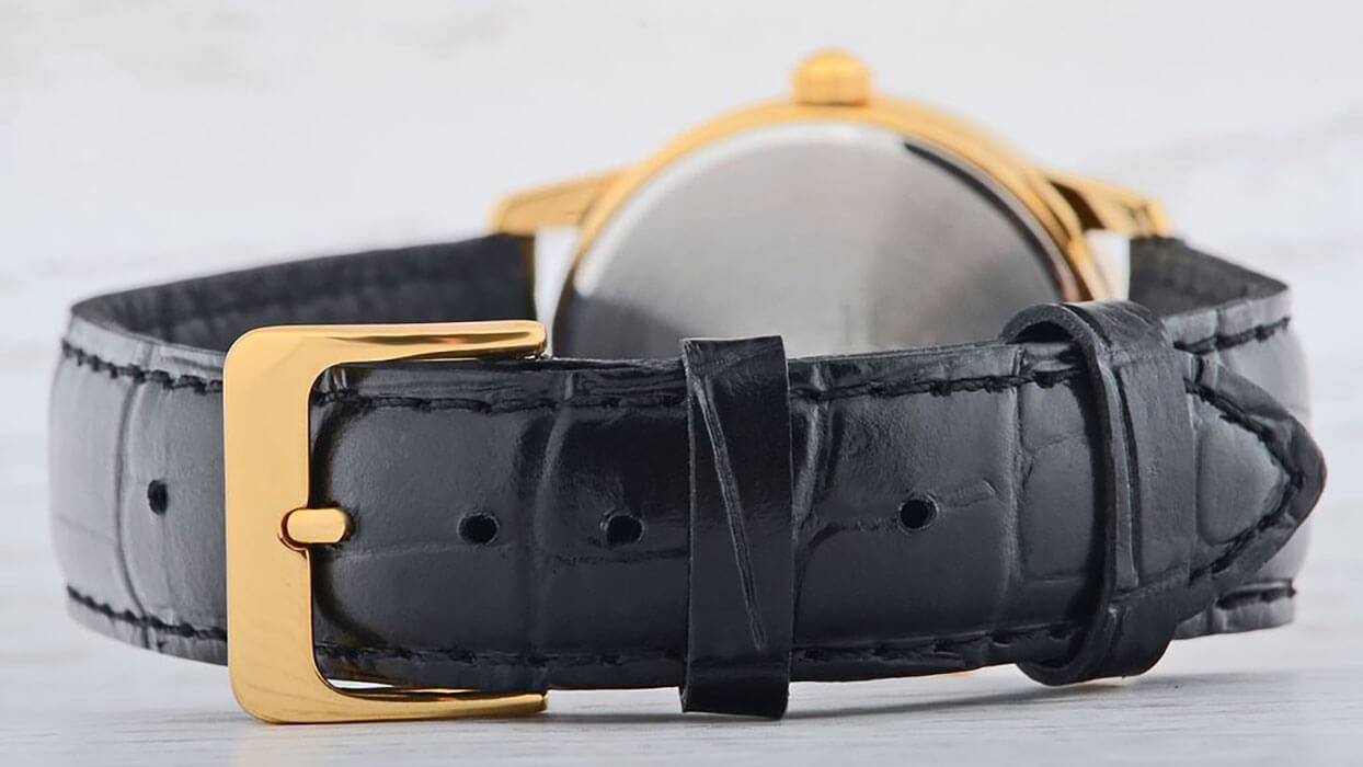 Часы с идеальными формами и стильной цветовой расцветкой выгодно подчеркнут любой модный образ. Золотистый круглый корпус из латуни добавляет аксессуару изящности. На циферблате традиционной формы расположены отчетливые арабские цифры. Крепкое минеральное стекло надежно защищает изделие от повреждений. Черный мягкий ремень из натуральной кожи будет максимально комфортно сидеть на запястье. Точность хода обеспечивается кварцевым механизмом. Срок службы батарейки составляет 3 года. Небольшой вес в 18 грамм не доставит дискомфорта при ношении часов.