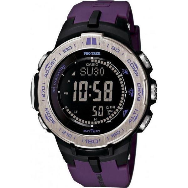 Casio PRW-3100-6E — современные мужские противоударные кварцевые часы круглой формы с черным цифровым циферблатом. Корпус из нержавеющей стали с минеральным стеклом удерживается на руке ярким, фиолетового цвета полиуретановым браслетом. Часы Casio PRW-3100-6E оснащены секундомером, таймером обратного отсчета, высотомером, барометром, термометром и компасом. Степень водонепроницаемости до 100 метров. Источник энергии - солнечная батарея.