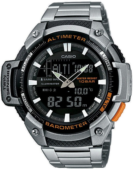 Аналоговый и цифровой вариант отображения времени, летнее/зимнее время, мировое время (есть Москва), секундомер (с возможностью учета времени круга и финиша двух спортсменов), таймер (без автоповтора), 5 будильников, сигнал начала часа, электролюминесцентная подсветка, барометр (погрешность 1-2 мм. рт. ст.), термометр (нужно снимать часы с руки, чтоб остывали), альтиметр (погрешность +/-20м), пластиковый корпус, металлический безель, пластиковое стекло, металлический браслет.