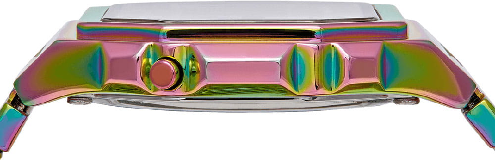 Уже известный 8-угольный ударопрочный корпусУдаропрочный корпусМеханизм заключён в корпус, выполненный из современных материалов, устойчивых к ударам, механическим повреждениям и падению с высоты: инновационный пластик, карбон, нержавеющая сталь, титан. выполнен из нержавеющей стали 316L, как и стильный браслет миланского плетения. Оригинально выглядит переливающаяся вставка, окружающая цифровое окошко. Кварцевый высокоточный механизм работает от батарейки, аккумулятор рассчитан на 3 года эксплуатации. Светодиодная подсветкаСветодиодная подсветкаСветодиодная или LED-подсветка обеспечивает появление яркого холодного свечения за счёт LED-элементов - маленьких лампочек. Они потребляют минимальное количество энергии, чаще всего можно встретить 1 светодиод, в нижней части циферблата. дисплея. Долговечное IP-покрытиеIP-покрытиеМетод ионного напыления. Демонстрирует повышенную устойчивость к истиранию, окислению и химическим веществам. Под воздействием высокого давления и температуры около 1500°C молекулы металла надёжно соединяются с частицами корпуса часов.. Минеральное стекло устойчиво к появлению царапин. Автоматический календарь, будильник, секундомер. Габариты: 38 x 39,6 x 7,3 мм.