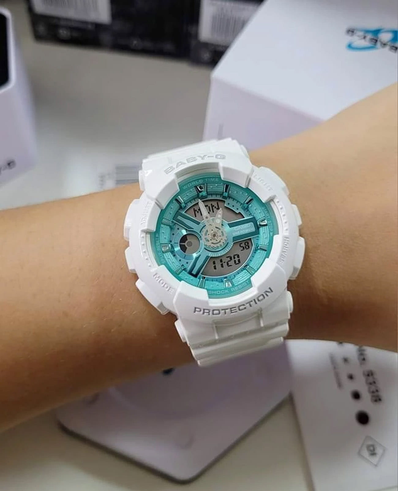 Женские противоударныеУдаропрочный корпусМеханизм заключён в корпус, выполненный из современных материалов, устойчивых к ударам, механическим повреждениям и падению с высоты: инновационный пластик, карбон, нержавеющая сталь, титан. японские часы-хронографХронографФункция позволяет измерять отрезки времени с особой точностью: часы, минуты, секунды. Верным признаком хронографа является наличие на циферблате 3 дополнительных окошек-счётчиков. Casio Baby-G BA-110XWS-7A, кварцевый механизм с высокой точностью. Идеальные часики от Casio для модных девушек, которые привыкли всегда быть в тренде. С широким функционалом, в который входит: таймерТаймерОтсчитывает секунды в обратном направлении в заданном интервале времени., будильникБудильникБуди́льник — часы, в заданный момент времени подающие звуковой, световой и/или в редких случаях другой сигнал. с ежечасным сигналом, 12 и 24-часовой формат времени, вечный календарьВечный календарьКлассическое часовое усложнение, представляющее собой календарь, рассчитанный на несколько лет вперёд (стандартно – до 2099 года). Определяет текущую дату, день недели, месяц.. Ударопрочный корпусУдаропрочный корпусМеханизм заключён в корпус, выполненный из современных материалов, устойчивых к ударам, механическим повреждениям и падению с высоты: инновационный пластик, карбон, нержавеющая сталь, титан. защищает механизм от ударов и вибрации. Светодиодная подсветкаСветодиодная подсветкаСветодиодная или LED-подсветка обеспечивает появление яркого холодного свечения за счёт LED-элементов - маленьких лампочек. Они потребляют минимальное количество энергии, чаще всего можно встретить 1 светодиод, в нижней части циферблата. освещает весь циферблат, после отпускания кнопки свечение продолжается еще некоторое время. Батарея рассчитана на 2 года. Мировое времяМировое время Полезное часовое усложнение, отображающее время в основных городах и известных областях по всему миру, оно связано с часовыми поясами, удобно для путешественников и бизнесменов. – 48 городов (29 часовых поясов), всемирное координированное время (UTCUTCВсемирное кординационное время, не имеющее привязки к географическому положению Гринвича, основывается на атомном отсчёте времени. Регулировка времени осуществляется более точно, чем устаревшее GMT.
