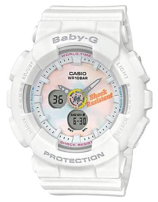 Женские противоударные японские наручные часы Casio Baby-G BA-120T-7A, кварцевый механизм с высокой точностью. Класс водозащиты: 100 метров, позволит плавать, нырять и заниматься другими водными видами спорта. Корпус часов изготовлен из пластика, белого цвета.