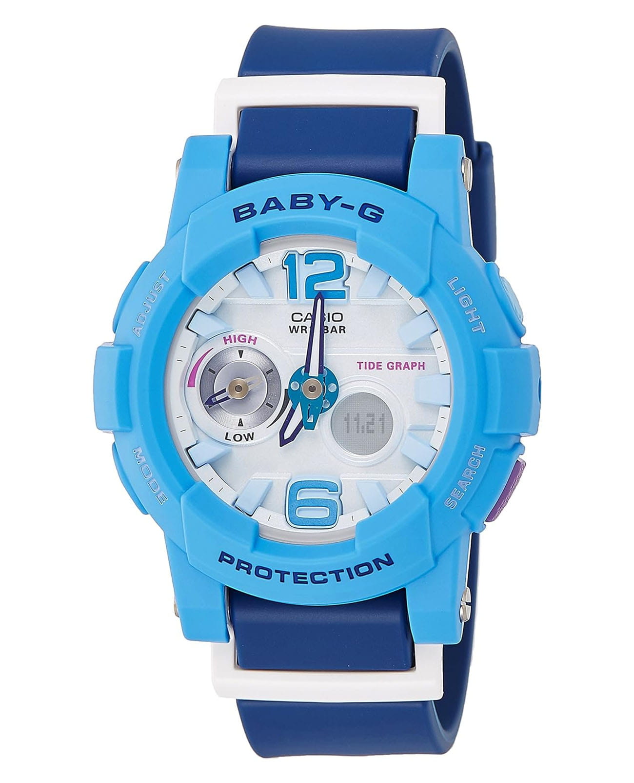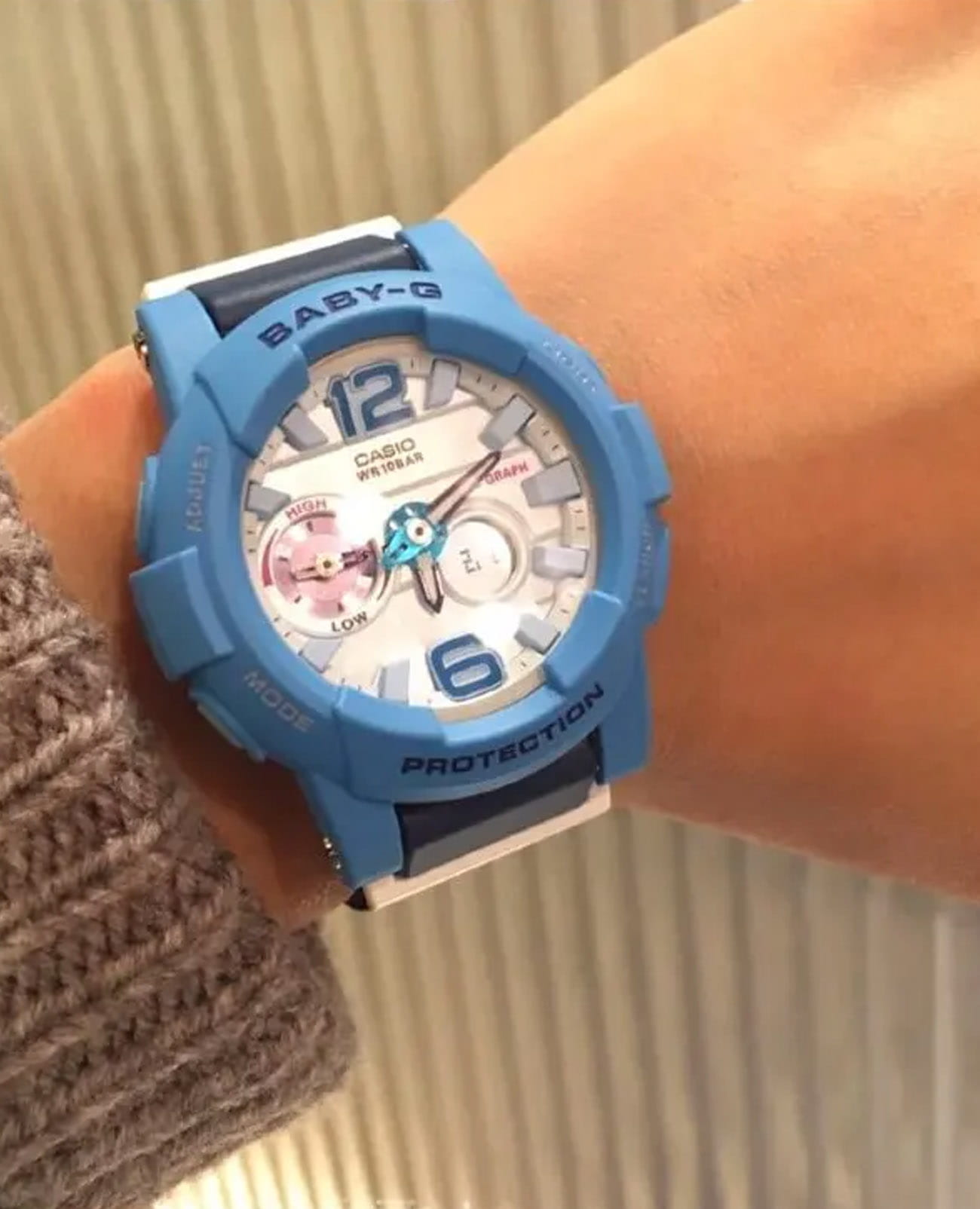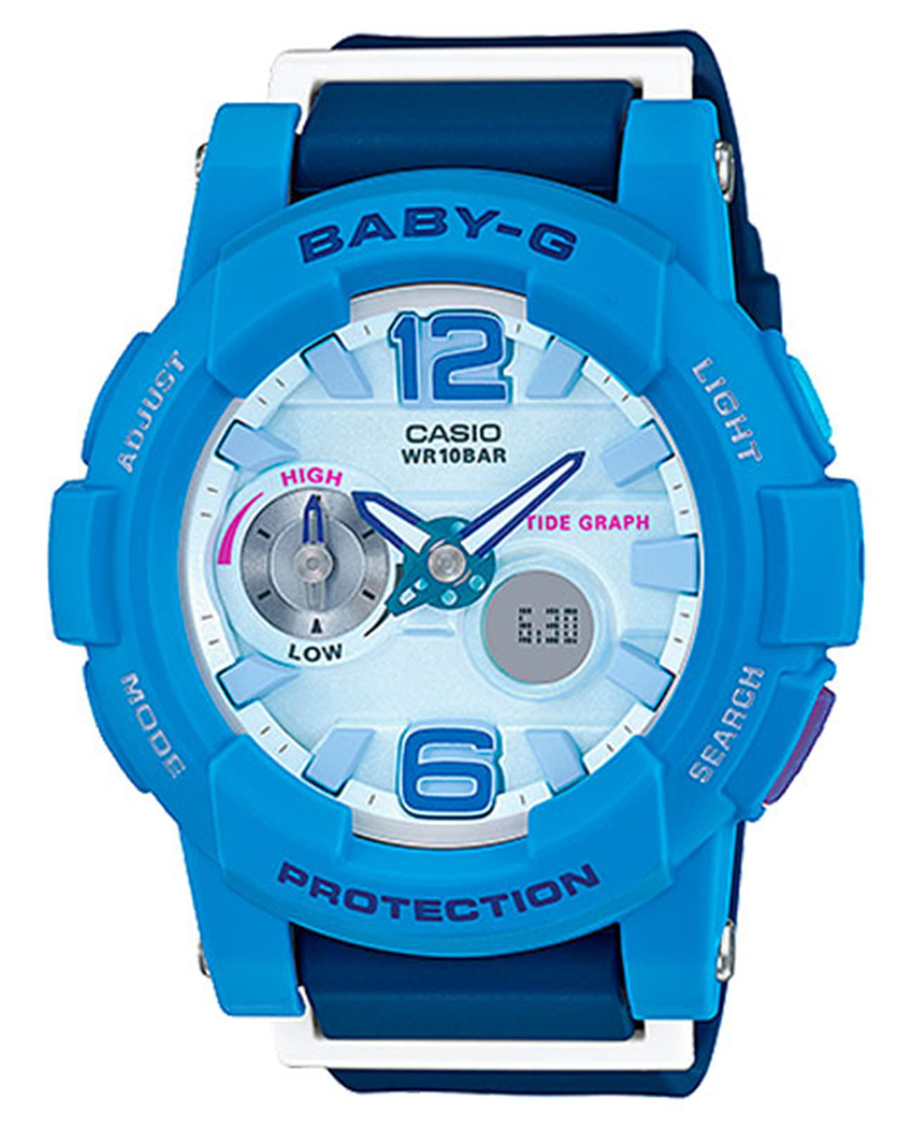 Японские женские часы-хронографХронографФункция позволяет измерять отрезки времени с особой точностью: часы, минуты, секунды. Верным признаком хронографа является наличие на циферблате 3 дополнительных окошек-счётчиков. Casio Baby-G BGA-180-2B3DR из коллекции Baby-G. Минеральное стеклоМинеральное стеклоМинеральное стекло представляет собой искусственно выращенный минерал кварца. Такое стекло отличается особой устойчивостью к повреждениям и царапинам. Уступает по некоторым качествам сапфировому стеклу. устойчивое к появлению царапин, обладающее высокой прозрачностью. Корпус часов изготовлен из полимерного материала. Светодиодная подсветкаСветодиодная подсветкаСветодиодная или LED-подсветка обеспечивает появление яркого холодного свечения за счёт LED-элементов - маленьких лампочек. Они потребляют минимальное количество энергии, чаще всего можно встретить 1 светодиод, в нижней части циферблата. с функцией послесвечения. Ударопрочный корпусУдаропрочный корпусМеханизм заключён в корпус, выполненный из современных материалов, устойчивых к ударам, механическим повреждениям и падению с высоты: инновационный пластик, карбон, нержавеющая сталь, титан. защищает механизм от ударов и вибрации. Функция Мирового времениМировое время Полезное часовое усложнение, отображающее время в основных городах и известных областях по всему миру, оно связано с часовыми поясами, удобно для путешественников и бизнесменов. и летнего времени, второй часовой пояс. СекундомерСекундомерСекундоме́р — прибор, способный измерять интервалы времени с точностью до долей секунды. с точностью измерения 1/100 секунды и измерением до 23 часов 59 минут 59,99 cек. ТаймерТаймерОтсчитывает секунды в обратном направлении в заданном интервале времени. обратного отсчета (диапазон времени 24 часа), автоматический календарь, 12/24 отображение времени. 5 ежедневных будильниковБудильникБуди́льник — часы, в заданный момент времени подающие звуковой, световой и/или в редких случаях другой сигнал.. Термометр от -10 до 60°C . Отображение возраста и фазы луны. Отображение сведений о приливах и отливах (уровень прилива на ближайшие 12 часов, и на определенную дату и время). Функция включения/отключения звука кнопок. Функция перемещения стрелок.  Класс водозащиты: 100 метров, позволит плавать без погружения. Ремешок из полимерного материала на стандартной застежке.