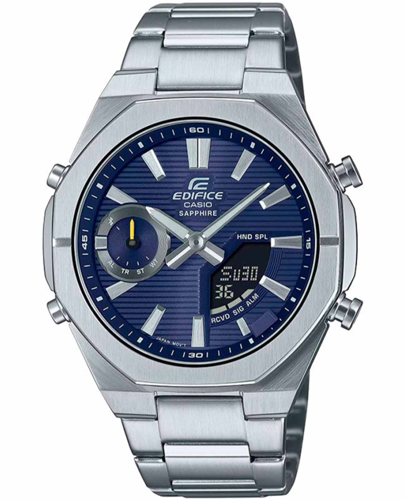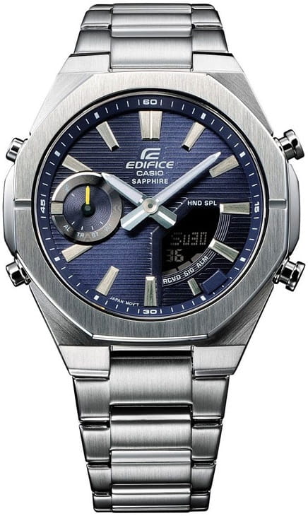 Японские мужские наручные часы Casio Edifice ECB-S10D-2A — это высокотехнологичный аксессуар для тех, кто ценит точность, стиль и современные инновации. Модель из коллекции Edifice , оснащённая технологией Bluetooth®, объединяет в себе классический дизайн и цифровые функции, делая каждое использование по-настоящему удобным. Корпус диаметром 43 мм выполнен из прочной нержавеющей стали , что придаёт модели благородства и долговечности. Циферблат синего цвета изготовлен по технологии Sunray (солнечные лучи) , обеспечивая глубину и игру света. Защиту механизму обеспечивает сапфировое стеклоСапфировое стеклоПрочный и надёжный материал из кристалла сапфира синтетического происхождения, характеризующийся особой твёрдостью и устойчивостью к царапинам и повреждениям., устойчивое к царапинам и с антибликовым покрытием для лучшей читаемости. Часы работают на кварцевом механизме с поддержкой BluetoothBluetoothСовременная технология, позволяющая синхронизировать часы с телефоном и переносить данные. Часы с Bluetooth расширяют возможности вашего смартфона и делают его использование ещё более удобным. , что позволяет синхронизировать их со смартфоном через специальное приложение CASIO WATCHES . Это даёт возможность автоматически корректировать время, устанавливать будильники, отслеживать дни недели на 6 языках , включая русский, а также выбирать время в до 300 городов мира . Также реализована функция перемещения стрелок , которая открывает обзор цифровых окон, и функция поиска телефона. Модель предлагает широкий набор функций: — Секундомер с точностью 1/100 секунды и временем измерения до 24 часов ; — SPLIT-хронографСплит-хронографИспользуется для измерения продолжительности нескольких временных отрезков, начинающихся одновременно, а заканчивающихся в разное время.; — ТаймерТаймерОтсчитывает секунды в обратном направлении в заданном интервале времени. обратного отсчёта от 1 секунды до 24 часов ; — 5 независимых будильников и ежечасный сигнал ; — отображение времени в формате 12/24 часа ; — автоматический календарь с возможностью отображения дня недели до 2099 года; — включение/выключение звука кнопок и авиарежим . Для комфортного использования в темное время стрелки покрыты люминесцентным составом NeobriteПодсветка NeobriteИспользование светонакопительных составов на основе сульфида цинка или алюмината стронция, яркий свет можно наблюдать на протяжении 6-10 часов после «зарядки» часов около источника света., который заряжается на свету и долго светится в темноте. Часы также имеют двойную светодиодную подсветку циферблата , с регулировкой длительности свечения (1.5 или 3 секунды), что делает их особенно удобными в условиях слабого освещения. Часы обладают водозащитой WR100 , подходят для повседневного ношения и плавания без акваланга. Толщина корпуса составляет всего 9.6 мм , благодаря чему часы легко помещаются под манжетом рубашки и не вызывают дискомфорта при носке. Завершает образ стальной браслет с раскладывающейся тройной застежкой , обеспечивающий надежную фиксацию и комфортную посадку на запястье. Батарейка рассчитана на 2 года автономной работы , а вес модели составляет 129 грамм . Эта модель — идеальный выбор для тех, кто ценит современные технологии , классический стиль и точность японского качества . Casio Edifice — не просто хронограф, а полноценный спутник в деловой и повс