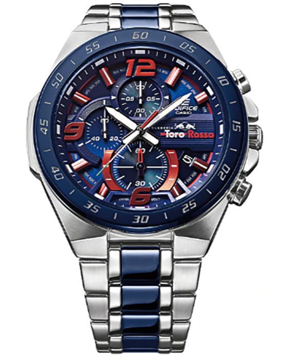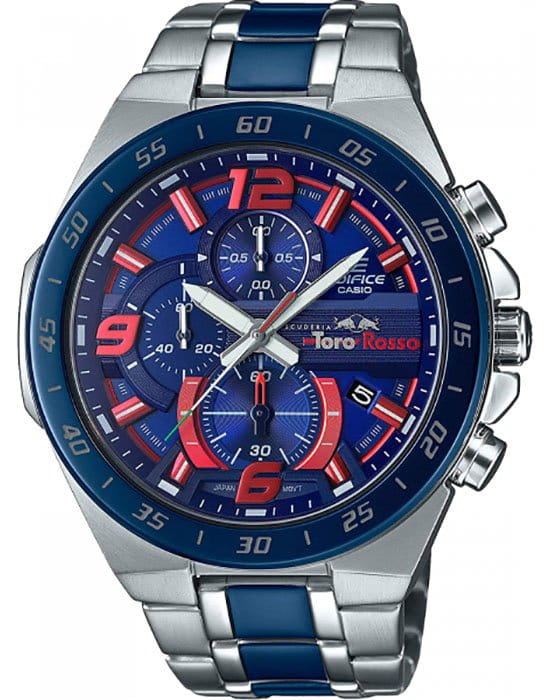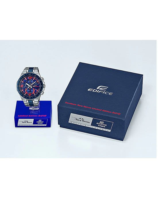 Японские мужские часы Limited Edition из автомобильной коллекции Edifice отличаются динамичным экстерьером, выпуск посвящён знаменитой команде Формулы-1 Scuderia Toro Rosso.