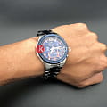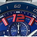 Синий циферблат с миниатюрными счётчиками хронографаХронографФункция позволяет измерять отрезки времени с особой точностью: часы, минуты, секунды. Верным признаком хронографа является наличие на циферблате 3 дополнительных окошек-счётчиков., напоминающий рулевой механизм, дополнен красными цветовыми акцентами, модель выполнена в расцветке гоночной команды. Массивный корпус из нержавеющей стали 316L стильно смотрится на мужском запястье. Часы оснащены высокоточным кварцевым механизмом, батарейка рассчитана на 3 года эксплуатации. Люминесцентная подсветкаЛюминесцентное покрытиеПозволяет считывать показания времени в темноте. Производители наносят на стрелки, часовые индексы, безель или поверхность циферблата светонакопительный состав, дающий холодное свечение. стрелок. Водостойкость до 100 метров. Надёжное минеральное стекло. Завинчивающаяся задняя крышка. Стальной браслет с безопасной предохранительной застёжкой. Секундомер, отображение даты. Габариты: 52 x 48,9 x 12,4 мм.