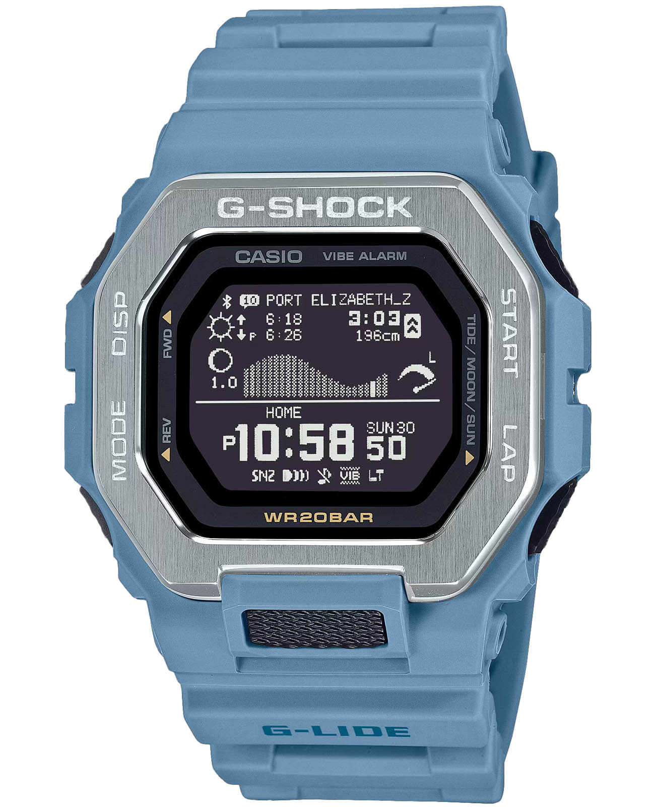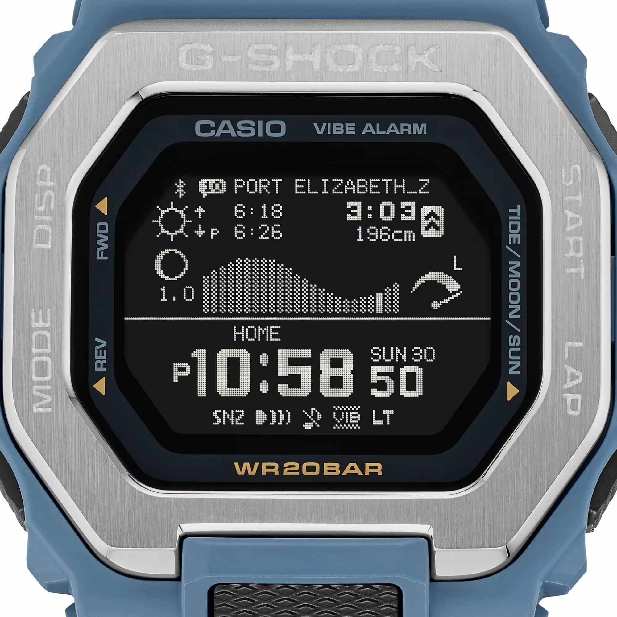 Японские мужские ударопрочные часы c функцией Bluetooth Casio G-Shock GBX-100-2A, кварцевый механизм с высокой точностью. Класс водозащиты: 200 метров, позволит плавать, нырять и заниматься другими водными видами спорта. Корпус представляет собой сочетание полимера и металла, причем безельБезельВнешний ободок, закрепляющий стекло. В спортивных часах так называется поворотное кольцо с делениями на циферблате, выполняет роль таймера – замеряет отрезки времени на шкале. Неподвижный безель – элемент декора. Однонаправленно вращающийся безель на дайверских часах позволяет фиксировать моменты погружения и выныривания на поверхность. выполнен из нержавеющей стали с блестящей шершавой обработкой для достижения прочности и текстуры. Ударопрочный корпусУдаропрочный корпусМеханизм заключён в корпус, выполненный из современных материалов, устойчивых к ударам, механическим повреждениям и падению с высоты: инновационный пластик, карбон, нержавеющая сталь, титан. защищает механизм от ударов и вибрации. Долговечный и экономичный матричный дисплей MIP LCD высокой четкости улучшает читаемость и восприятие любых данных. Отображаемые графики приливов и отливов, данные о Луне, время и уровень прилива/отлива, время восхода/заката солнца. Фирменная экономичная светодиодная подсветкаСветодиодная подсветкаСветодиодная или LED-подсветка обеспечивает появление яркого холодного свечения за счёт LED-элементов - маленьких лампочек. Они потребляют минимальное количество энергии, чаще всего можно встретить 1 светодиод, в нижней части циферблата. Super Illuminator с функцией Afterglow. Базовые функции: 12-ти и 24-х часовой формат времени, секундомерСекундомерСекундоме́р — прибор, способный измерять интервалы времени с точностью до долей секунды. с точностью показаний 1 сек и временем измерения 100 ч, сплит-хронографСплит-хронографИспользуется для измерения продолжительности нескольких временных отрезков, начинающихся одновременно, а заканчивающихся в разное время., возможность установить 5 таймеров, таймер обратного отсчета от 1 сек до 1 ч с автоповтором, мировое времяМировое время Полезное часовое усложнение, отображающее время в основных городах и известных областях по всему миру, оно связано с часовыми поясами, удобно для путешественников и бизнесменов. – 38 городов (38 часовых поясов), всемирное координированное время (UTCUTCВсемирное кординационное время, не имеющее привязки к географическому положению Гринвича, основывается на атомном отсчёте времени. Регулировка времени осуществляется более точно, чем устаревшее GMT.