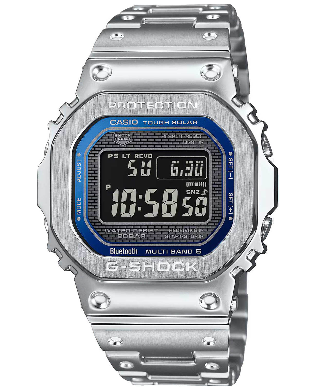 Перед вами супер-лимитированный релиз второй половины 2024 года от Casio! Легендарный олдскульный корпус GMW-B5000, облаченный в классическую сталь с яркой синей рамкой вокруг дисплея, окрашенной с помощью специальной технологии вакуумного лазерного напыления. Премиальные наручные часы серебристой расцветки, напоминающие ретро-модели от Casio, имеют противоударный корпусУдаропрочный корпусМеханизм заключён в корпус, выполненный из современных материалов, устойчивых к ударам, механическим повреждениям и падению с высоты: инновационный пластик, карбон, нержавеющая сталь, титан., благодаря безупречной полировке он выглядит хромированным. БезельБезельВнешний ободок, закрепляющий стекло. В спортивных часах так называется поворотное кольцо с делениями на циферблате, выполняет роль таймера – замеряет отрезки времени на шкале. Неподвижный безель – элемент декора. Однонаправленно вращающийся безель на дайверских часах позволяет фиксировать моменты погружения и выныривания на поверхность. имеет естественную стальную структуру. Слой материала Alpha Gel® обеспечивает дополнительную устойчивость к ударам и повреждениям, завинчивающаяся задняя крышка имеет защитное DLC-покрытиеDLC-покрытиеDiamond like carbon - одно из лучших видов покрытия, представляющее собой углерод с алмазными свойствами. На поверхность материала наносятся распавшиеся молекулы углерода, превращающиеся в плёнку из алмазоподобных связей, которая перенимает твёрдость алмаза.. Модель оснащена богатым функционалом: BluetoothBluetoothСовременная технология, позволяющая синхронизировать часы с телефоном и переносить данные. Часы с Bluetooth расширяют возможности вашего смартфона и делают его использование ещё более удобным., таймерТаймерОтсчитывает секунды в обратном направлении в заданном интервале времени., функция поиска телефона, UTCUTCВсемирное кординационное время, не имеющее привязки к географическому положению Гринвича, основывается на атомном отсчёте времени. Регулировка времени осуществляется более точно, чем устаревшее GMT.