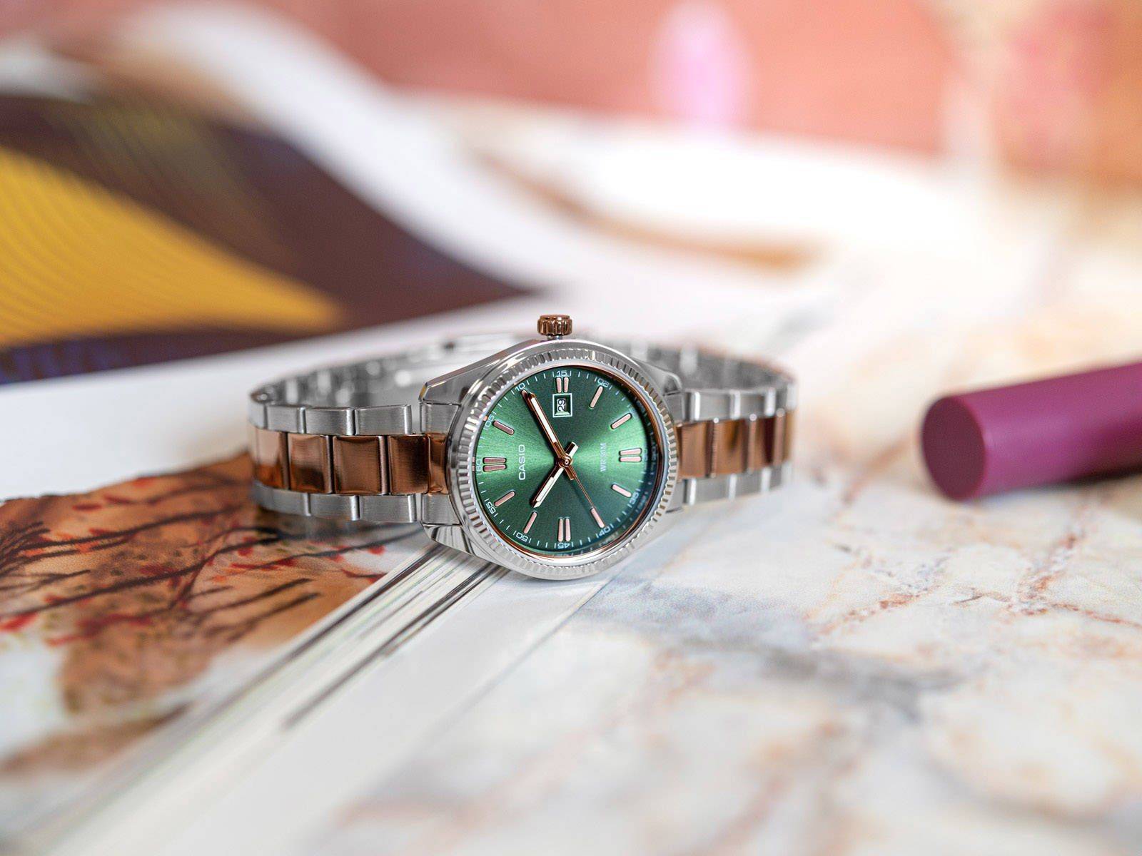 Японские женские часы Casio Collection LTP-1302PRG-3AVEF с минеральным стекломМинеральное стеклоМинеральное стекло представляет собой искусственно выращенный минерал кварца. Такое стекло отличается особой устойчивостью к повреждениям и царапинам. Уступает по некоторым качествам сапфировому стеклу.. Светящееся покрытие обеспечивает длительную подсветку в темное время суток после короткого воздействия света. Корпус выполнен из гипоаллергенной латуни. Модель комплектуется надёжным механизмом, точность хода которого составляет +/- 20 сек/мес. Стрелки с люминесцентным покрытиемЛюминесцентное покрытиеПозволяет считывать показания времени в темноте. Производители наносят на стрелки, часовые индексы, безель или поверхность циферблата светонакопительный состав, дающий холодное свечение.. Стальной браслет на раскладной застёжкеРаскладная застёжкаТакой тип застёжки используется только на браслетах из металла. Она никогда не раскрывается полностью, происходит разделение на 2 и более частей. Раскладывающая застёжка снизит вероятность потери часов к минимуму. с IP-покрытиемIP-покрытиеМетод ионного напыления. Демонстрирует повышенную устойчивость к истиранию, окислению и химическим веществам. Под воздействием высокого давления и температуры около 1500°C молекулы металла надёжно соединяются с частицами корпуса часов.. Окошко даты находится в положении 3 часа. Водонепроницаемость 50 метров, позволит защитить корпус от случайных брызг или капель дождя.