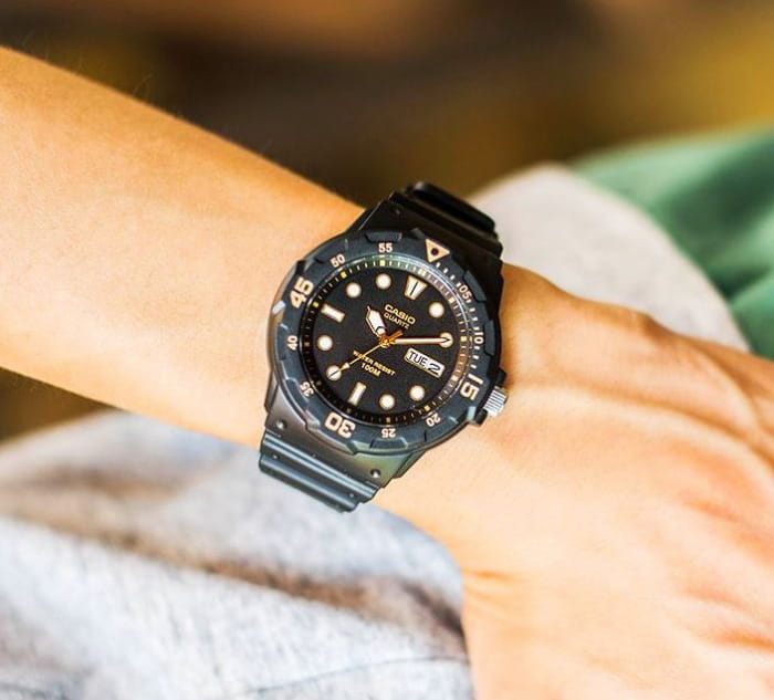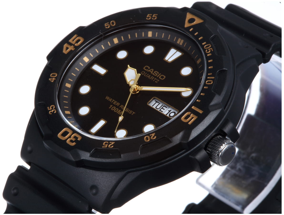 Спортивные японские мужские наручные часы Casio Collection MRW-200H-1E, кварцевый механизм с высокой точностью. Класс водозащиты: 100 метров, позволит плавать, нырять и заниматься другими водными видами спорта. Корпус часов изготовлен из пластика. Пластиковый ремешок на стандартной застёжке. Стрелки и метки с люминесцентным покрытиемЛюминесцентное покрытиеПозволяет считывать показания времени в темноте. Производители наносят на стрелки, часовые индексы, безель или поверхность циферблата светонакопительный состав, дающий холодное свечение.. Вращающийся в одном направлении пластиковый безельБезельВнешний ободок, закрепляющий стекло. В спортивных часах так называется поворотное кольцо с делениями на циферблате, выполняет роль таймера – замеряет отрезки времени на шкале. Неподвижный безель – элемент декора. Однонаправленно вращающийся безель на дайверских часах позволяет фиксировать моменты погружения и выныривания на поверхность..