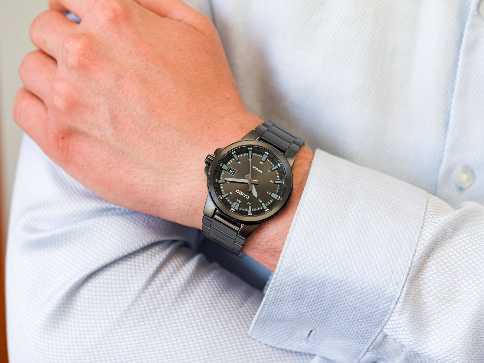 Японские мужские наручные часы с минеральным стекломМинеральное стеклоМинеральное стекло представляет собой искусственно выращенный минерал кварца. Такое стекло отличается особой устойчивостью к повреждениям и царапинам. Уступает по некоторым качествам сапфировому стеклу. Casio Collection MTP-E173B-1AVEF, кварцевый механизм с высокой точностью. Окошко даты с увеличительным стеклом. Класс водозащиты: 50 метров, позволит защитить корпус от случайных брызг или капель дождя. Корпус часов изготовлен из стали с IP-покрытиемIP-покрытиеМетод ионного напыления. Демонстрирует повышенную устойчивость к истиранию, окислению и химическим веществам. Под воздействием высокого давления и температуры около 1500°C молекулы металла надёжно соединяются с частицами корпуса часов.. Стальной браслет на раскладной застёжкеРаскладная застёжкаТакой тип застёжки используется только на браслетах из металла. Она никогда не раскрывается полностью, происходит разделение на 2 и более частей. Раскладывающая застёжка снизит вероятность потери часов к минимуму.. Стрелки с люминесцентным покрытиемЛюминесцентное покрытиеПозволяет считывать показания времени в темноте. Производители наносят на стрелки, часовые индексы, безель или поверхность циферблата светонакопительный состав, дающий холодное свечение..