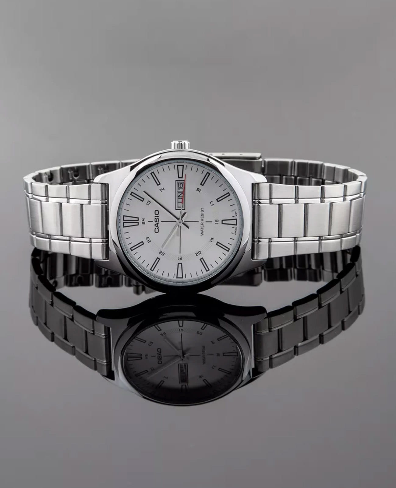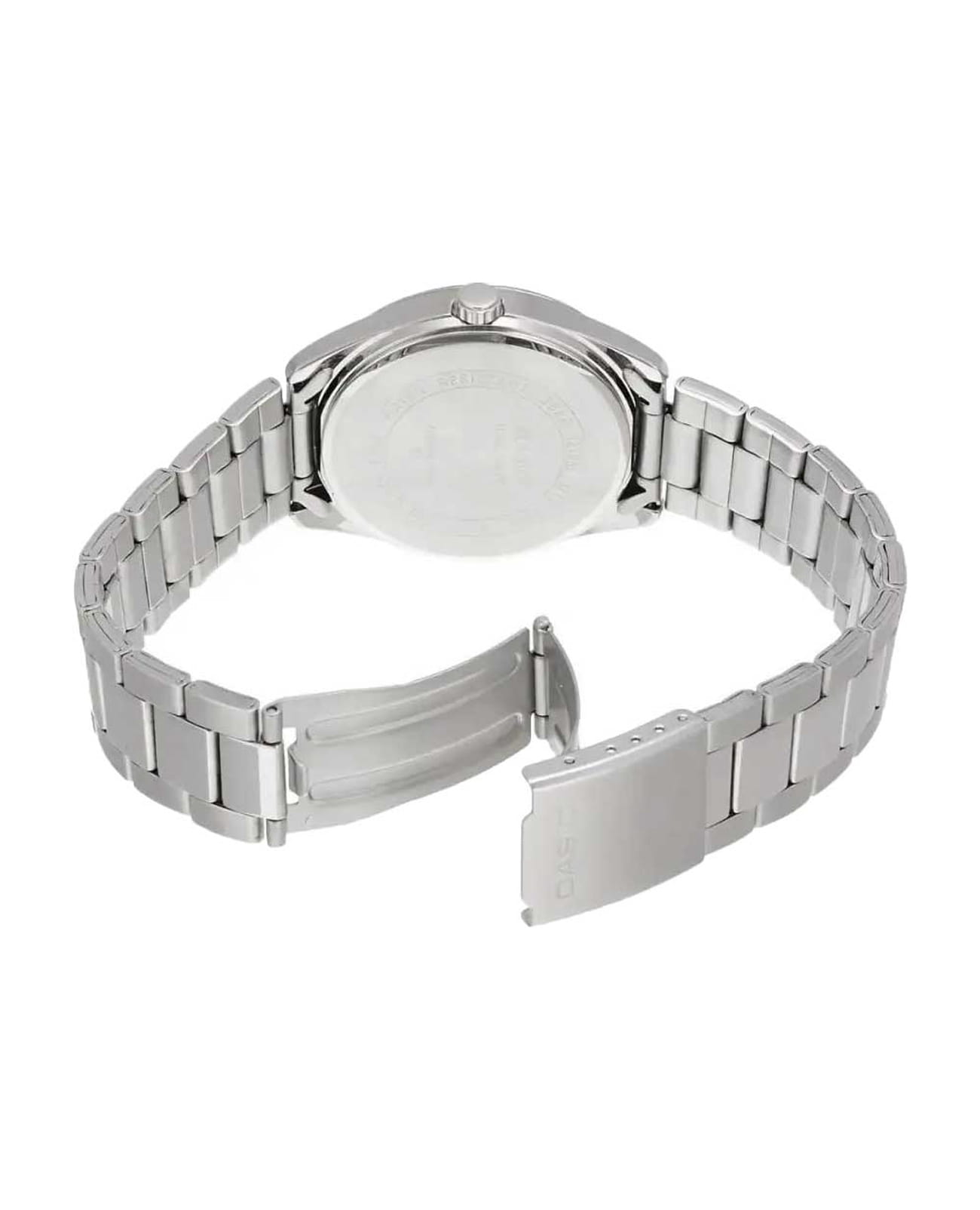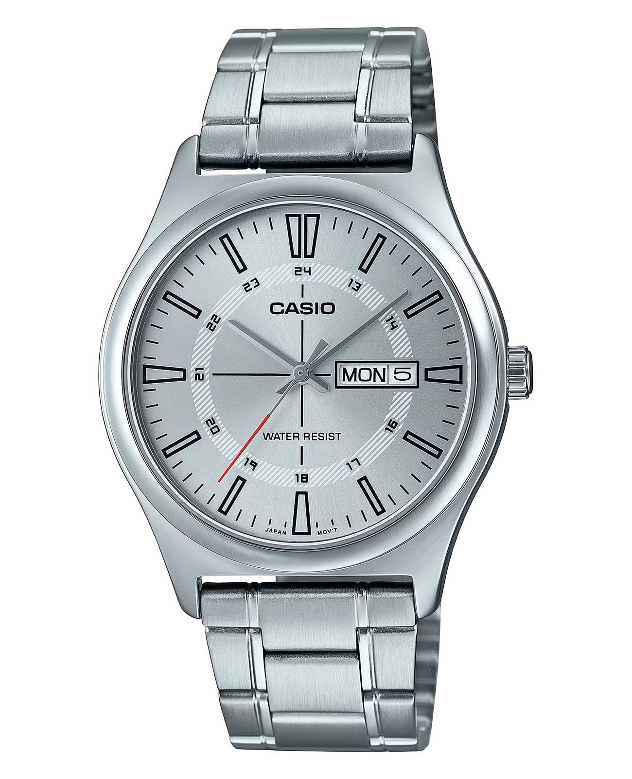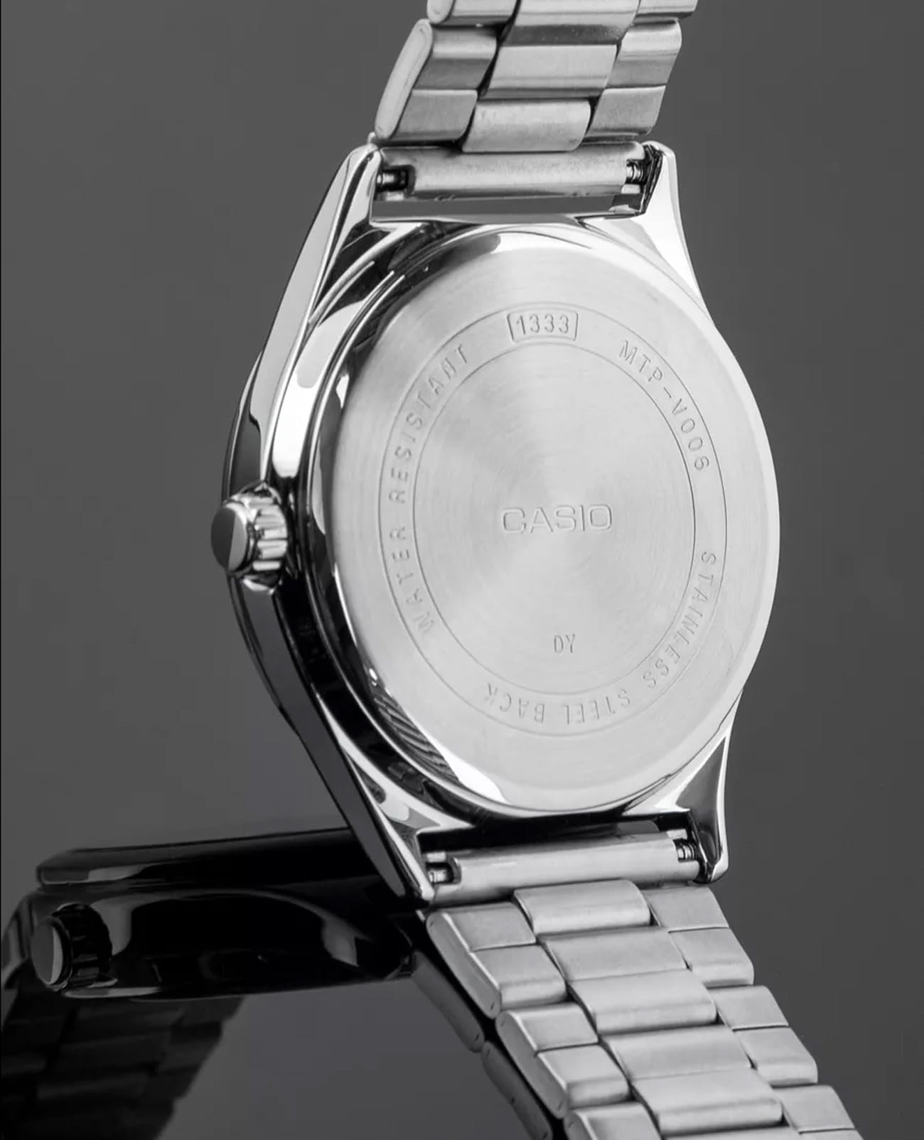 Японские мужские кварцевые часы с минеральным стекломМинеральное стеклоМинеральное стекло представляет собой искусственно выращенный минерал кварца. Такое стекло отличается особой устойчивостью к повреждениям и царапинам. Уступает по некоторым качествам сапфировому стеклу. Casio Collection MTP-V006D-7C, кварцевый механизм с высокой точностью. Корпус и браслет часов изготовлен из нержавеющей стали. Циферблат с метками в виде штрихов. Окошко даты находится в положении 3 часа. Класс водозащиты: 30 метров, позволит защитить корпус от случайных брызг или капель дождя. Стальной браслет на раскладной застёжкеРаскладная застёжкаТакой тип застёжки используется только на браслетах из металла. Она никогда не раскрывается полностью, происходит разделение на 2 и более частей. Раскладывающая застёжка снизит вероятность потери часов к минимуму..