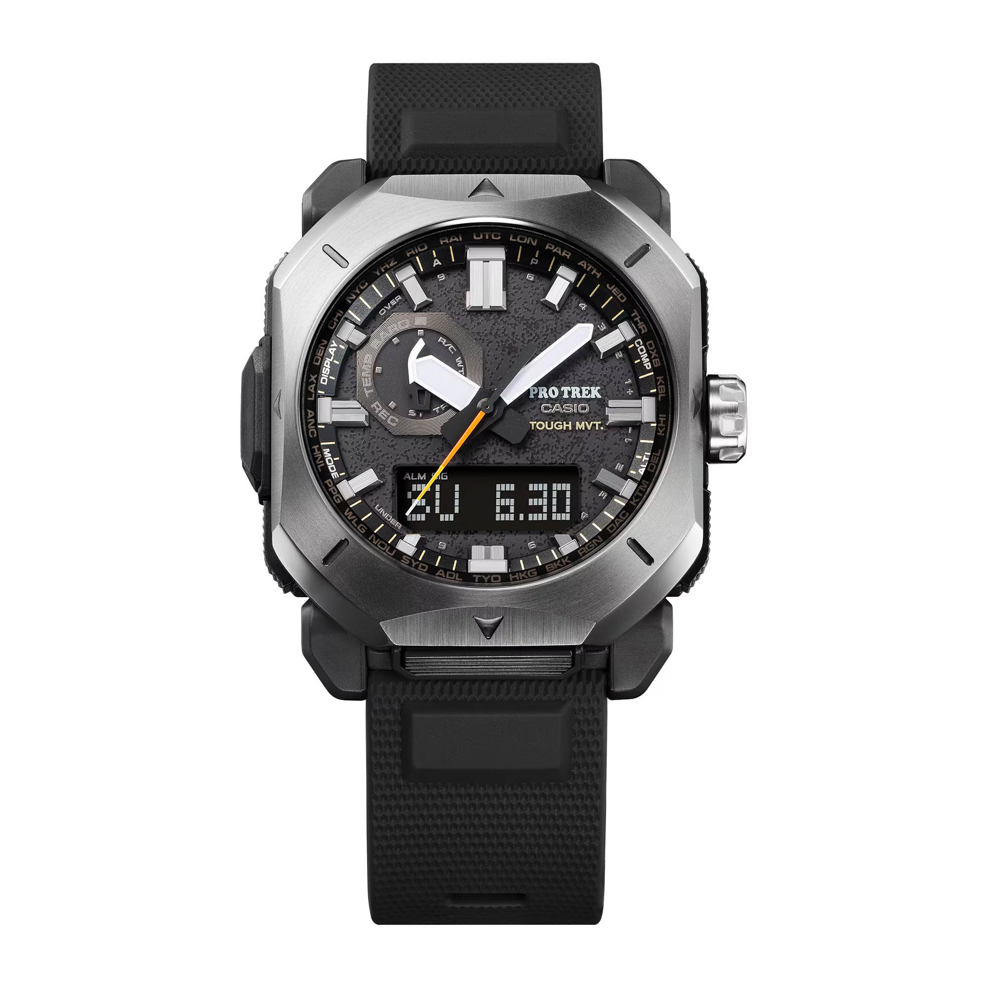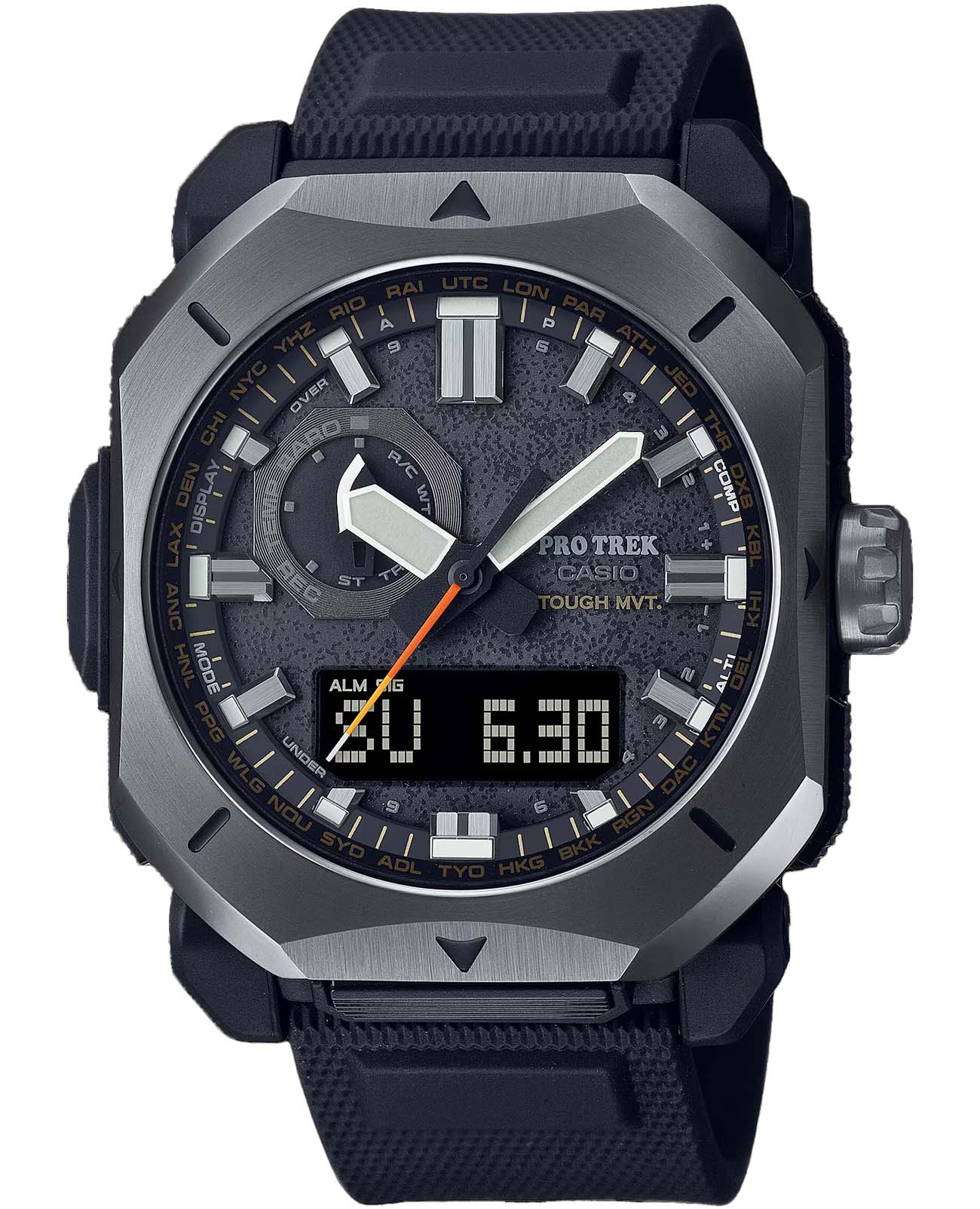 Часы премиум-класса для искателей приключений. Питание от солнечной энергии Tough SolarTough SolarТехнология основана на подзарядке аккумулятора от источника солнечного света, специальная панель улавливает солнечные лучи и преобразует их в энергию для работы часов. Достаточно пары минут нахождения на солнце для функционирования часов в течении суток. - солнечные батарейки большой мощности, индикатор заряда батареи. Функция автоматического сохранения энергии. Время работы аккумулятора без подзарядки - 6 месяцев, при включенной функции сохранения энергии - 25 месяцев. Модуль часов рассчитан на работу при низких температурах до -10°С/14°F. Двойная подсветка: одно нажатие кнопки обеспечит подсветку не только цифрового дисплея, но и аналогового циферблата. Благодаря наличию функции задержки, после отпускания кнопки освещение горит еще несколько секунд. Настраиваемое послесвечение 1,5 или 3сек. Цвет подсветки: белый. Необритовое светонакопительноеПодсветка NeobriteИспользование светонакопительных составов на основе сульфида цинка или алюмината стронция, яркий свет можно наблюдать на протяжении 6-10 часов после «зарядки» часов около источника света. покрытие обеспечивает длительное послесвечение в темноте даже после кратковременного нахождения на свету. 12-ти и 24-х часовой формат времени. СекундомерСекундомерСекундоме́р — прибор, способный измерять интервалы времени с точностью до долей секунды. с точностью показаний 1/100с и временем измерения 24ч. Сплит-хронографСплит-хронографИспользуется для измерения продолжительности нескольких временных отрезков, начинающихся одновременно, а заканчивающихся в разное время.. ТаймерТаймерОтсчитывает секунды в обратном направлении в заданном интервале времени. обратного отсчета от 1мин до 1ч. Мировое время Мировое время Полезное часовое усложнение, отображающее время в основных городах и известных областях по всему миру, оно связано с часовыми поясами, удобно для путешественников и бизнесменов. – 29 городов (29 часовых поясов), всемирное координированное время (UTCUTCВсемирное кординационное время, не имеющее привязки к географическому положению Гринвича, основывается на атомном отсчёте времени. Регулировка времени осуществляется более точно, чем устаревшее GMT.
