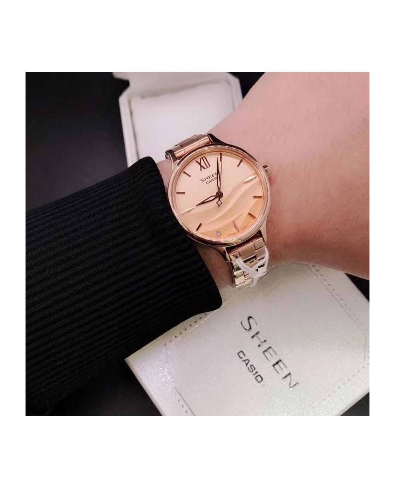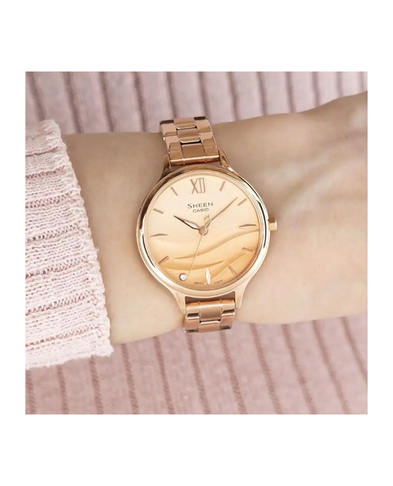 Японские женские часы с сапфировым стекломСапфировое стеклоПрочный и надёжный материал из кристалла сапфира синтетического происхождения, характеризующийся особой твёрдостью и устойчивостью к царапинам и повреждениям. Casio Sheen SHE-4550PG-4A, кварцевый механизм с высокой точностью. Яркий и привлекательный стиль этих часов гармонично дополнит ваш нежный образ. Корпус и браслет часов извотолвены из стали с IP-покрытиемIP-покрытиеМетод ионного напыления. Демонстрирует повышенную устойчивость к истиранию, окислению и химическим веществам. Под воздействием высокого давления и температуры около 1500°C молекулы металла надёжно соединяются с частицами корпуса часов.. Циферблат с текстурой морской волны, которая оставила свой след на фоне золотистого песка. У отметки семи часов циферблат дополнительно украшен кристаллом. Стрелки с люминесцентным покрытиемЛюминесцентное покрытиеПозволяет считывать показания времени в темноте. Производители наносят на стрелки, часовые индексы, безель или поверхность циферблата светонакопительный состав, дающий холодное свечение.. Класс водозащиты: 50 метров, позволит защитить корпус от случайных брызг или капель дождя. Браслет на раскладной застёжкеРаскладная застёжкаТакой тип застёжки используется только на браслетах из металла. Она никогда не раскрывается полностью, происходит разделение на 2 и более частей. Раскладывающая застёжка снизит вероятность потери часов к минимуму..
