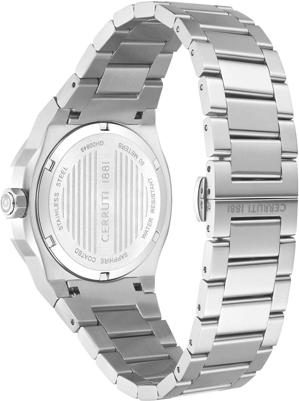 Cerruti 1881 CIWGH0084803 — утончённые мужские часы, в которых классика и современная геометрия нашли безупречный баланс. Стальной корпус с восьмигранным безелемБезельВнешний ободок, закрепляющий стекло. В спортивных часах так называется поворотное кольцо с делениями на циферблате, выполняет роль таймера – замеряет отрезки времени на шкале. Неподвижный безель – элемент декора. Однонаправленно вращающийся безель на дайверских часах позволяет фиксировать моменты погружения и выныривания на поверхность. подчёркивает архитектурную точность форм, а глубокий циферблат с гильошированным узором придаёт модели выразительную глубину. Индикаторы дня недели и даты оформлены в элегантных окнах на «12» и «3 часах», обеспечивая визуальную симметрию и удобство считывания. Прочные стрелки покрыты люминесцентным покрытиемЛюминесцентное покрытиеПозволяет считывать показания времени в темноте. Производители наносят на стрелки, часовые индексы, безель или поверхность циферблата светонакопительный состав, дающий холодное свечение., что гарантирует отличную читаемость даже в темноте. Циферблат защищён надёжным минеральным стекломМинеральное стеклоМинеральное стекло представляет собой искусственно выращенный минерал кварца. Такое стекло отличается особой устойчивостью к повреждениям и царапинам. Уступает по некоторым качествам сапфировому стеклу., устойчивым к царапинам, а стальной браслет фиксируется удобной застёжкой «бабочка»Застёжка "бабочка"Такой вид застёжки дополняется предохранителями, помогающими избежать случайного раскрытия браслета. Обладают изящным исполнением. , обеспечивающей комфорт и безопасность при носке. Строгая форма и продуманные детали делают эту модель идеальным выбором для мужчины, ценящего сдержанную роскошь и точность швейцарского стиля.