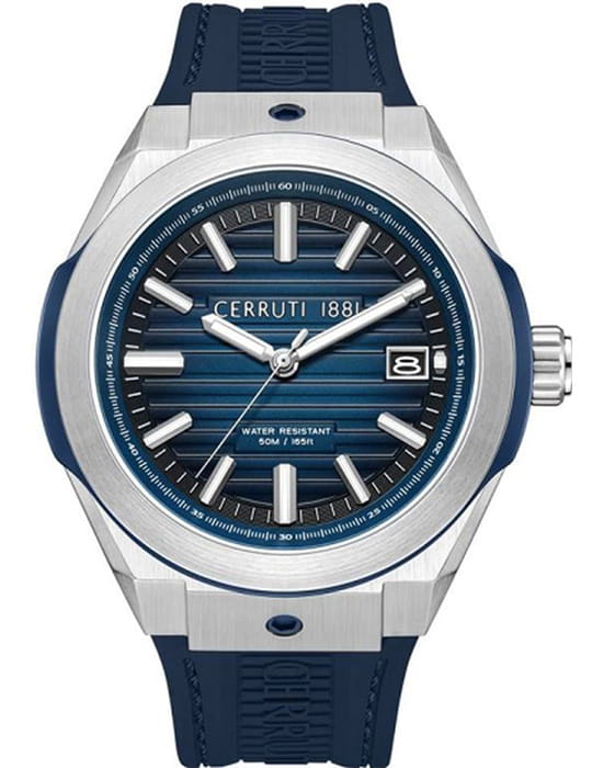 Cerruti 1881 CIWGN0042901 — выразительные мужские часы с характером, созданные в духе современной урбанистики. Массивный корпус из нержавеющей стали и геометричным безелемБезельВнешний ободок, закрепляющий стекло. В спортивных часах так называется поворотное кольцо с делениями на циферблате, выполняет роль таймера – замеряет отрезки времени на шкале. Неподвижный безель – элемент декора. Однонаправленно вращающийся безель на дайверских часах позволяет фиксировать моменты погружения и выныривания на поверхность. с частичным PVD-покрытиемPVDУльтратонкое покрытие наносится в технике вакуумного напыления, сочетает в себе нитрид титана особой прочности со слоем золота или оксида хрома. Несёт в себе декоративную или защитную функцию. подчёркивает силу и уверенность дизайна. Глубокий циферблат с горизонтальной текстурой дополняют чёткие метки и стрелки с люминесцентным покрытиемЛюминесцентное покрытиеПозволяет считывать показания времени в темноте. Производители наносят на стрелки, часовые индексы, безель или поверхность циферблата светонакопительный состав, дающий холодное свечение., обеспечивающие отличную читаемость даже в сумерках. Функциональное оформление включает окно даты на позиции «3 часов», подчёркивающую практичный характер модели. Прочное минеральное стеклоМинеральное стеклоМинеральное стекло представляет собой искусственно выращенный минерал кварца. Такое стекло отличается особой устойчивостью к повреждениям и царапинам. Уступает по некоторым качествам сапфировому стеклу. защищает циферблат, а эластичный силиконовый ремешок в тон циферблату обеспечивает комфорт и современный спортивный акцент. Cerruti 1881 — стильный аксессуар для мужчин, ценящих надёжность, функциональность и безупречное чувство стиля.