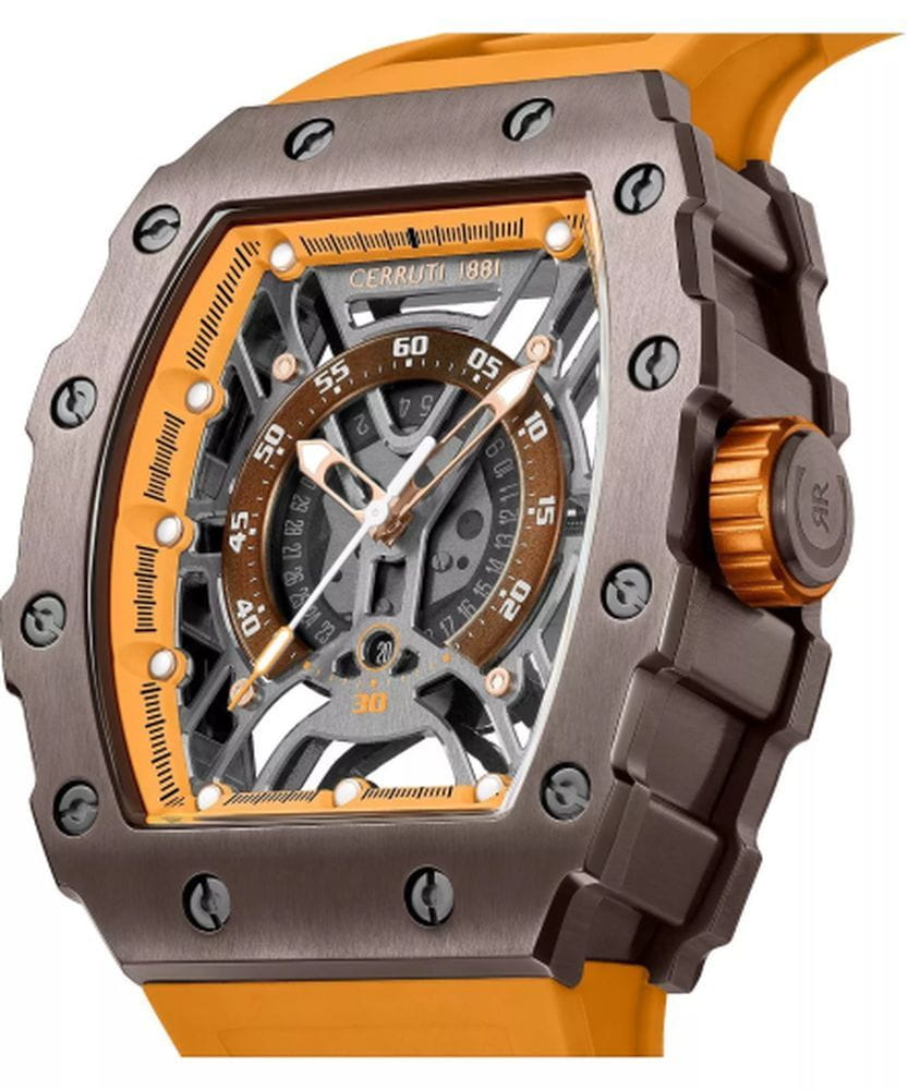 Cerruti 1881 CIWGN0057704 — эффектные мужские часы с дерзким современным дизайном, в которых сочетаются геометрическая точность линий и выразительная динамика формы. Корпус из нержавеющей стали с матовым PVD-покрытиемPVDУльтратонкое покрытие наносится в технике вакуумного напыления, сочетает в себе нитрид титана особой прочности со слоем золота или оксида хрома. Несёт в себе декоративную или защитную функцию. и мощным шестигранным безелемБезельВнешний ободок, закрепляющий стекло. В спортивных часах так называется поворотное кольцо с делениями на циферблате, выполняет роль таймера – замеряет отрезки времени на шкале. Неподвижный безель – элемент декора. Однонаправленно вращающийся безель на дайверских часах позволяет фиксировать моменты погружения и выныривания на поверхность. подчёркивает технический характер модели. Полупрозрачный скелетонизированный циферблат открывает детали механизма, придавая часам индустриальный и технологичный облик. Контрастные стрелки и метки с люминесцентным покрытиемЛюминесцентное покрытиеПозволяет считывать показания времени в темноте. Производители наносят на стрелки, часовые индексы, безель или поверхность циферблата светонакопительный состав, дающий холодное свечение. обеспечивают отличную читаемость, а прочное минеральное стеклоМинеральное стеклоМинеральное стекло представляет собой искусственно выращенный минерал кварца. Такое стекло отличается особой устойчивостью к повреждениям и царапинам. Уступает по некоторым качествам сапфировому стеклу. защищает композицию от внешних воздействий. Эластичный силиконовый ремешок гармонично сочетается с оттенками корпуса и обеспечивает комфорт при ежедневном ношении. Cerruti 1881 — это смелое воплощение итальянского стиля в спортивно-индустриальной эстетике, созданное для мужчин, уверенно идущих в ногу с временем.