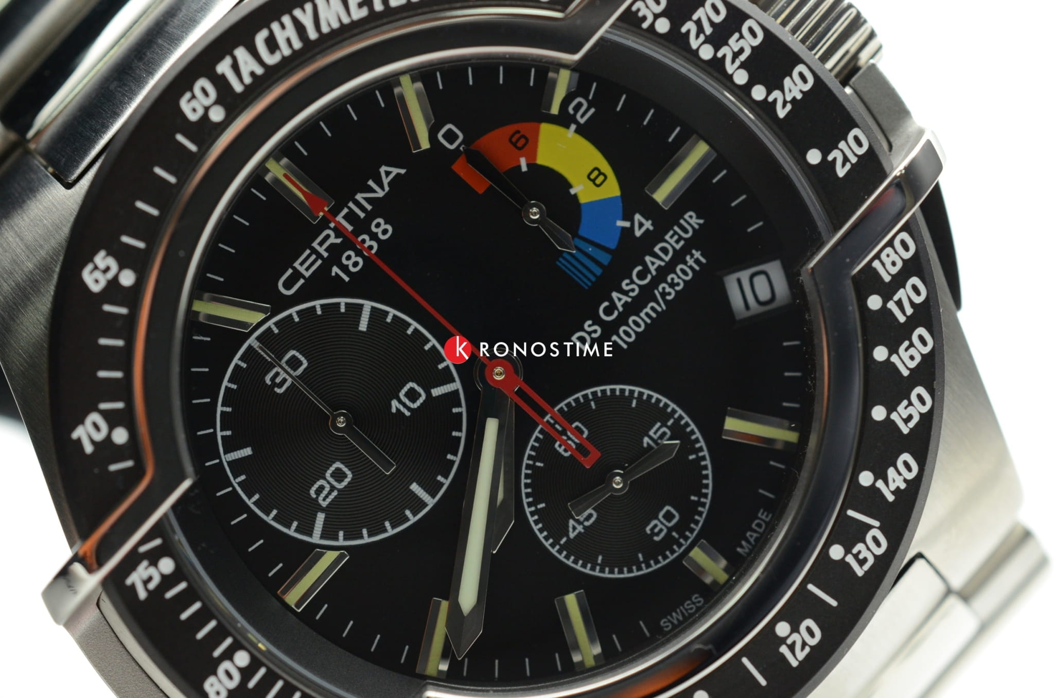 Надёжный корпус основан на концепции Двойной Надёжности DSDS ConceptDouble Security Concept, обозначает двойную надёжность и безупречную точность часов Certina. Двойная система защиты подразумевает обеспечение максимальной устойчивости к ударам и высоких показателей водонепроницаемости., выполнен из стали 316L с частичным PVD-финишемPVDУльтратонкое покрытие наносится в технике вакуумного напыления, сочетает в себе нитрид титана особой прочности со слоем золота или оксида хрома. Несёт в себе декоративную или защитную функцию.. Модель оснащена тахиметромТахиметрРазмеченная шкала, располагается на ободке или безеле часов. Тахиметр позволяет рассчитать скорость на определённом участке пути, расстояние измеряется в километрах или милях., секундомером, календарём, хронографомХронографФункция позволяет измерять отрезки времени с особой точностью: часы, минуты, секунды. Верным признаком хронографа является наличие на циферблате 3 дополнительных окошек-счётчиков.. Работу часов обеспечивает швейцарский кварцевый калибр ETA G10.211.