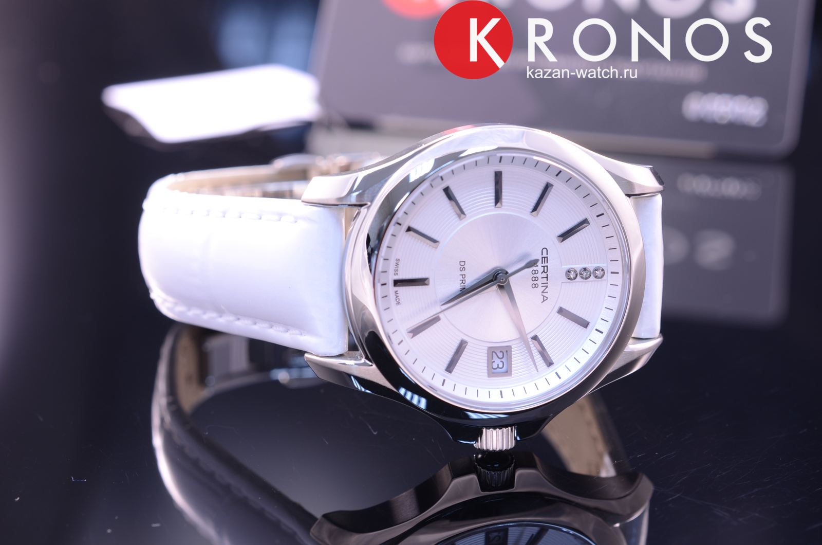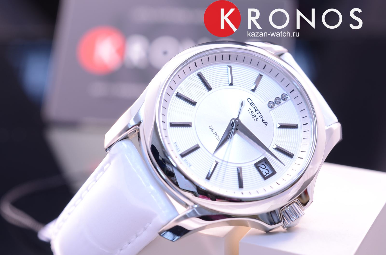 Вместо метки 12 часов использованы бриллианты оттенка Top Wesselton. Стальной корпус основан на концепции Двойной надёжности DS ConceptDS ConceptDouble Security Concept, обозначает двойную надёжность и безупречную точность часов Certina. Двойная система защиты подразумевает обеспечение максимальной устойчивости к ударам и высоких показателей водонепроницаемости.. Часы оснащены кварцевым швейцарским калибром ETA F05.111. Белый ремешок выполнен из натуральной кожи.
