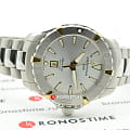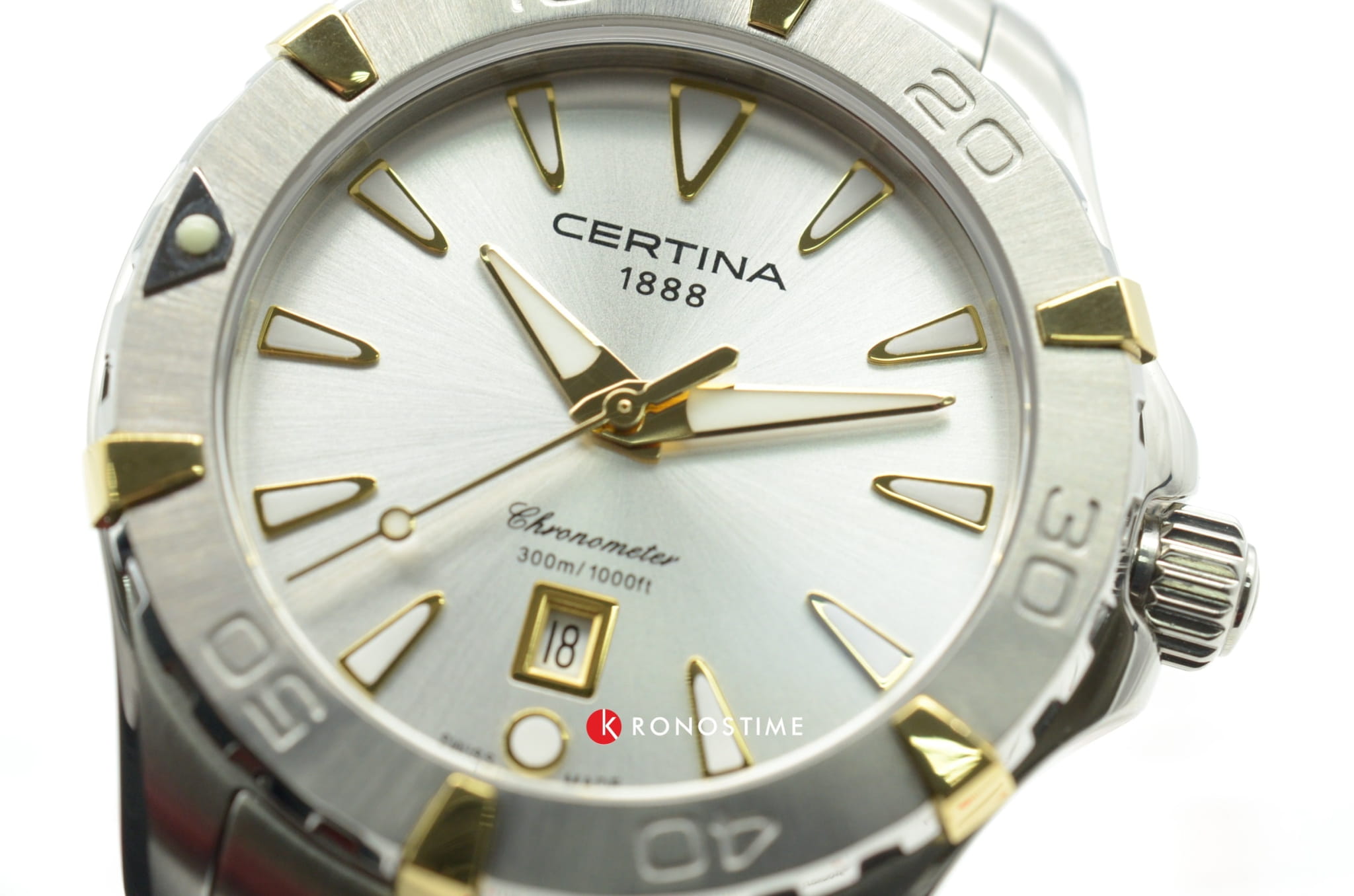 Компактный циферблат дополнен золотистыми элементами, показатели видны максимально чётко. Изящный аксессуар внутри просто «кремень», чему способствует система DS ConceptDS ConceptDouble Security Concept, обозначает двойную надёжность и безупречную точность часов Certina. Двойная система защиты подразумевает обеспечение максимальной устойчивости к ударам и высоких показателей водонепроницаемости.: водонепроницаемость 300 метров, завинчивающаяся задняя крышка и заводная головка с системой блокировки, сапфировое стекло, хирургическая сталь 316L. Швейцарский кварцевый механизм ETA F04.411 Precidrive™Precidrive™Инновационный кварцевый механизм Certina. Часы, оснащённые этим швейцарским калибром, приравниваются к точности к сертифицированным хронометрам, точность хода составляет +/-10 секунд в год. отмечен сертификатом хронометра COSCСертификат COSCОфициальный сертификат, подтверждающий то, что часы ходят с особо высокой точностью. Для получения документа часы подвергаются тестовым испытаниям, разработанным швейцарским институтом тестирования хронометров COSC. Допустимая норма для механических часов -4/+6 секунд в день, для кварцевых моделей +/- 0,07 секунд в день. за безупречную точность хода. Частичное PVD-покрытиеPVDУльтратонкое покрытие наносится в технике вакуумного напыления, сочетает в себе нитрид титана особой прочности со слоем золота или оксида хрома. Несёт в себе декоративную или защитную функцию.. Вращающийся безельБезельВнешний ободок, закрепляющий стекло. В спортивных часах так называется поворотное кольцо с делениями на циферблате, выполняет роль таймера – замеряет отрезки времени на шкале. Неподвижный безель – элемент декора. Однонаправленно вращающийся безель на дайверских часах позволяет фиксировать моменты погружения и выныривания на поверхность.. Яркая люминесцентная подсветкаЛюминесцентное покрытиеПозволяет считывать показания времени в темноте. Производители наносят на стрелки, часовые индексы, безель или поверхность циферблата светонакопительный состав, дающий холодное свечение.. Апертура даты, функция EOLEOLПредставляет собой систему, уведомляющую владельца часов о необходимости замены элемента питания. За 2 недели до полного разряда батарейки секундная стрелка перестаёт ходить чётко и начинает перепрыгивать на 3-4 деления.. Диаметр корпуса: 34 мм.