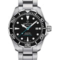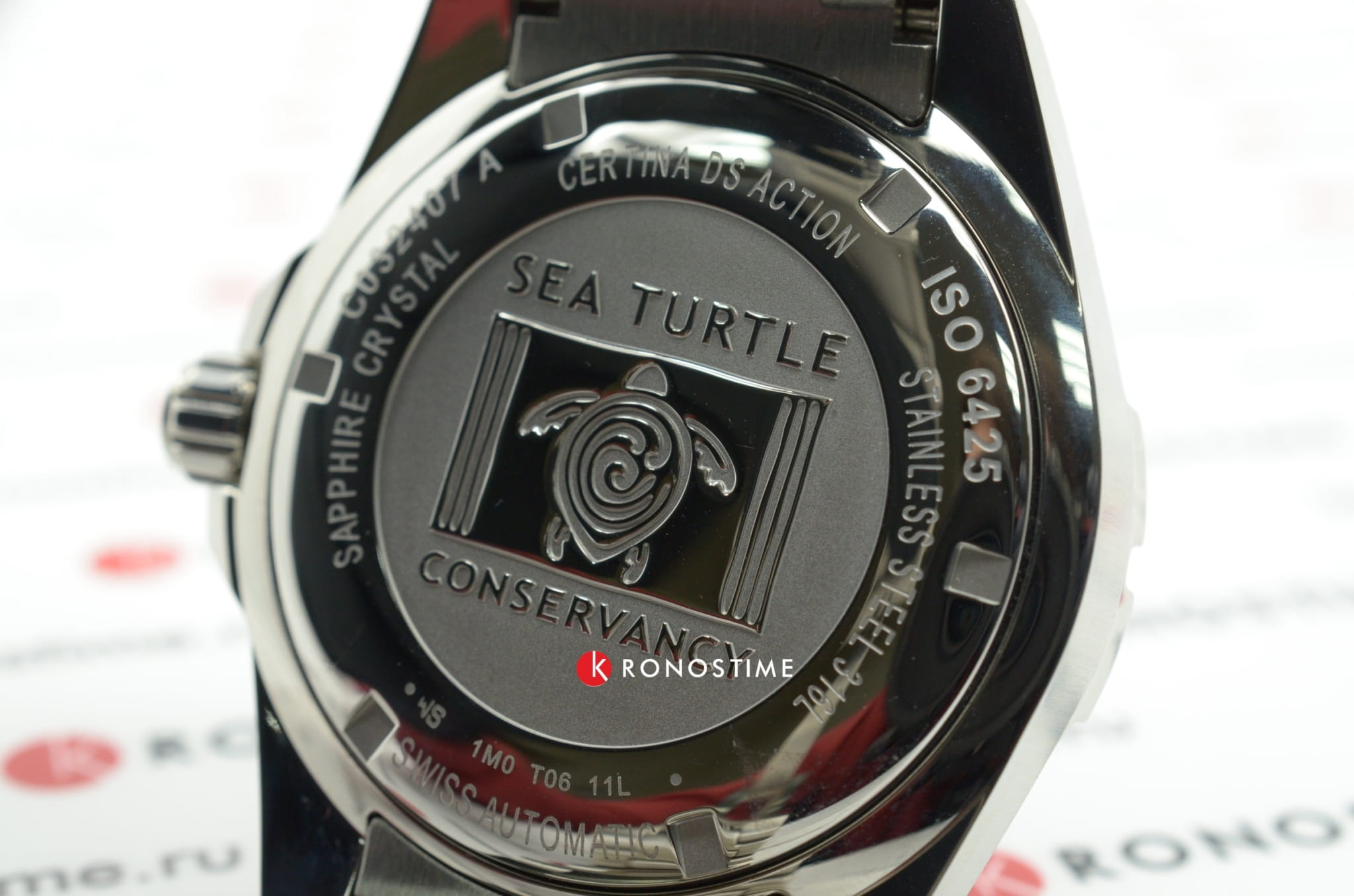 Аксессуар Special Edition посвящён крепкому сотрудничеству бренда и организации по спасению черепах Sea Turtle Conservancy. Об этом свидетельствует гравировка на задней крышке. Модель в сдержанной расцветке имеет яркий акцент в виде голубой секундной стрелки. Крупная индикация времени позволяет считывать показания с циферблата в любой ситуации. Автоматический швейцарский калибр ETA Powermatic 80Powermatic 80Эксклюзивный калибр от швейцарской компании ETA с увеличенным запасом хода до 80 часов за счёт удлинённой заводной пружины. Характеризуется улучшенной системой спуска со сниженным трением. с резервом хода на 80 часов. Концепция DS ConceptDS ConceptDouble Security Concept, обозначает двойную надёжность и безупречную точность часов Certina. Двойная система защиты подразумевает обеспечение максимальной устойчивости к ударам и высоких показателей водонепроницаемости.. Сапфировое стекло. Алюминиевый вращающийся безельБезельВнешний ободок, закрепляющий стекло. В спортивных часах так называется поворотное кольцо с делениями на циферблате, выполняет роль таймера – замеряет отрезки времени на шкале. Неподвижный безель – элемент декора. Однонаправленно вращающийся безель на дайверских часах позволяет фиксировать моменты погружения и выныривания на поверхность.. Водонепроницаемость 300 метров. Люминесцентная подсветкаЛюминесцентное покрытиеПозволяет считывать показания времени в темноте. Производители наносят на стрелки, часовые индексы, безель или поверхность циферблата светонакопительный состав, дающий холодное свечение.. Стальной браслет с застёжкой, имеющей удлинение для дайверовУдлинение для дайверовЗастёжка с удлинением для дайверов представляет собой безопасное крепление, которое позволяет надевать часы поверх гидрокостюма. Гибкая застёжка удлиняется на 1-2 миллиметра.. Апертура даты. Диаметр корпуса: 43 мм.