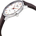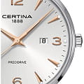 Наручные часы представлены в надёжном стальном корпусе, за прочность не стоит беспокоиться, ведь модель сделана в соответствии с системой DS ConceptDS ConceptDouble Security Concept, обозначает двойную надёжность и безупречную точность часов Certina. Двойная система защиты подразумевает обеспечение максимальной устойчивости к ударам и высоких показателей водонепроницаемости.. Серебристый циферблат дополнен стрелками и метками в цвете розового золота, что обеспечивает оптимальную читаемость показателей. Кварцевый швейцарский механизм ETA F05.411 Precidrive™Precidrive™Инновационный кварцевый механизм Certina. Часы, оснащённые этим швейцарским калибром, приравниваются к точности к сертифицированным хронометрам, точность хода составляет +/-10 секунд в год.. Ремешок из натуральной кожи с тиснением. Сапфировое стекло с антибликовым покрытием, устойчивое к царапинам. Водостойкость 100 метров. Отображение числа, индикатор EOLEOLПредставляет собой систему, уведомляющую владельца часов о необходимости замены элемента питания. За 2 недели до полного разряда батарейки секундная стрелка перестаёт ходить чётко и начинает перепрыгивать на 3-4 деления.. Диаметр корпуса: 39 мм.