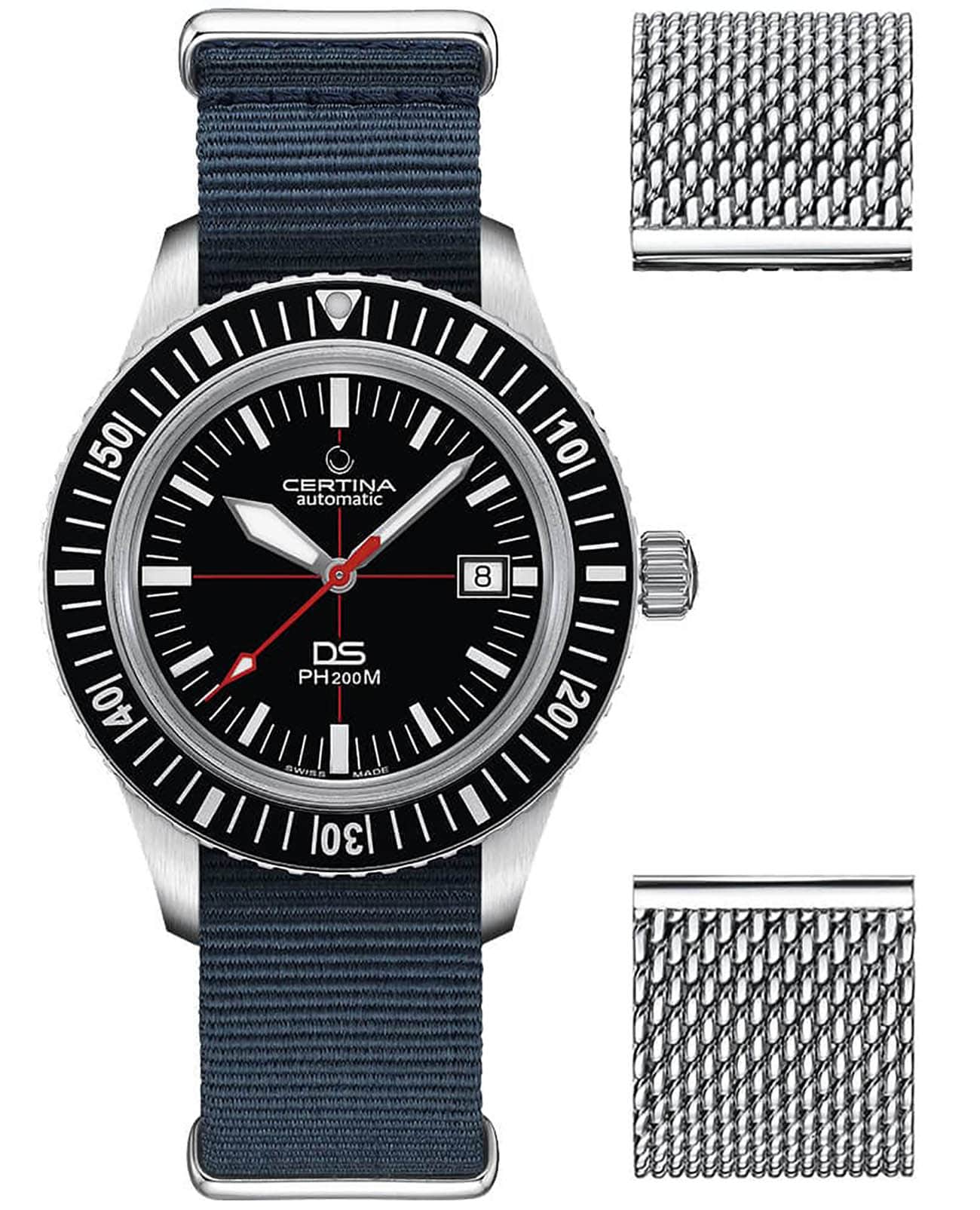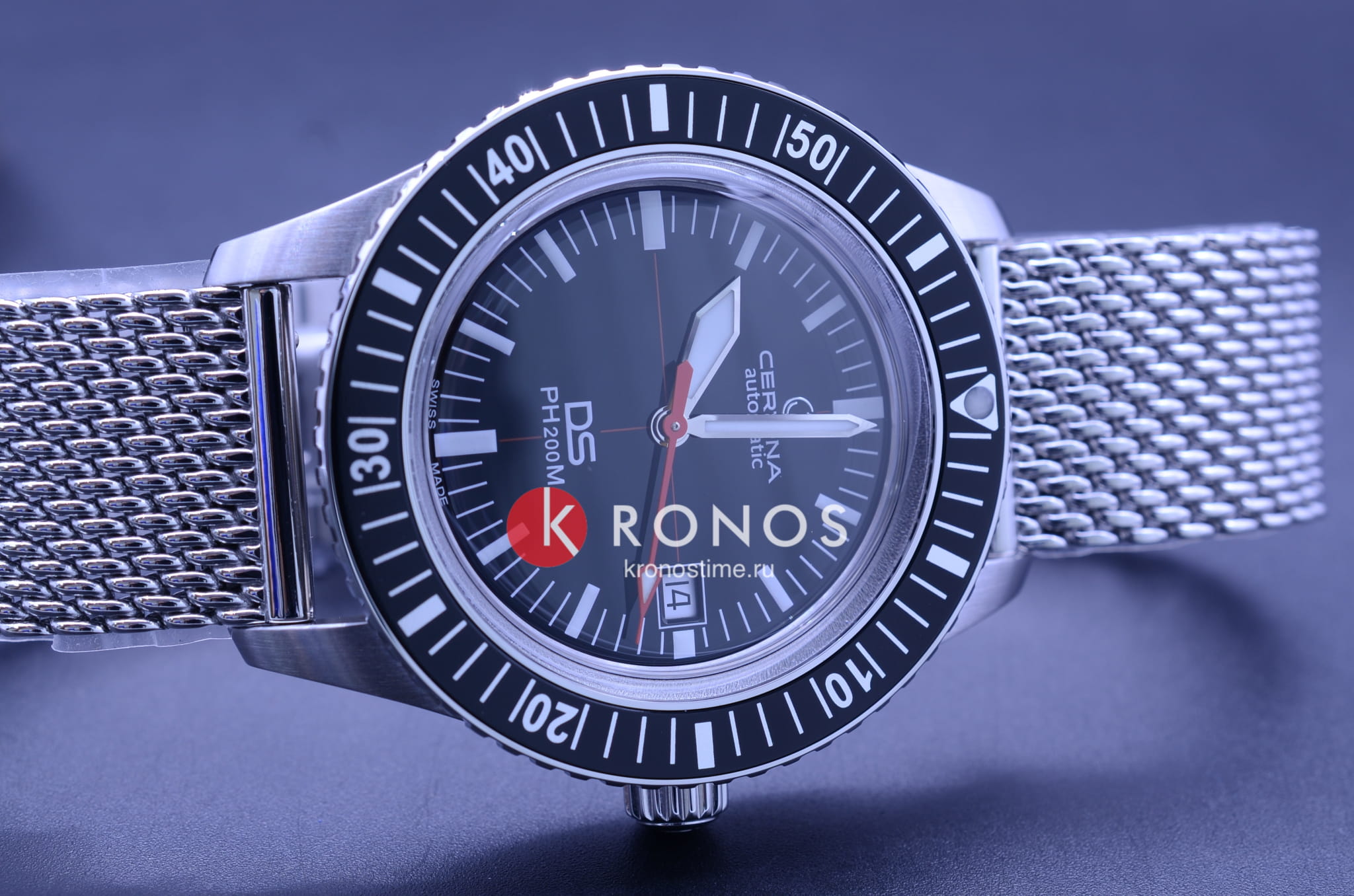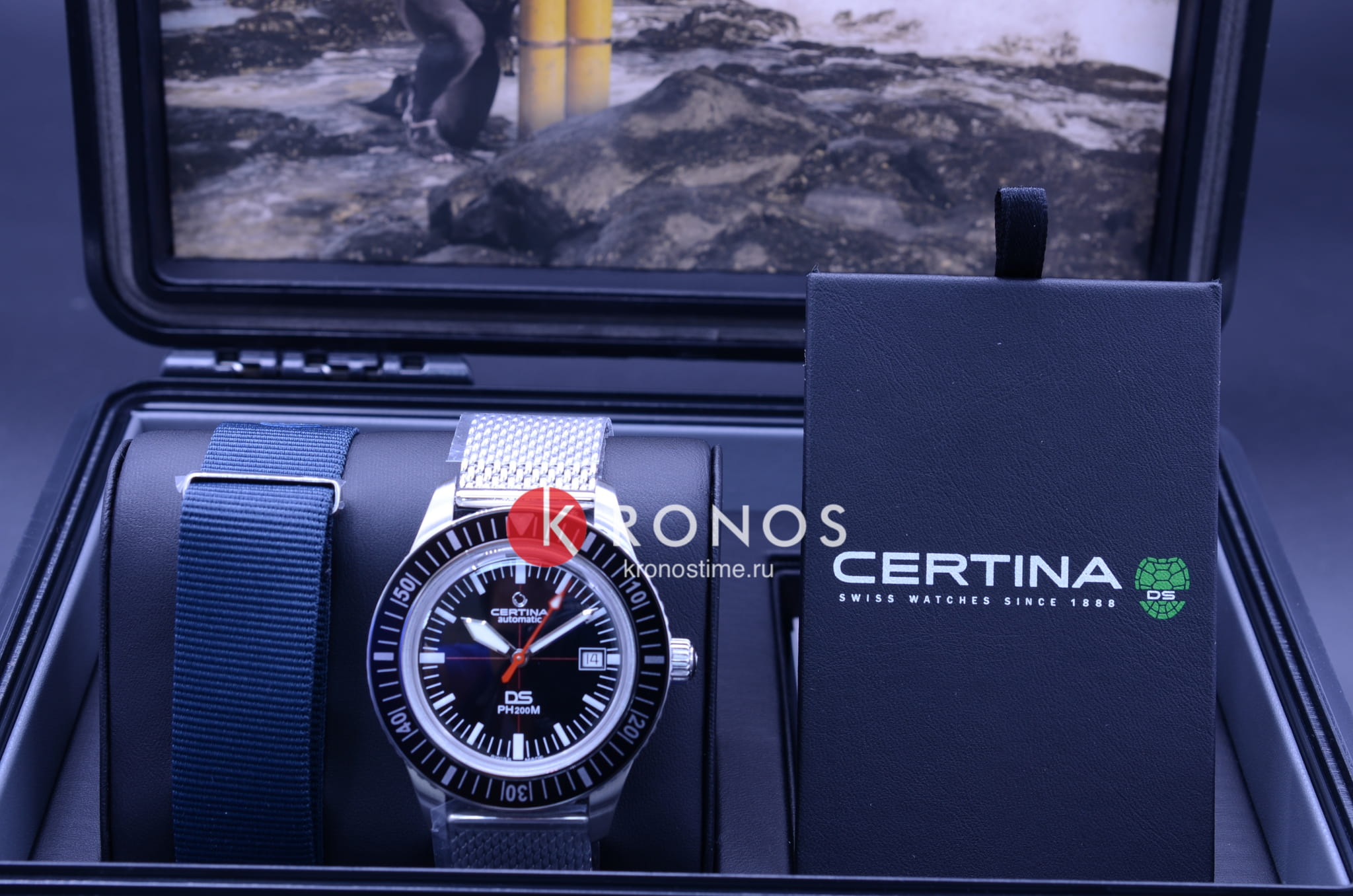 Оригинальный чёрный циферблат понравится ценителям ретро-дизайна. В комплекте с тканевым ремешком вы получаете дополнительный вариант из стали. Меняя их, вы можете экспериментировать с разными стилями. Уникальностью обладает не только аксессуар, но и упаковка, сделанная в виде бокса для дайвинга. Часы комплектуются автоматическим механизмом ETA Powermatic 80Powermatic 80Эксклюзивный калибр от швейцарской компании ETA с увеличенным запасом хода до 80 часов за счёт удлинённой заводной пружины. Характеризуется улучшенной системой спуска со сниженным трением. с 80-часовым запасом хода. Технология DS ConceptDS ConceptDouble Security Concept, обозначает двойную надёжность и безупречную точность часов Certina. Двойная система защиты подразумевает обеспечение максимальной устойчивости к ударам и высоких показателей водонепроницаемости.. Стекло с покрытием Nex scratchguard, устойчивым к царапинам. Вращающийся безельБезельВнешний ободок, закрепляющий стекло. В спортивных часах так называется поворотное кольцо с делениями на циферблате, выполняет роль таймера – замеряет отрезки времени на шкале. Неподвижный безель – элемент декора. Однонаправленно вращающийся безель на дайверских часах позволяет фиксировать моменты погружения и выныривания на поверхность.. Диаметр корпуса: 42,8 мм.