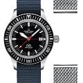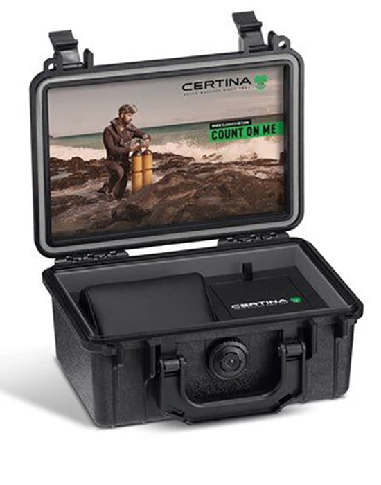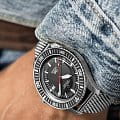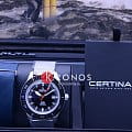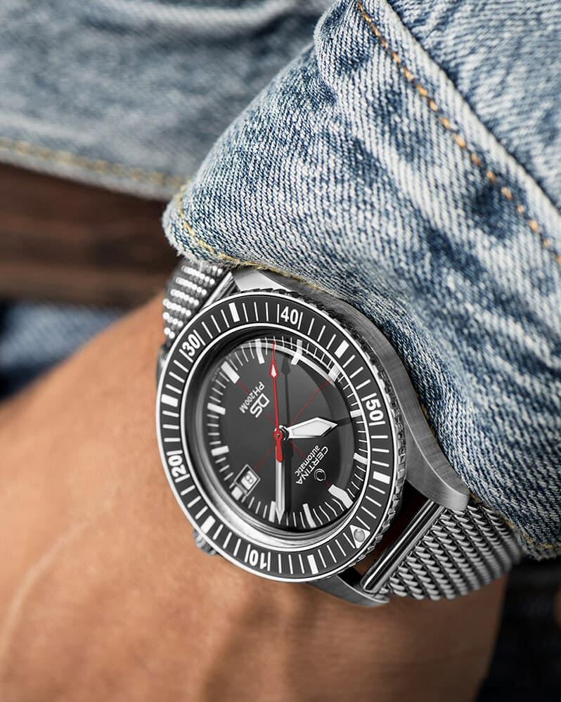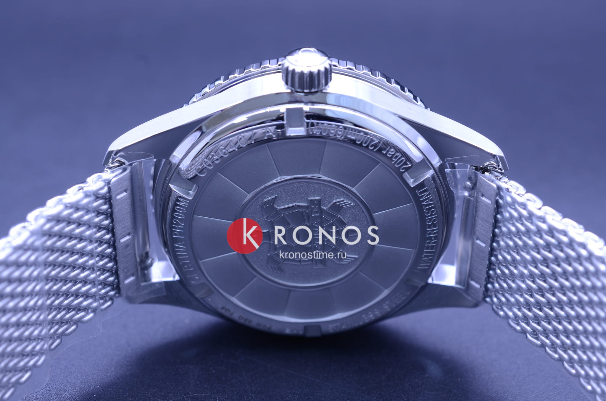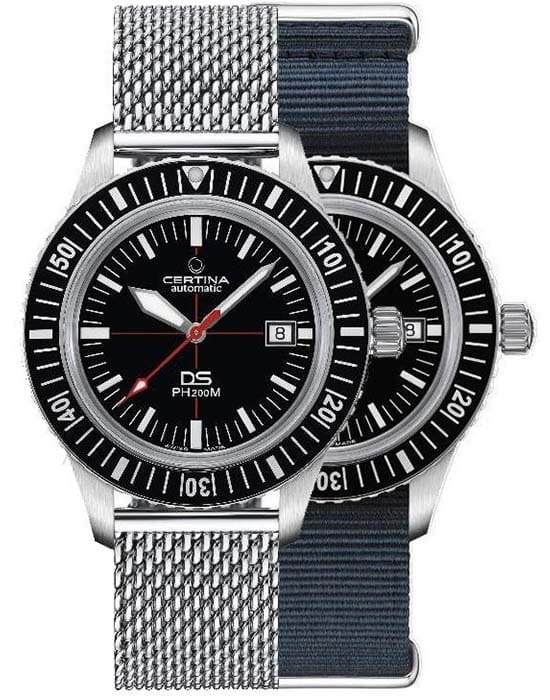 Оригинальный чёрный циферблат понравится ценителям ретро-дизайна. В комплекте с тканевым ремешком вы получаете дополнительный вариант из стали. Меняя их, вы можете экспериментировать с разными стилями. Уникальностью обладает не только аксессуар, но и упаковка, сделанная в виде бокса для дайвинга. Часы комплектуются автоматическим механизмом ETA Powermatic 80Powermatic 80Эксклюзивный калибр от швейцарской компании ETA с увеличенным запасом хода до 80 часов за счёт удлинённой заводной пружины. Характеризуется улучшенной системой спуска со сниженным трением. с 80-часовым запасом хода. Технология DS ConceptDS ConceptDouble Security Concept, обозначает двойную надёжность и безупречную точность часов Certina. Двойная система защиты подразумевает обеспечение максимальной устойчивости к ударам и высоких показателей водонепроницаемости.. Стекло с покрытием Nex scratchguard, устойчивым к царапинам. Вращающийся безельБезельВнешний ободок, закрепляющий стекло. В спортивных часах так называется поворотное кольцо с делениями на циферблате, выполняет роль таймера – замеряет отрезки времени на шкале. Неподвижный безель – элемент декора. Однонаправленно вращающийся безель на дайверских часах позволяет фиксировать моменты погружения и выныривания на поверхность.. Диаметр корпуса: 42,8 мм.