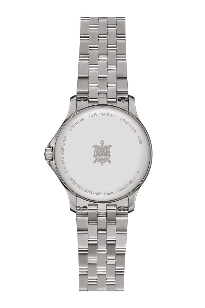 Швейцарские женские часы Certina DS-8 Lady C045.010.44.081.00 из коллекции DS-8 выглядят стильно и гламурно, модель добавит изящества в повседневный образ. Титановый браслет из нескольких рядов переплетающихся звеньев элегантно выглядит на запястье. Ударопрочность и водонепроницаемость 10 бар – концепция DS ConceptDS ConceptDouble Security Concept, обозначает двойную надёжность и безупречную точность часов Certina. Двойная система защиты подразумевает обеспечение максимальной устойчивости к ударам и высоких показателей водонепроницаемости.. Одностороннее антибликовое покрытие стекла из сапфира. Титановый браслет на застёжке-бабочке с кнопкамиЗастёжка "бабочка"Такой вид застёжки дополняется предохранителями, помогающими избежать случайного раскрытия браслета. Обладают изящным исполнением. . Индикация текущего числа, функция EOLEOLПредставляет собой систему, уведомляющую владельца часов о необходимости замены элемента питания. За 2 недели до полного разряда батарейки секундная стрелка перестаёт ходить чётко и начинает перепрыгивать на 3-4 деления.. Диаметр корпуса: 31 мм. Производство и сборка: Швейцария.