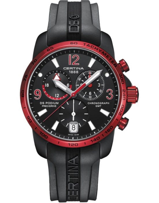 Модель обладает полезным функционалом: хронографХронографФункция позволяет измерять отрезки времени с особой точностью: часы, минуты, секунды. Верным признаком хронографа является наличие на циферблате 3 дополнительных окошек-счётчиков., секундомер, GMTGMTОтображение времени второго часового пояса.Такая функция особенно актуальна для путешественников и бизнесменов,которые общаются с людьми из разных стран,теперь вы всегда будете знать,какой час у вашего партнёра или близкого человека., календарь, тахиметрТахиметрРазмеченная шкала, располагается на ободке или безеле часов. Тахиметр позволяет рассчитать скорость на определённом участке пути, расстояние измеряется в километрах или милях.. Швейцарский кварцевый калибр G10.962 BF Precidrive™Precidrive™Инновационный кварцевый механизм Certina. Часы, оснащённые этим швейцарским калибром, приравниваются к точности к сертифицированным хронометрам, точность хода составляет +/-10 секунд в год.. Сверхлёгкий алюминиевый корпус красного цвета. Каучуковый ремешок. Сапфировое стекло.