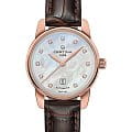 Женская модель, индикация часов, минут, секунд центральными стрелками. Окошко даты в положении 6 часов. Циферблат выполнен из натурального перламутра и украшен бриллиантами.