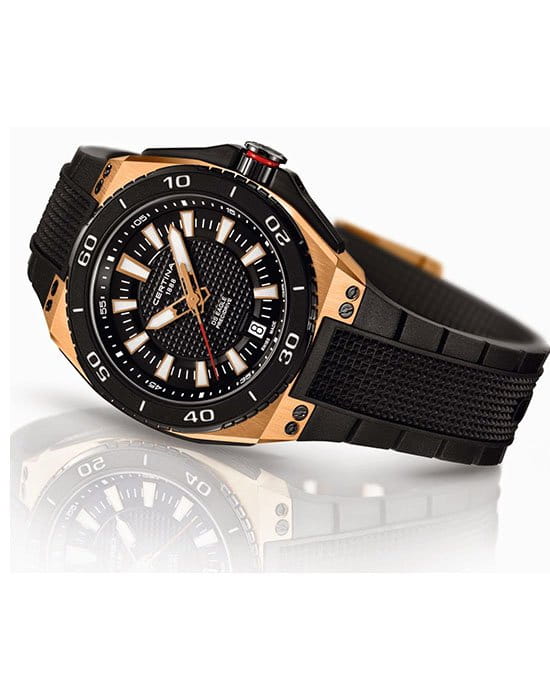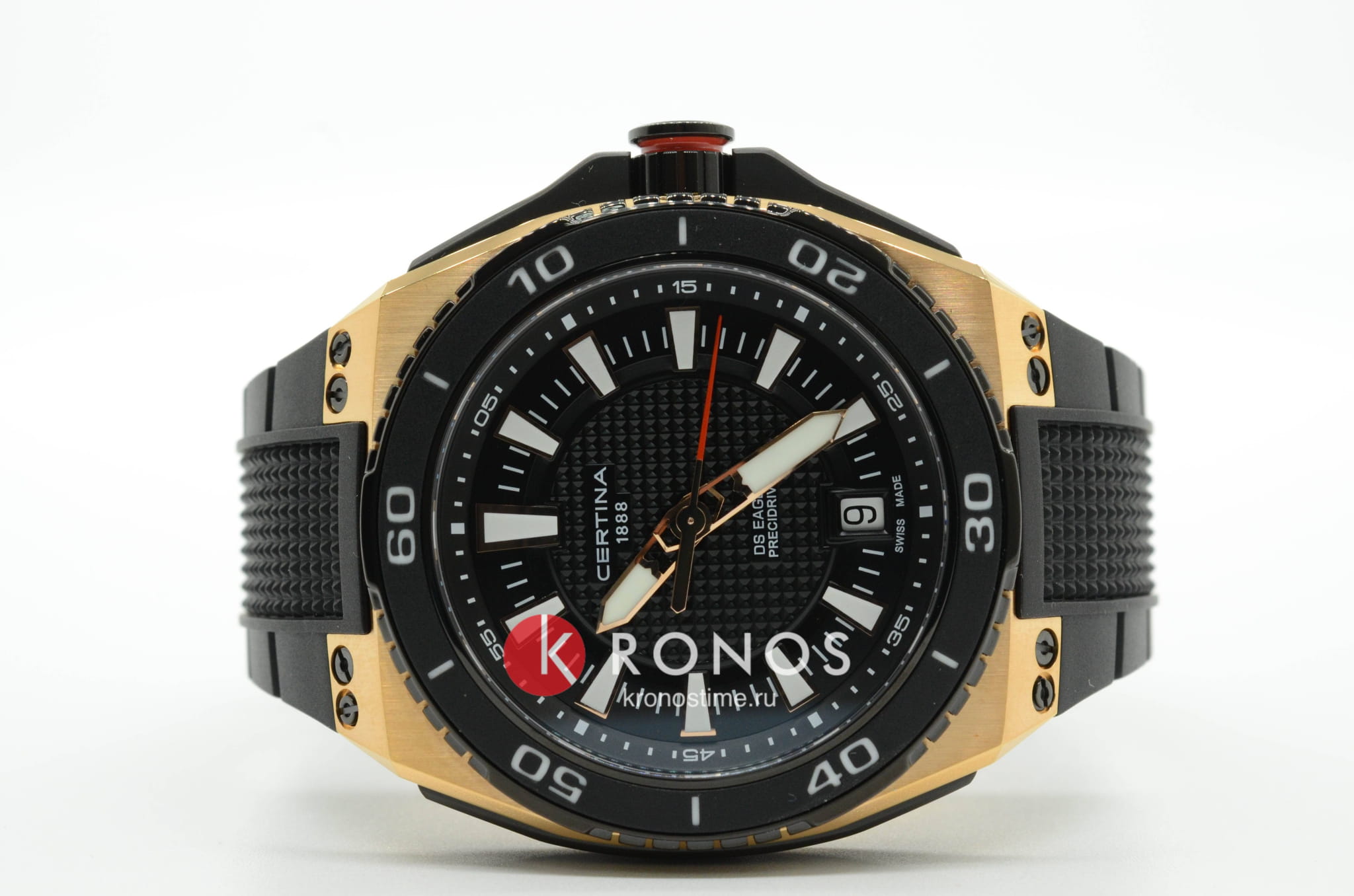 Аксессуар в спортивном стиле оснащён швейцарским кварцевым калибром ETA F07.411 Precidrive™Precidrive™Инновационный кварцевый механизм Certina. Часы, оснащённые этим швейцарским калибром, приравниваются к точности к сертифицированным хронометрам, точность хода составляет +/-10 секунд в год.. Часы основаны на концепции Двойной Надёжности DS ConceptDS ConceptDouble Security Concept, обозначает двойную надёжность и безупречную точность часов Certina. Двойная система защиты подразумевает обеспечение максимальной устойчивости к ударам и высоких показателей водонепроницаемости.. Стальной корпус защищён PVD-покрытиемPVDУльтратонкое покрытие наносится в технике вакуумного напыления, сочетает в себе нитрид титана особой прочности со слоем золота или оксида хрома. Несёт в себе декоративную или защитную функцию. золотистого цвета. Ремешок сделан из прочного, надёжного каучука.