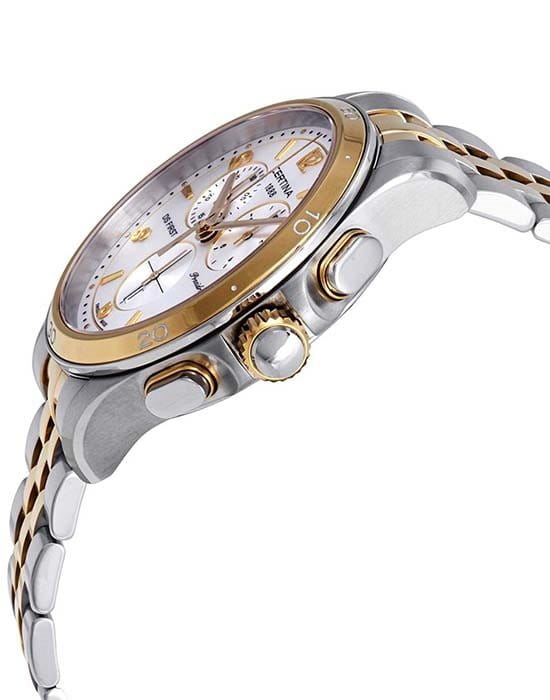 Модель работает за счёт швейцарского кварцевого калибра ETA G15.212 Precidrive™Precidrive™Инновационный кварцевый механизм Certina. Часы, оснащённые этим швейцарским калибром, приравниваются к точности к сертифицированным хронометрам, точность хода составляет +/-10 секунд в год.. Ударопрочный корпусУдаропрочный корпусМеханизм заключён в корпус, выполненный из современных материалов, устойчивых к ударам, механическим повреждениям и падению с высоты: инновационный пластик, карбон, нержавеющая сталь, титан. и браслет изготовлены из стали 316L с золотистым PVD-покрытиемPVDУльтратонкое покрытие наносится в технике вакуумного напыления, сочетает в себе нитрид титана особой прочности со слоем золота или оксида хрома. Несёт в себе декоративную или защитную функцию.. Часы оснащены секундомером, календарём, индикатором EOLEOLПредставляет собой систему, уведомляющую владельца часов о необходимости замены элемента питания. За 2 недели до полного разряда батарейки секундная стрелка перестаёт ходить чётко и начинает перепрыгивать на 3-4 деления.. Стекло из сапфира имеет антибликовое покрытие.