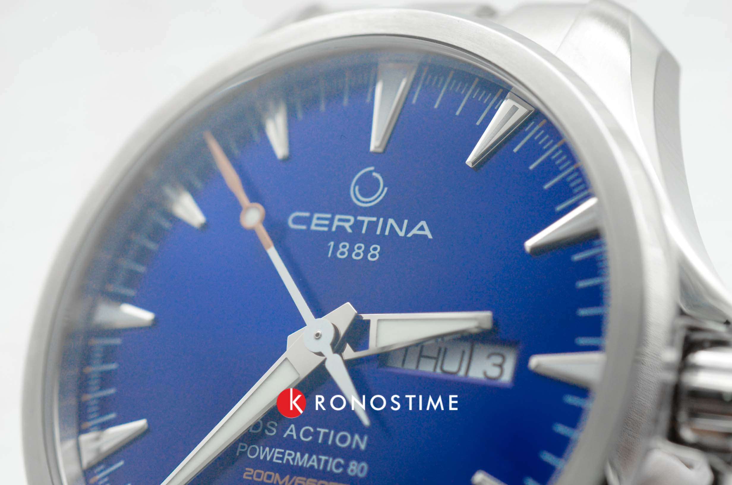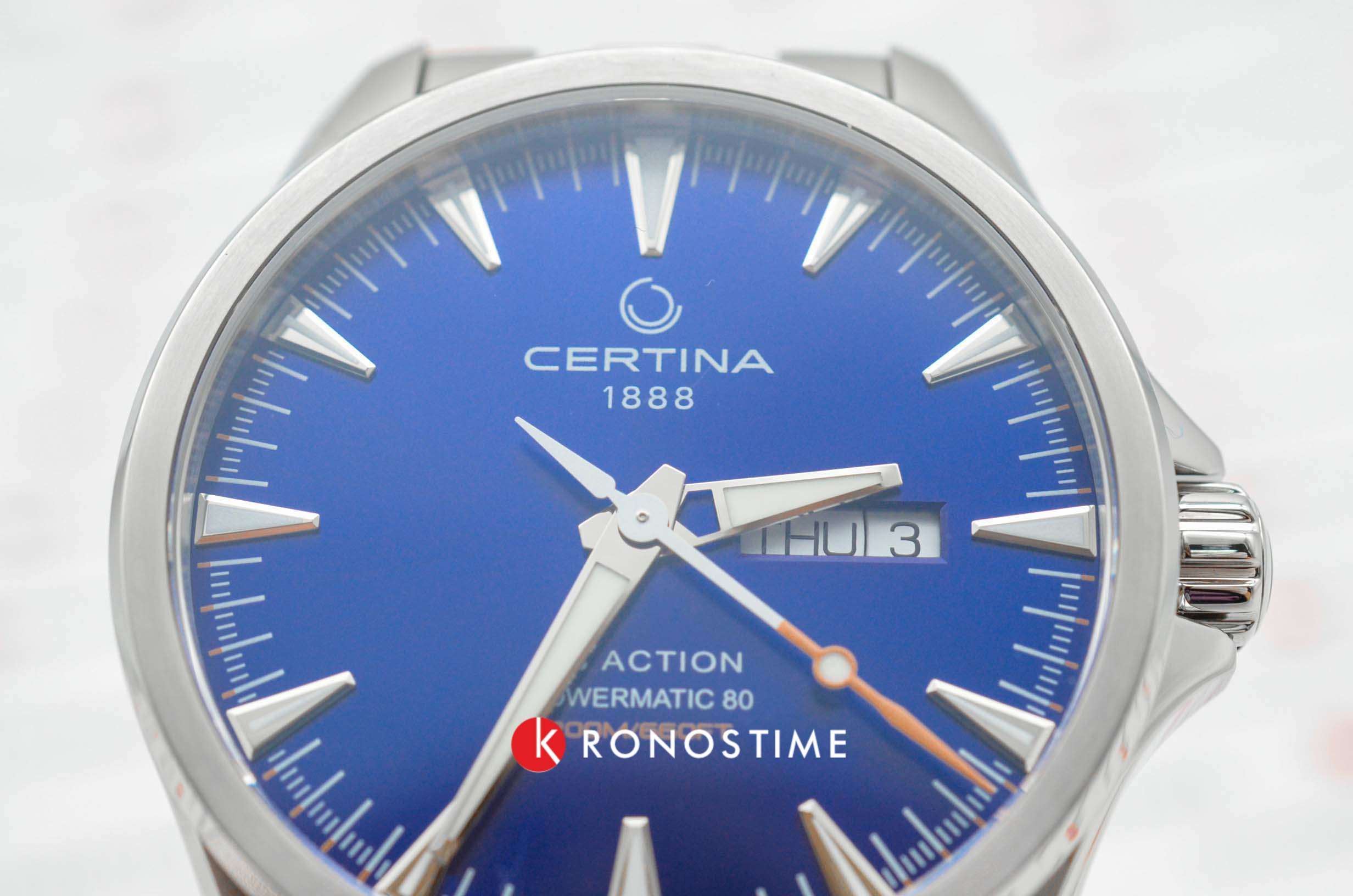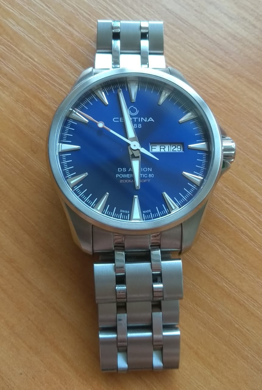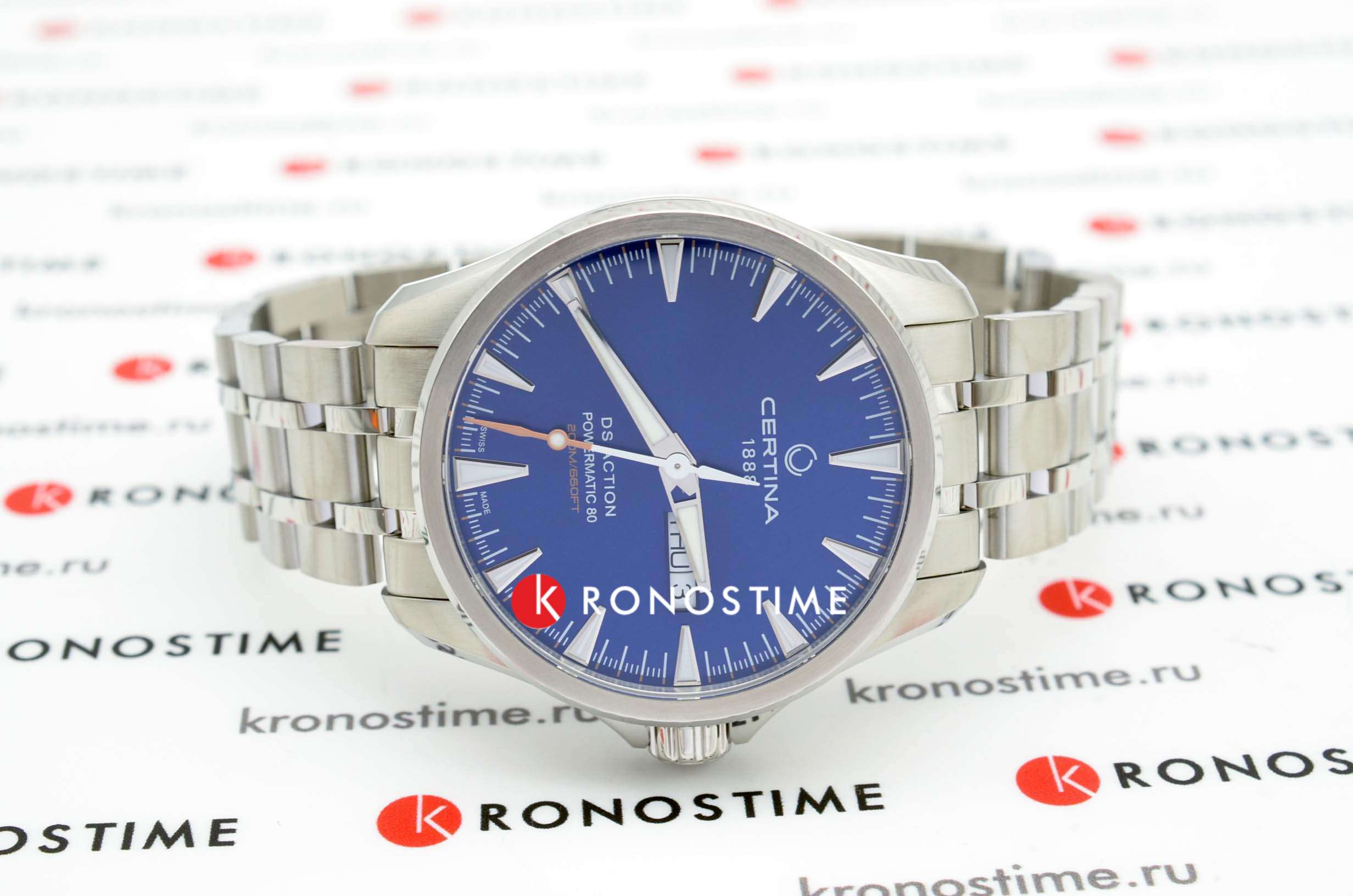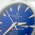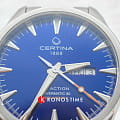 Брендовая модель имеет синий циферблат с контрастными стрелками и часовой разметкой, что обеспечивает хорошую читаемость показателей в любых условиях. Стальной браслет надёжно обхватывает запястье, а предотвращает случайное расстёгивание. Часы работают за счёт швейцарского пружинного механизма ETA Powermatic 80Powermatic 80Эксклюзивный калибр от швейцарской компании ETA с увеличенным запасом хода до 80 часов за счёт удлинённой заводной пружины. Характеризуется улучшенной системой спуска со сниженным трением., его запас хода увеличен до 80 часов. Соблюдение DS ConceptDS ConceptDouble Security Concept, обозначает двойную надёжность и безупречную точность часов Certina. Двойная система защиты подразумевает обеспечение максимальной устойчивости к ударам и высоких показателей водонепроницаемости.. Корпус из нержавеющей стали 316L. Стекло из сапфира с покрытием «антиблик». Водостойкость 200 метров. Подсветка SuperLumiNovaЛюминесцентное покрытиеПозволяет считывать показания времени в темноте. Производители наносят на стрелки, часовые индексы, безель или поверхность циферблата светонакопительный состав, дающий холодное свечение.. Завинчивающаяся задняя крышка. Защищённая заводная головка. Календарь с индикацией числа и дня недели. Диаметр корпуса: 41 мм.