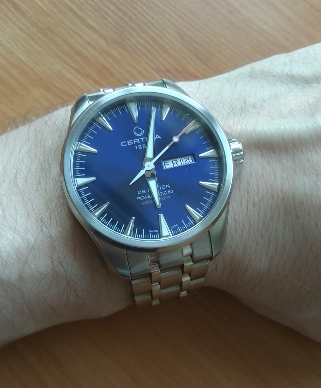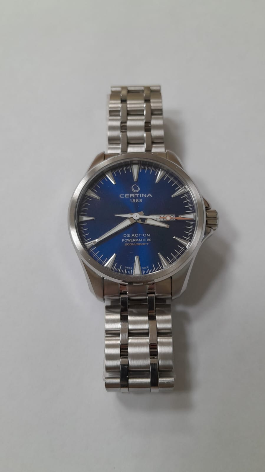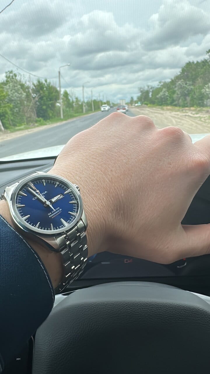 Брендовая модель имеет синий циферблат с контрастными стрелками и часовой разметкой, что обеспечивает хорошую читаемость показателей в любых условиях. Стальной браслет надёжно обхватывает запястье, а предотвращает случайное расстёгивание. Часы работают за счёт швейцарского пружинного механизма ETA Powermatic 80Powermatic 80Эксклюзивный калибр от швейцарской компании ETA с увеличенным запасом хода до 80 часов за счёт удлинённой заводной пружины. Характеризуется улучшенной системой спуска со сниженным трением., его запас хода увеличен до 80 часов. Соблюдение DS ConceptDS ConceptDouble Security Concept, обозначает двойную надёжность и безупречную точность часов Certina. Двойная система защиты подразумевает обеспечение максимальной устойчивости к ударам и высоких показателей водонепроницаемости.. Корпус из нержавеющей стали 316L. Стекло из сапфира с покрытием «антиблик». Водостойкость 200 метров. Подсветка SuperLumiNovaЛюминесцентное покрытиеПозволяет считывать показания времени в темноте. Производители наносят на стрелки, часовые индексы, безель или поверхность циферблата светонакопительный состав, дающий холодное свечение.. Завинчивающаяся задняя крышка. Защищённая заводная головка. Календарь с индикацией числа и дня недели. Диаметр корпуса: 41 мм.