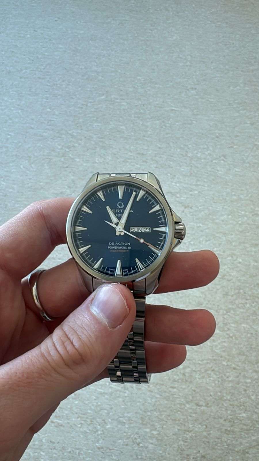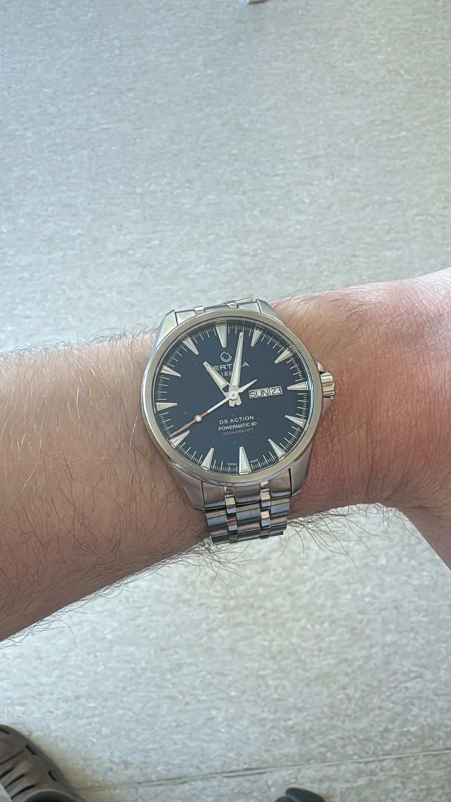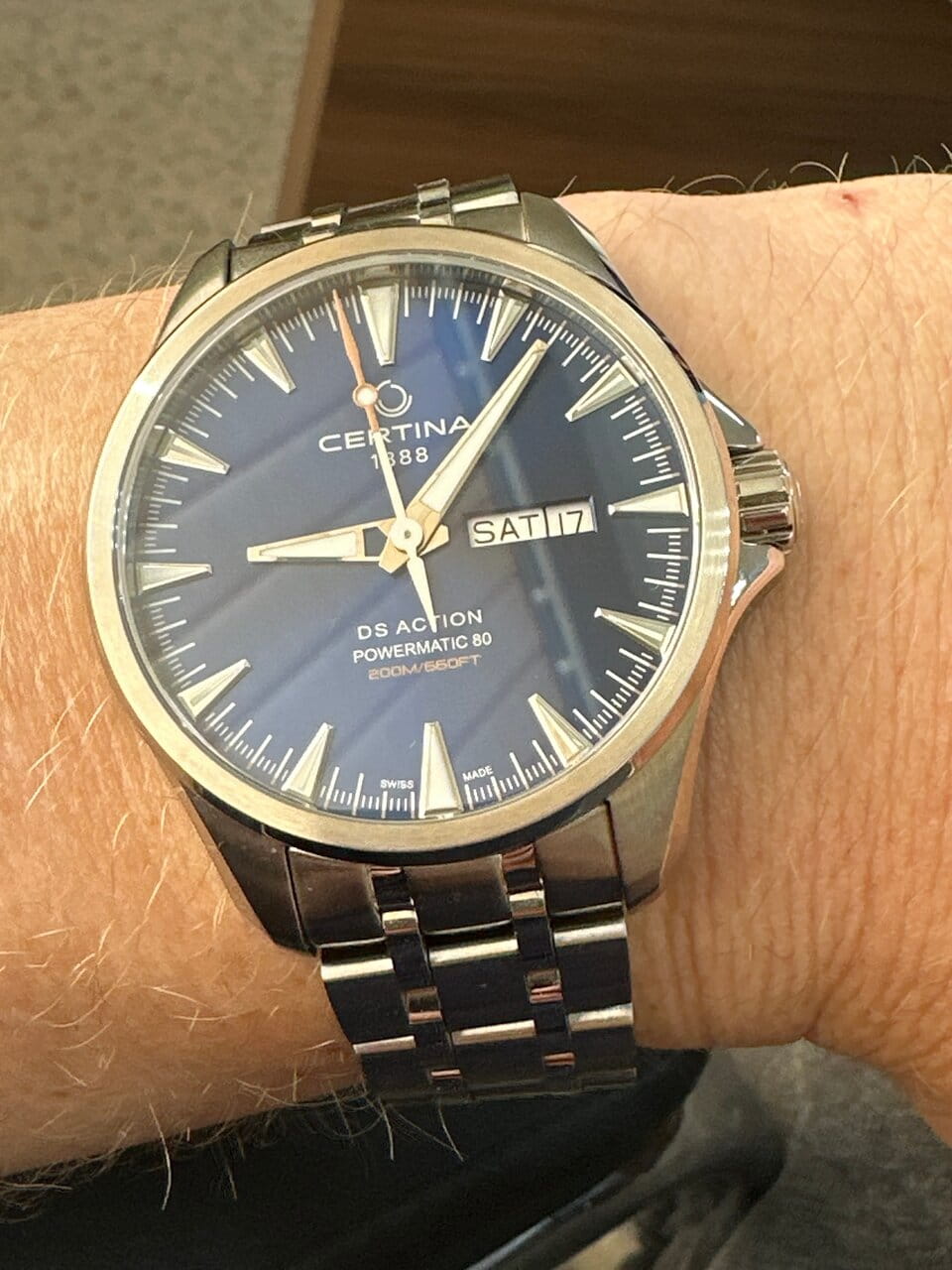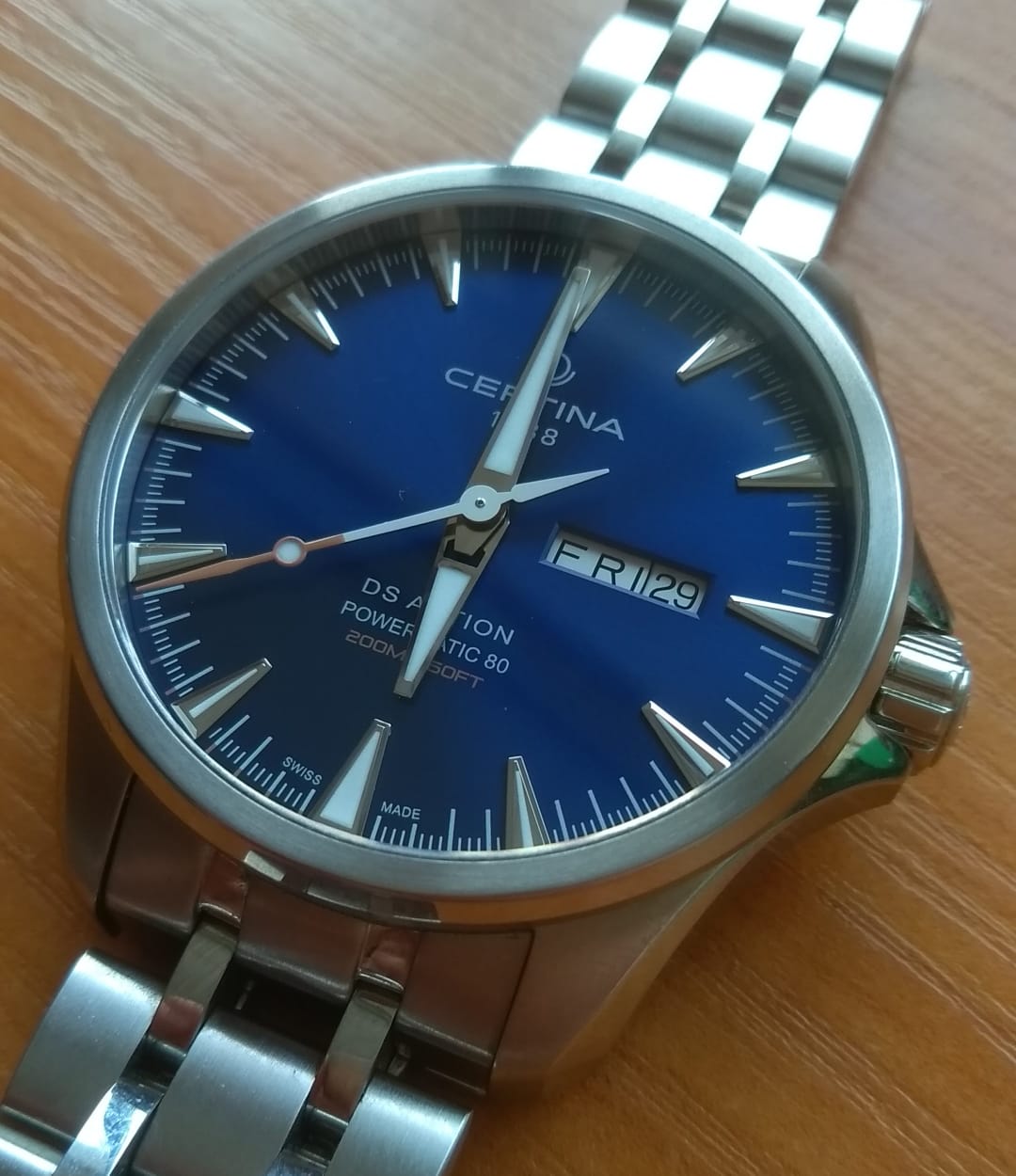 Брендовая модель имеет синий циферблат с контрастными стрелками и часовой разметкой, что обеспечивает хорошую читаемость показателей в любых условиях. Стальной браслет надёжно обхватывает запястье, а предотвращает случайное расстёгивание. Часы работают за счёт швейцарского пружинного механизма ETA Powermatic 80Powermatic 80Эксклюзивный калибр от швейцарской компании ETA с увеличенным запасом хода до 80 часов за счёт удлинённой заводной пружины. Характеризуется улучшенной системой спуска со сниженным трением., его запас хода увеличен до 80 часов. Соблюдение DS ConceptDS ConceptDouble Security Concept, обозначает двойную надёжность и безупречную точность часов Certina. Двойная система защиты подразумевает обеспечение максимальной устойчивости к ударам и высоких показателей водонепроницаемости.. Корпус из нержавеющей стали 316L. Стекло из сапфира с покрытием «антиблик». Водостойкость 200 метров. Подсветка SuperLumiNovaЛюминесцентное покрытиеПозволяет считывать показания времени в темноте. Производители наносят на стрелки, часовые индексы, безель или поверхность циферблата светонакопительный состав, дающий холодное свечение.. Завинчивающаяся задняя крышка. Защищённая заводная головка. Календарь с индикацией числа и дня недели. Диаметр корпуса: 41 мм.