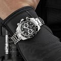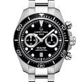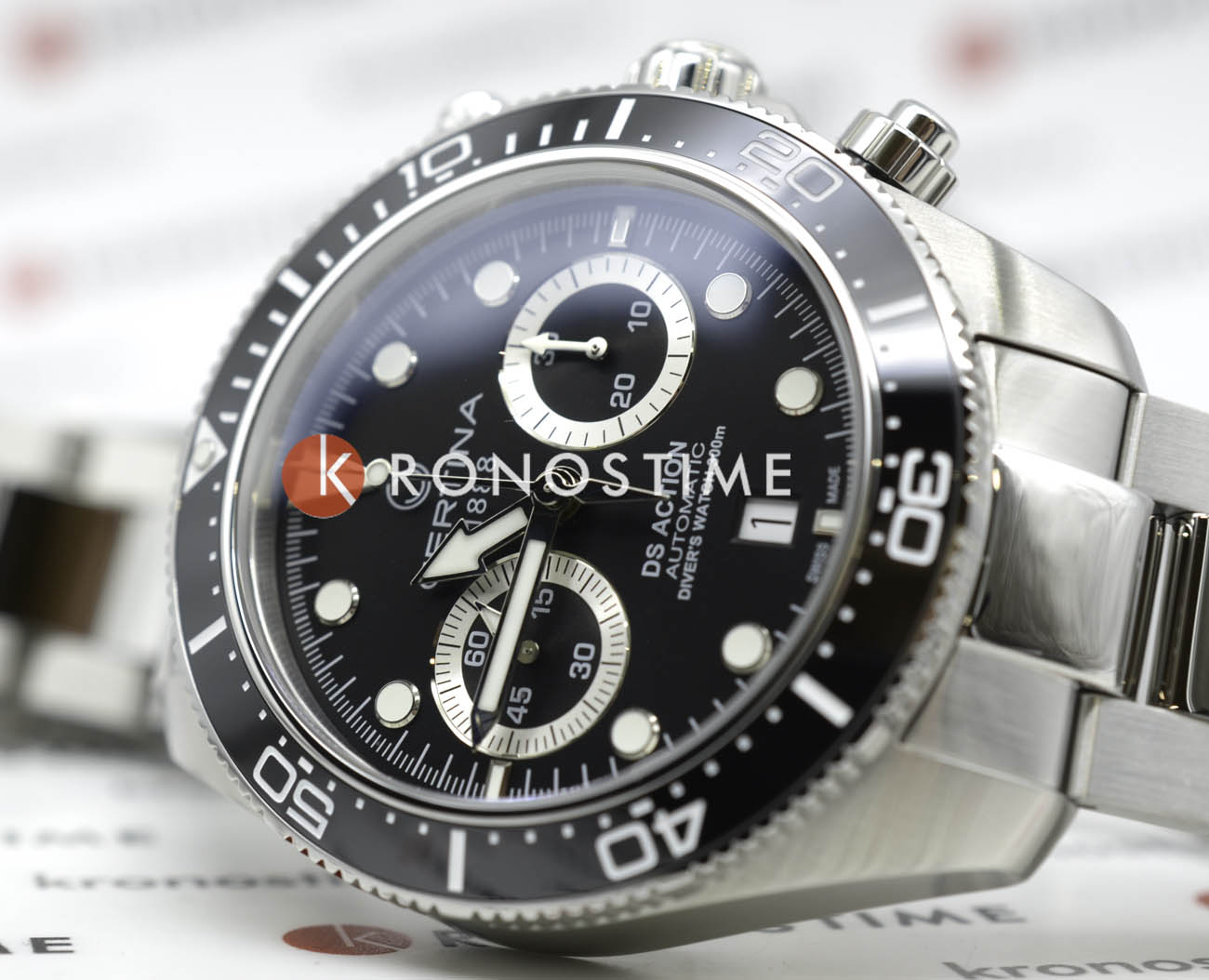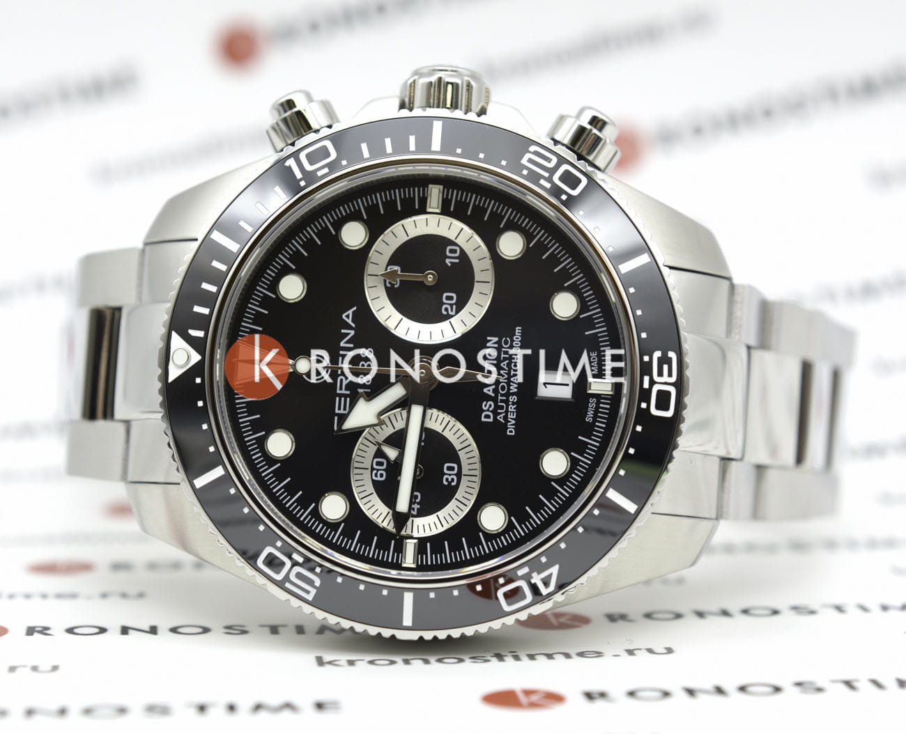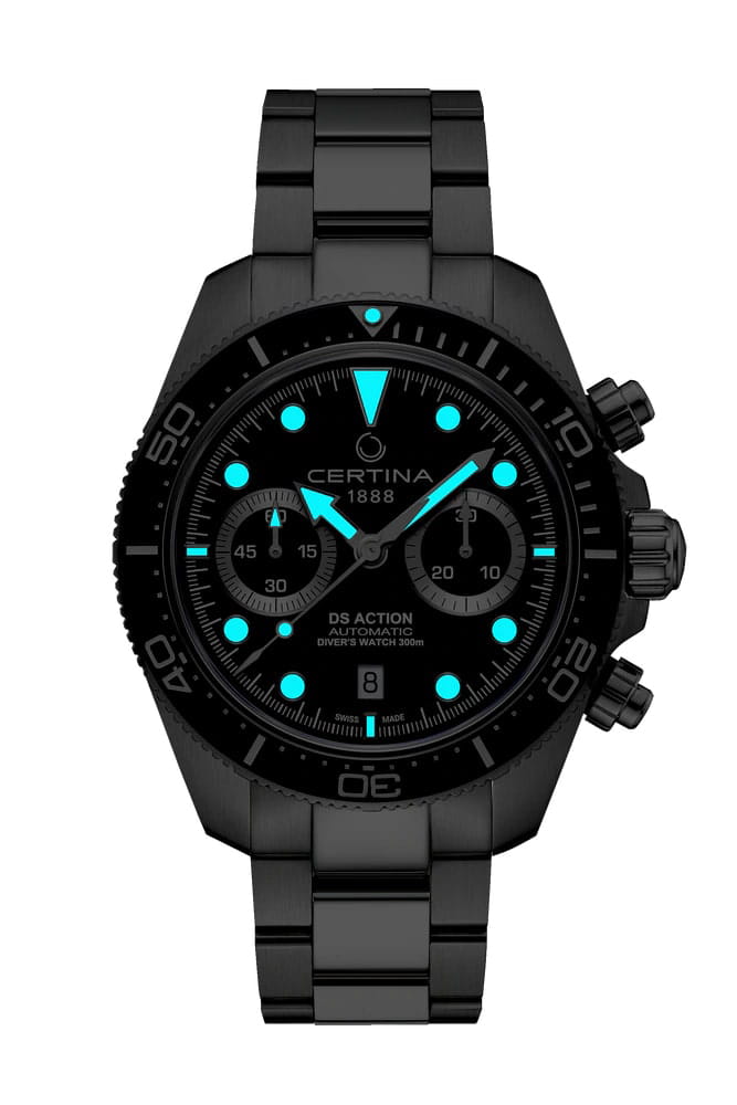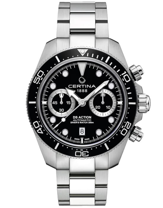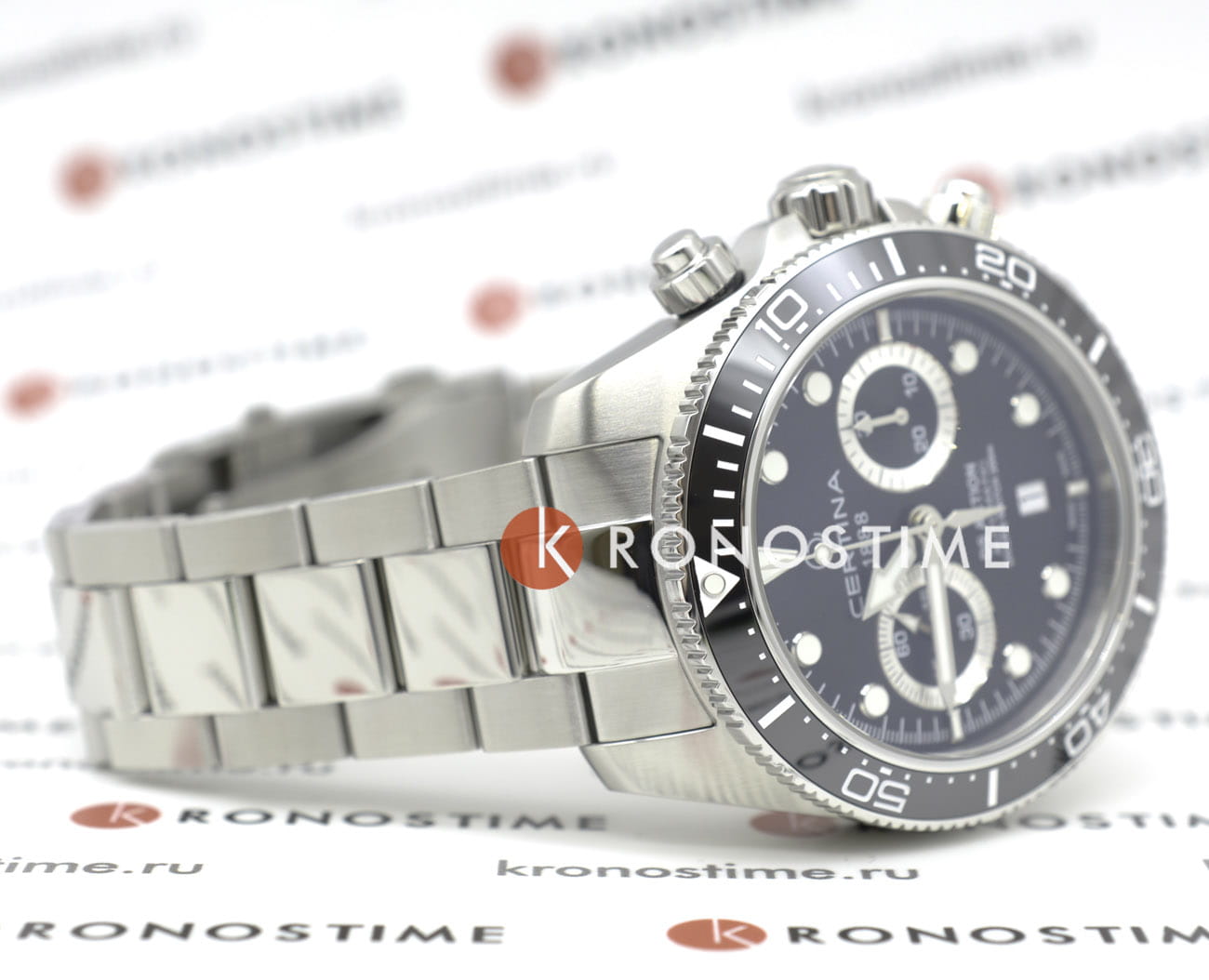Швейцарские мужские механические часы Certina DS Action Diver Chrono C032.827.11.051.00 из коллекции DS Action – безупречно точный и впечатляюще надёжный аксессуар. Габаритный хронографХронографФункция позволяет измерять отрезки времени с особой точностью: часы, минуты, секунды. Верным признаком хронографа является наличие на циферблате 3 дополнительных окошек-счётчиков. с циферблатом выгодно подчеркнёт повседневный или деловой образ. Модель соответствует стандарту ISO 6425 для дайверских часов и может похвастаться повышенной водостойкостью до 30 бар. Заводная головка, кнопки и задняя крышка завинчиваются для дополнительной герметичности. Аксессуар позволит вам чувствовать себя на высоте и в воде, и на суше. Сапфировое стеклоСапфировое стеклоПрочный и надёжный материал из кристалла сапфира синтетического происхождения, характеризующийся особой твёрдостью и устойчивостью к царапинам и повреждениям. с двухсторонней антибликовой обработкой. Керамический вращающийся безельБезельВнешний ободок, закрепляющий стекло. В спортивных часах так называется поворотное кольцо с делениями на циферблате, выполняет роль таймера – замеряет отрезки времени на шкале. Неподвижный безель – элемент декора. Однонаправленно вращающийся безель на дайверских часах позволяет фиксировать моменты погружения и выныривания на поверхность.. Корпус из нержавеющей стали 316L. Люминесцентная подсветкаЛюминесцентное покрытиеПозволяет считывать показания времени в темноте. Производители наносят на стрелки, часовые индексы, безель или поверхность циферблата светонакопительный состав, дающий холодное свечение.. Календарь, секундомер. Стальной браслет на раскладной застёжкеРаскладная застёжкаТакой тип застёжки используется только на браслетах из металла. Она никогда не раскрывается полностью, происходит разделение на 2 и более частей. Раскладывающая застёжка снизит вероятность потери часов к минимуму.. Диаметр корпуса: 44,6 мм.