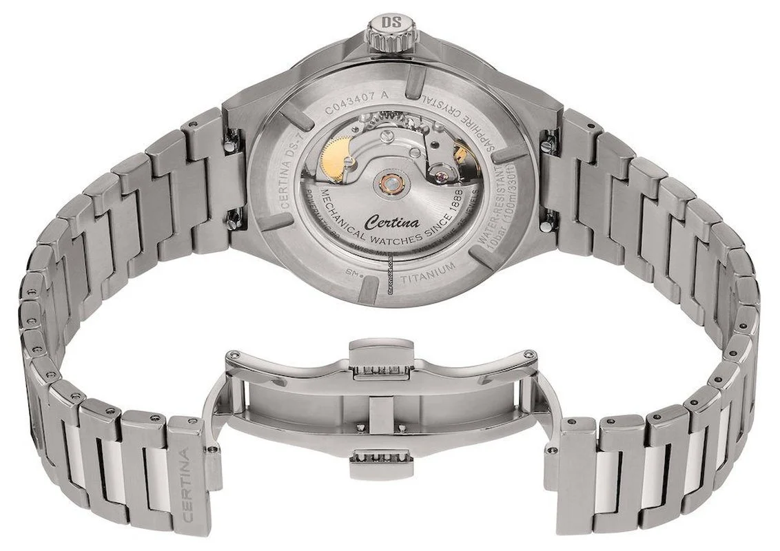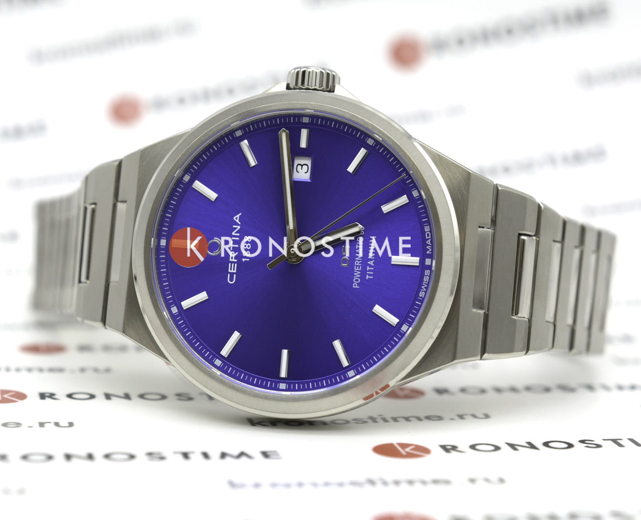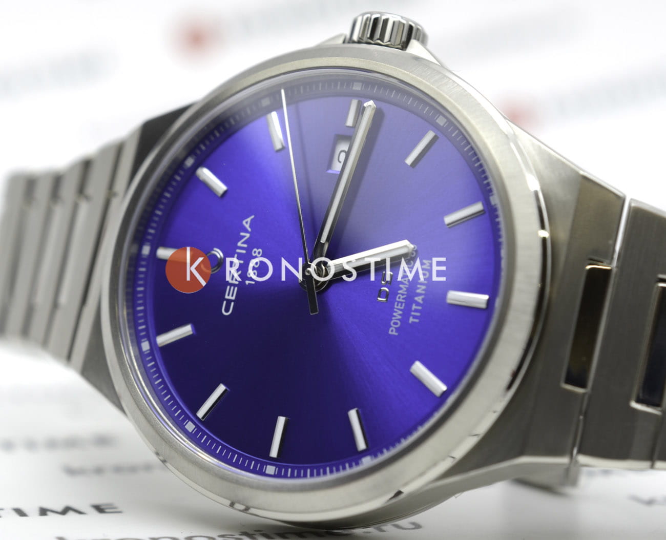 Certina DS-7 Powermatic Titanium 80 C043.407.44.041.00 – мужские часы для поклонников ярких аксессуаров. И корпус, и браслет изготовлены из высококачественной титанового сплава. Под твердым сапфировым стекломСапфировое стеклоПрочный и надёжный материал из кристалла сапфира синтетического происхождения, характеризующийся особой твёрдостью и устойчивостью к царапинам и повреждениям. с антибликовым покрытиемАнтибликовое покрытиеСлой оксида металла в 0,13-0,3 микрон, благодаря которому стекло часов не бликует и не отражает свет. Антибликовое покрытие уменьшает отражение света в 10 раз, обеспечивая отличную читаемость показателей циферблата. находится синий циферблат и на котором вы найдете окошко даты в положении 3 часа, а также маркировку, покрытую люминесцентным покрытиемЛюминесцентное покрытиеПозволяет считывать показания времени в темноте. Производители наносят на стрелки, часовые индексы, безель или поверхность циферблата светонакопительный состав, дающий холодное свечение. Super-LumiNova. Все это приводится в действие автоматическим механизмом Powermatic 80Powermatic 80Эксклюзивный калибр от швейцарской компании ETA с увеличенным запасом хода до 80 часов за счёт удлинённой заводной пружины. Характеризуется улучшенной системой спуска со сниженным трением..611 с пружиной Nivachron™Nivachron™Специально разработанный инновационный сплав Nivachron™ повышает устойчивость часов к воздействию магнитных полей.. Класс водозащиты: 100 метров, позволит плавать, нырять и заниматься другими водными видами спорта. Титановый браслет с на застёжке-бабочке с кнопкамиЗастёжка "бабочка"Такой вид застёжки дополняется предохранителями, помогающими избежать случайного раскрытия браслета. Обладают изящным исполнением. .